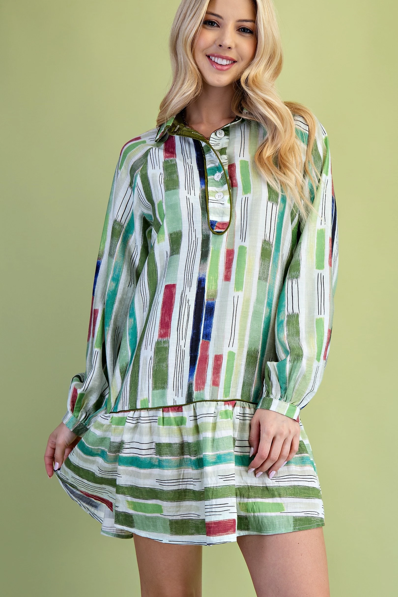 Abstract Striped Long Sleeve Popover Dress with Piping Details