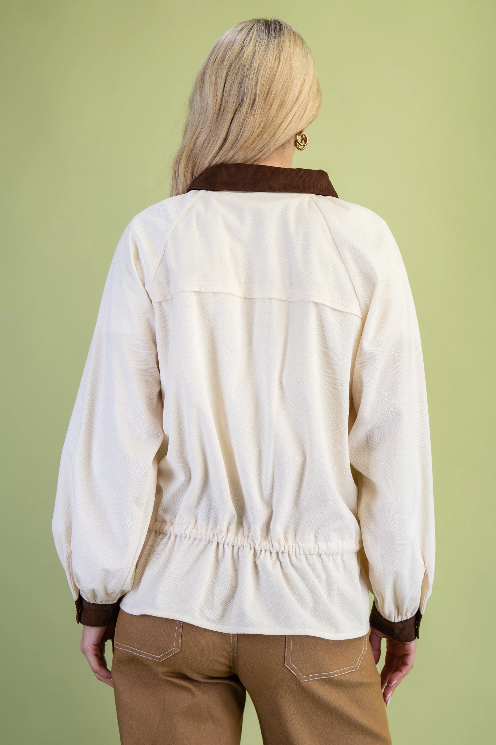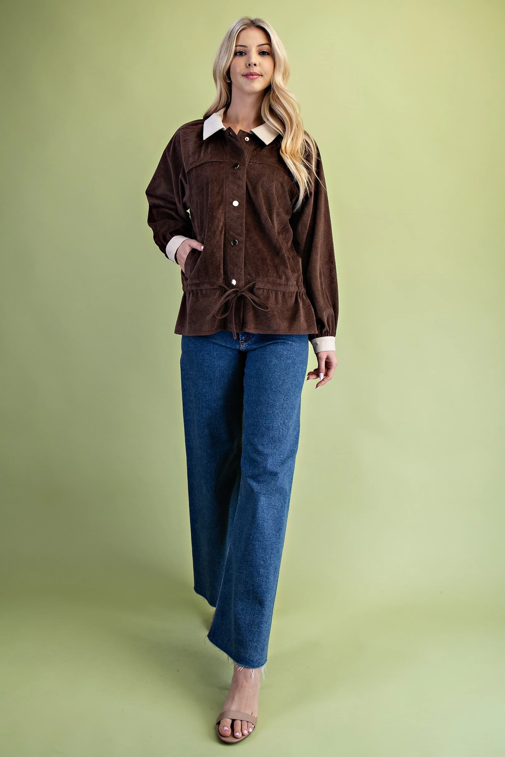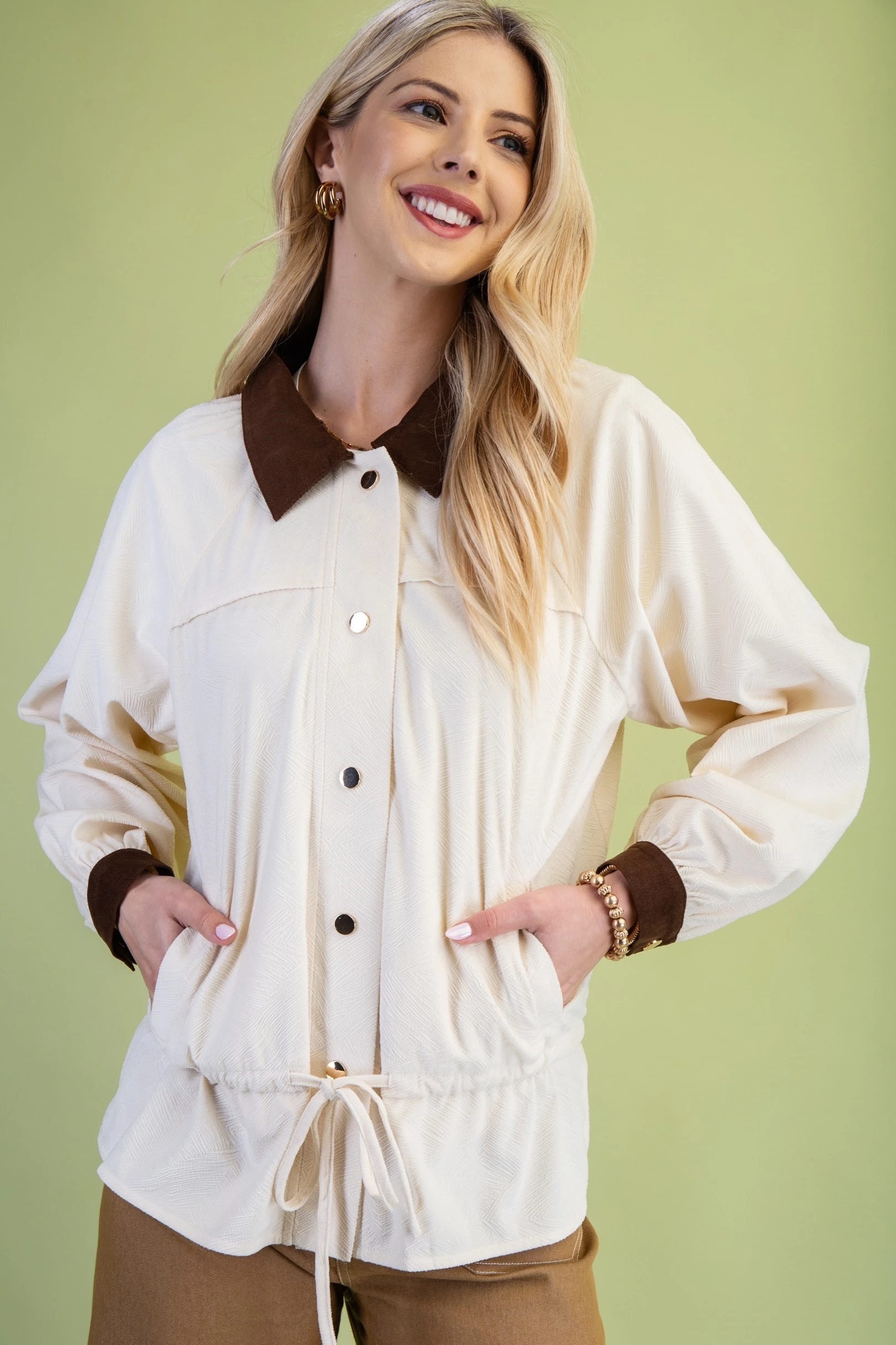 Textured Velveteen Snap-Front Color Blocked Jacket with An Adjustable Waist Tie