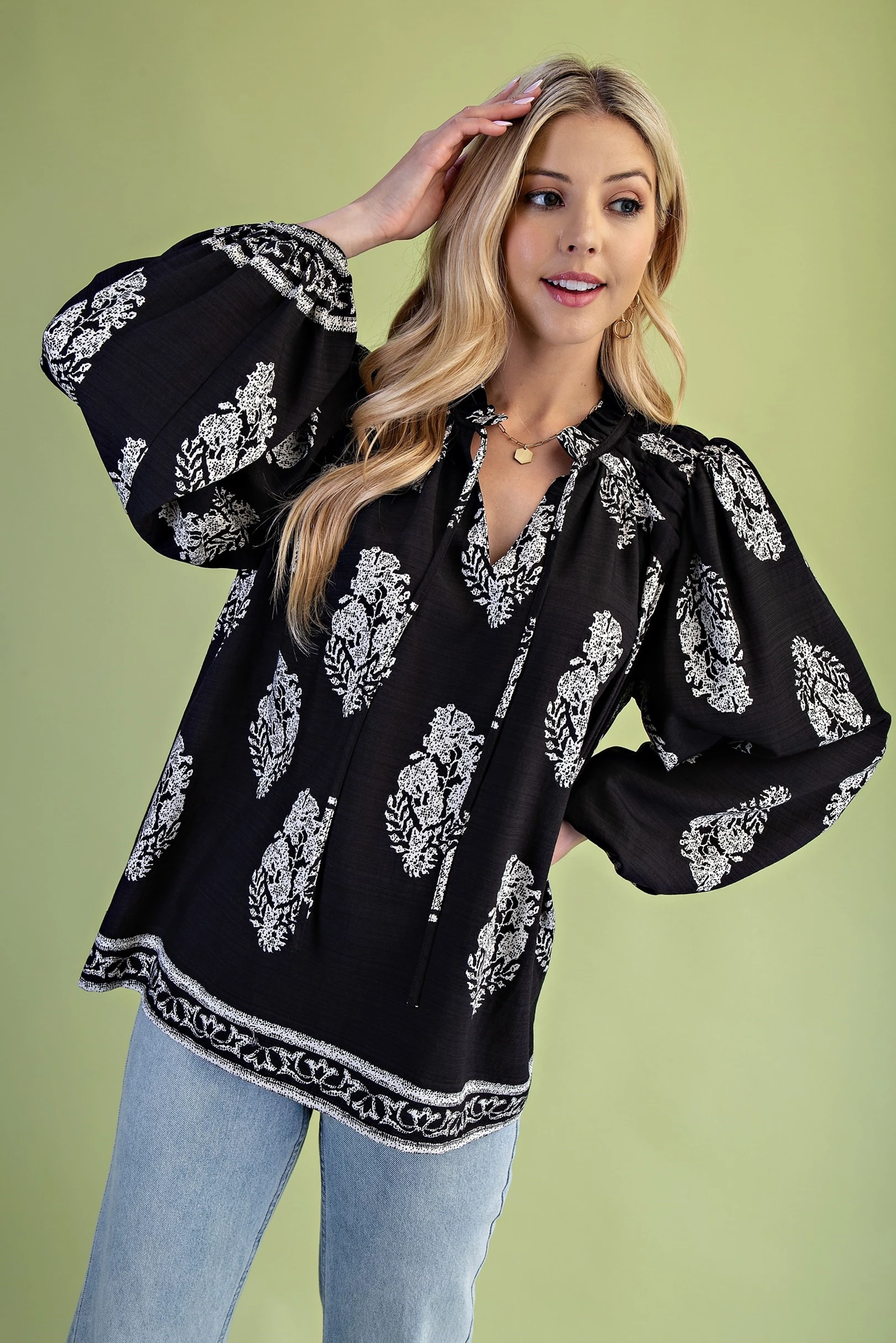 Printed Long Sleeve Top with Shirred Shoulders and a Tie Neck String