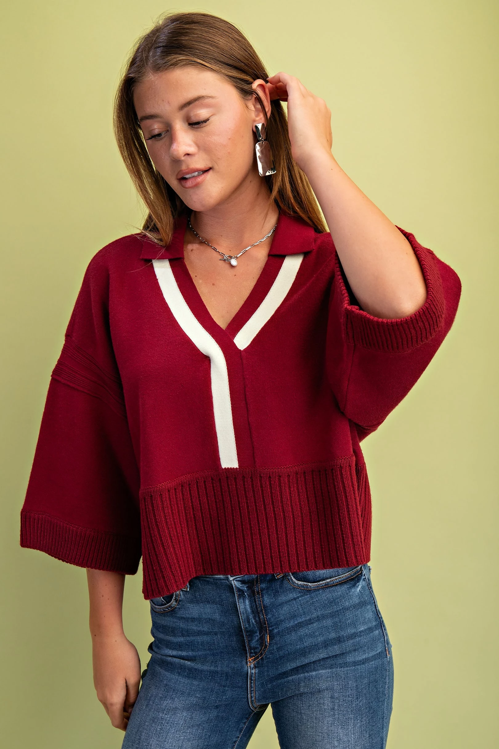 V-Neck Collared Sweater with a Contrasting Stripe and Ribbed Band Details