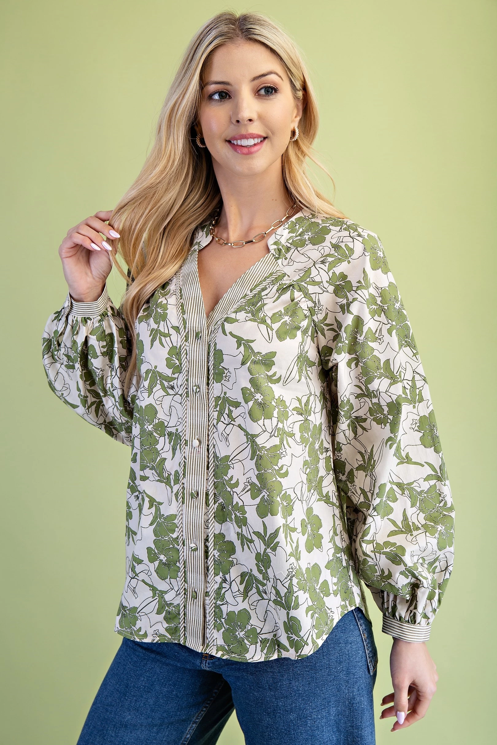 Floral Button Down V-Neck Blouse with Accent Fabric Details