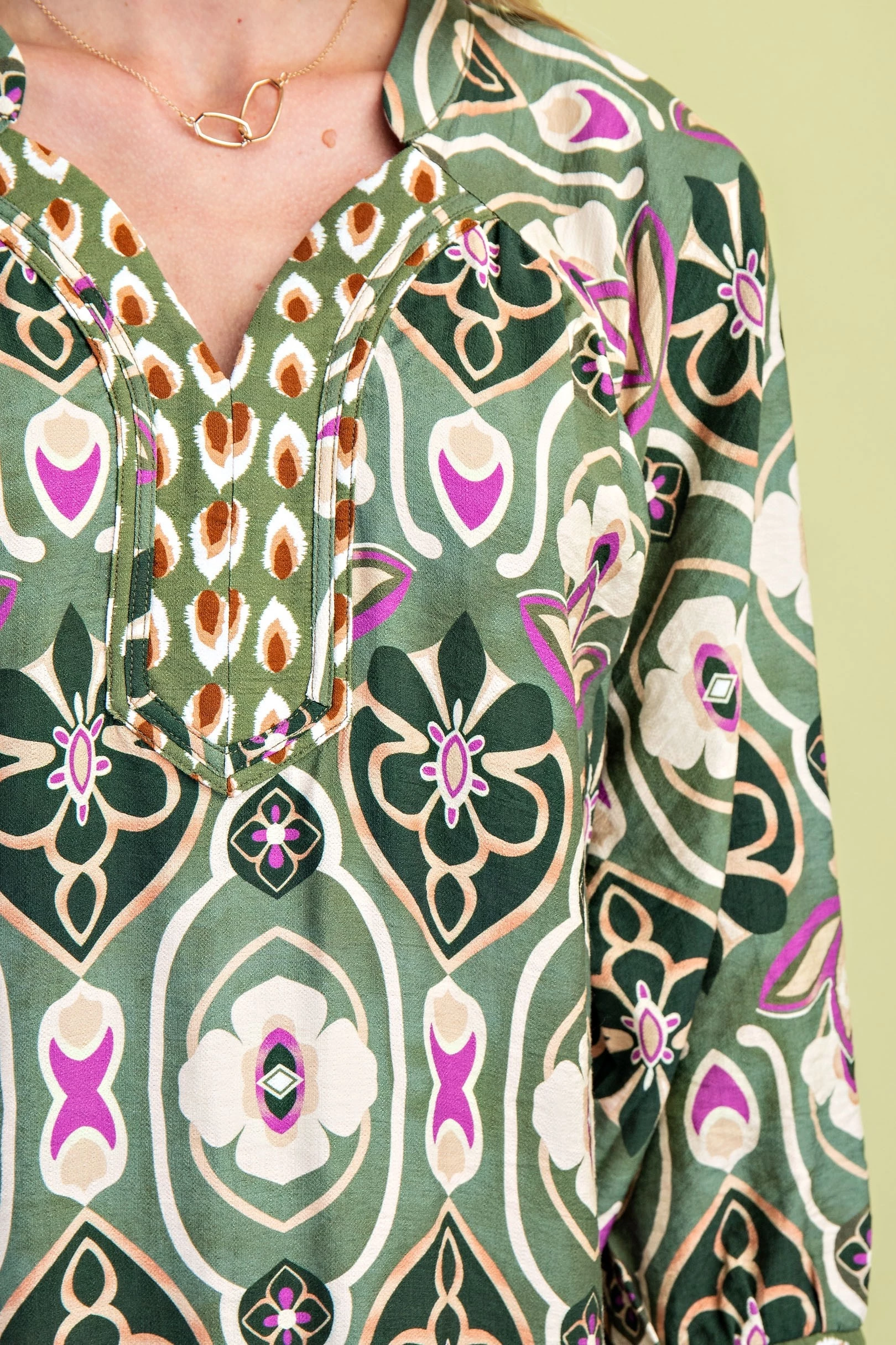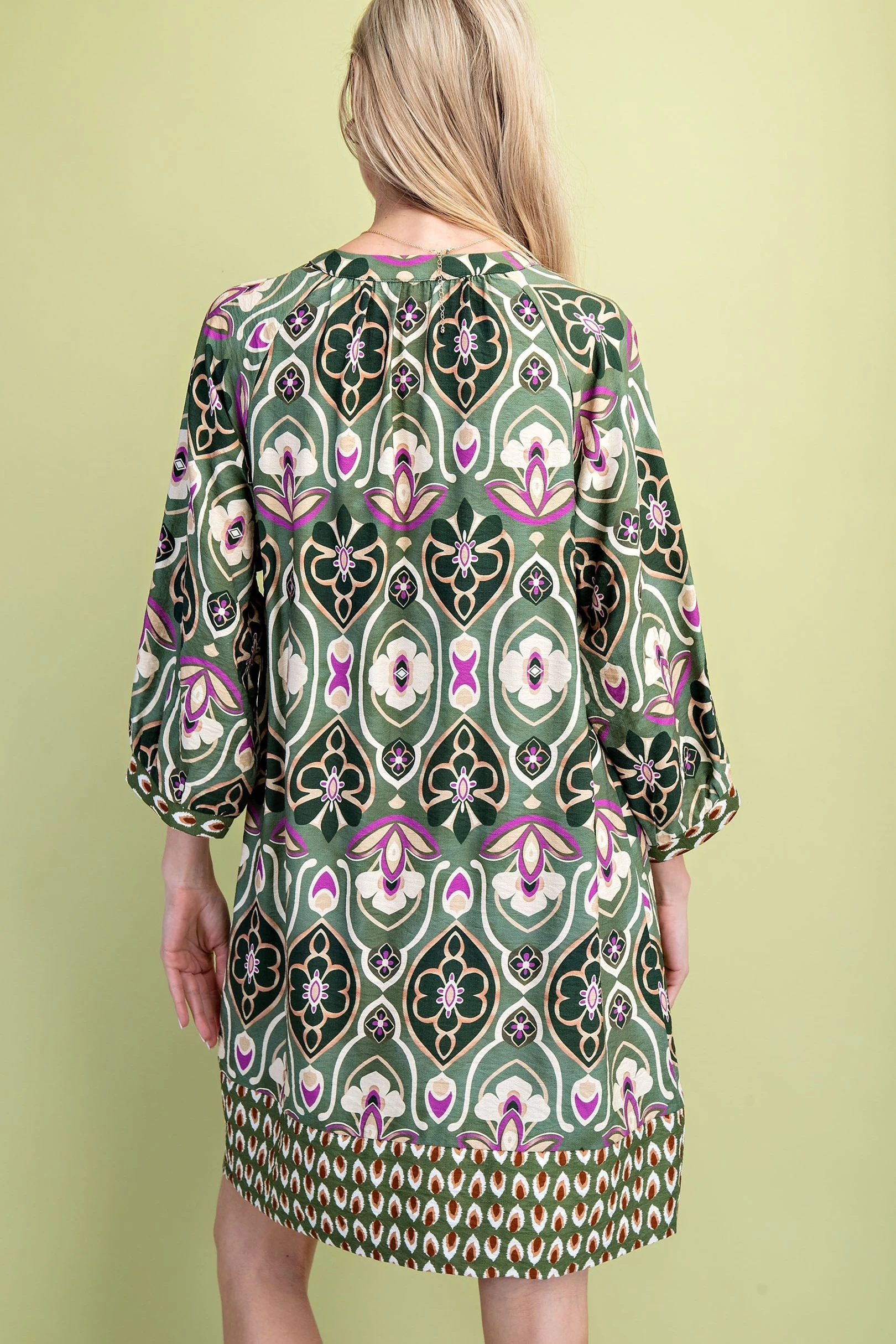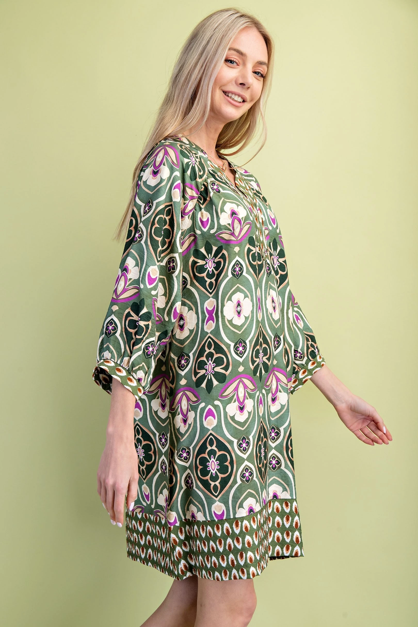 Mixed Print V-Neck Dress with 3/4 Length Sleeves