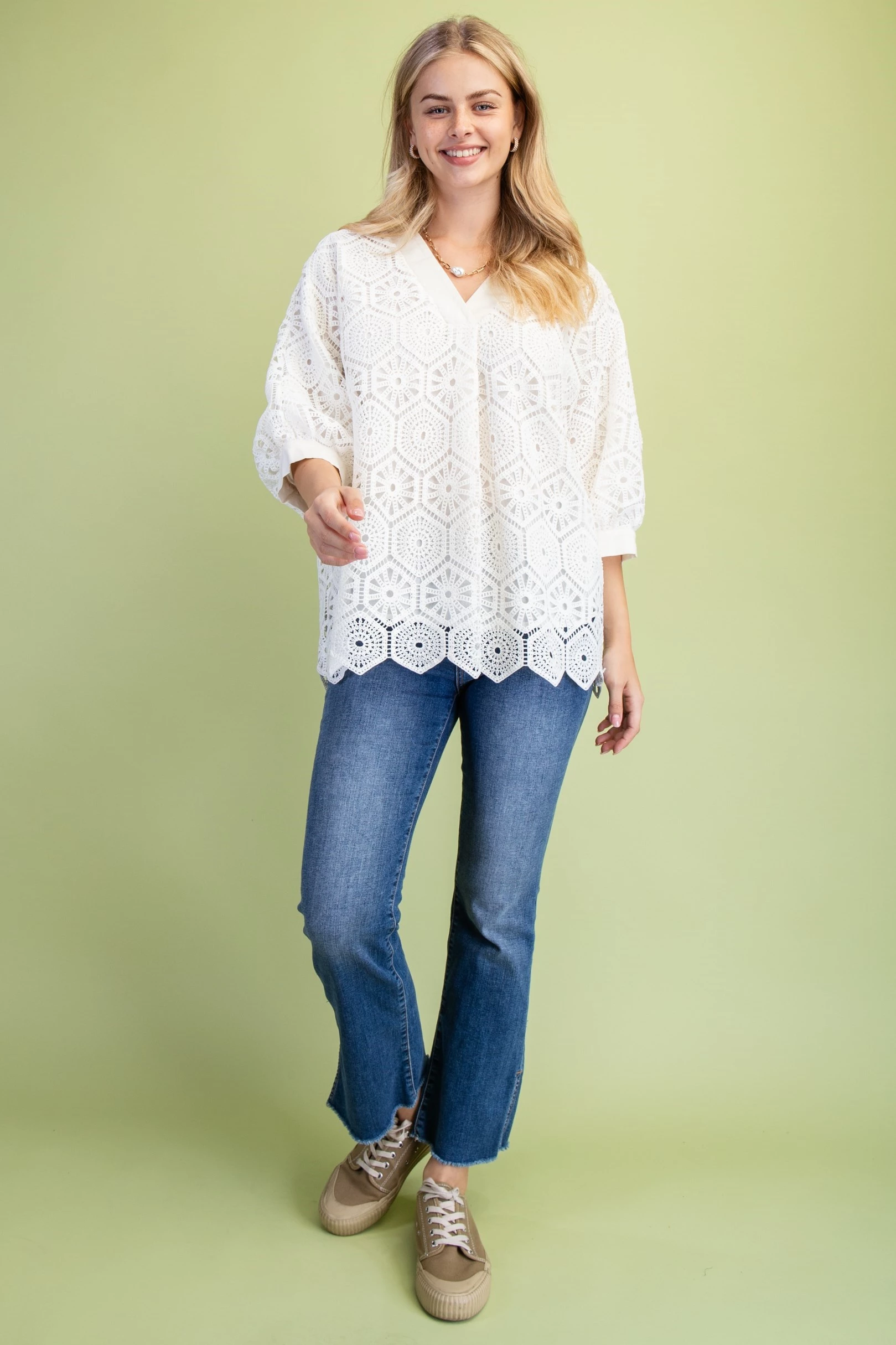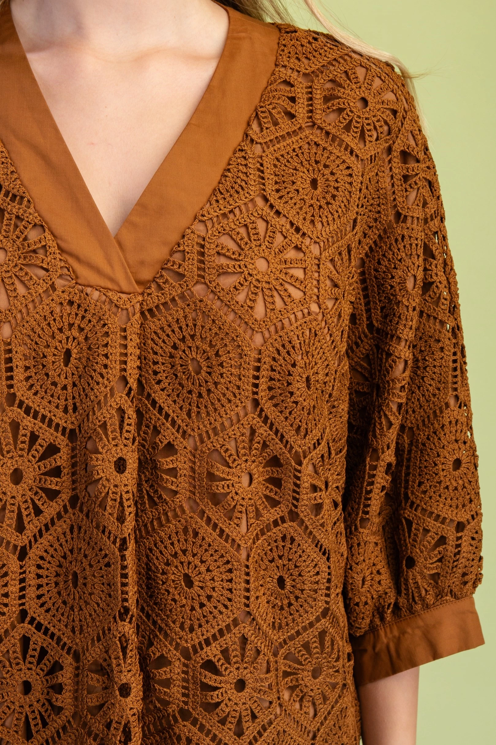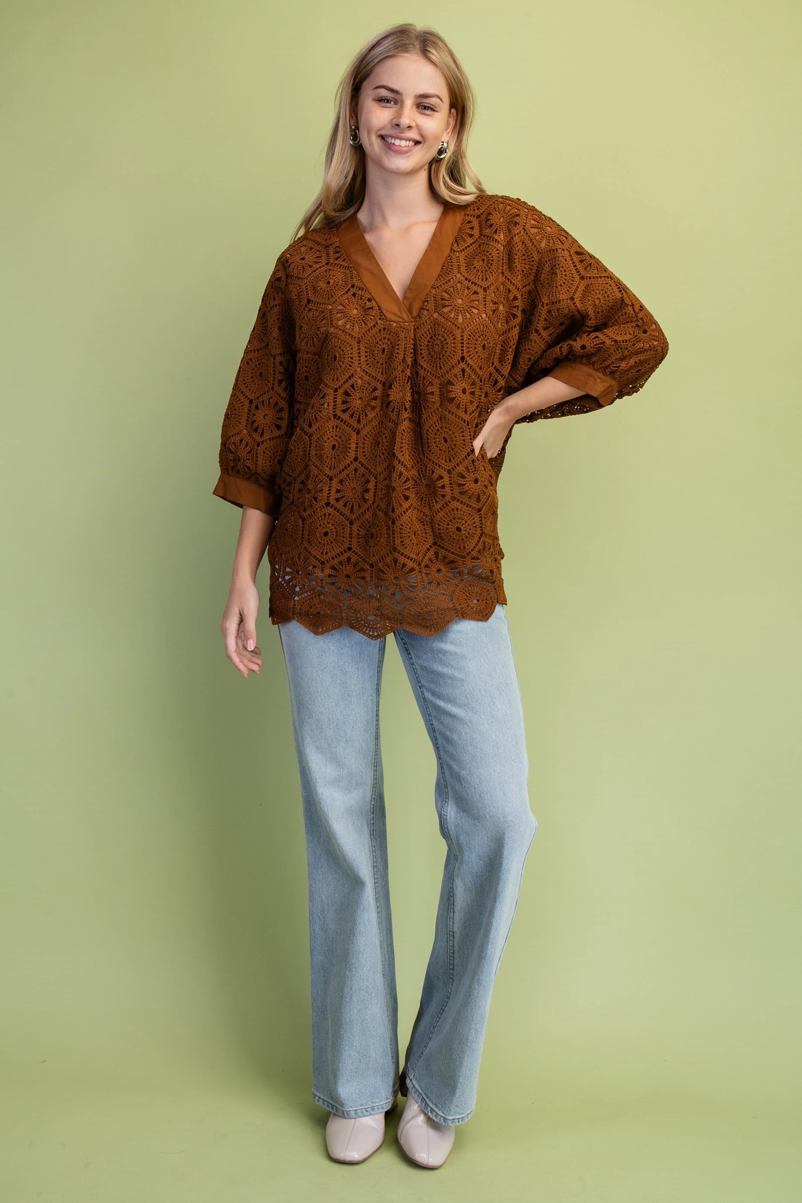 Crochet V-Neck Loose Fit Blouse. The Top is Lined