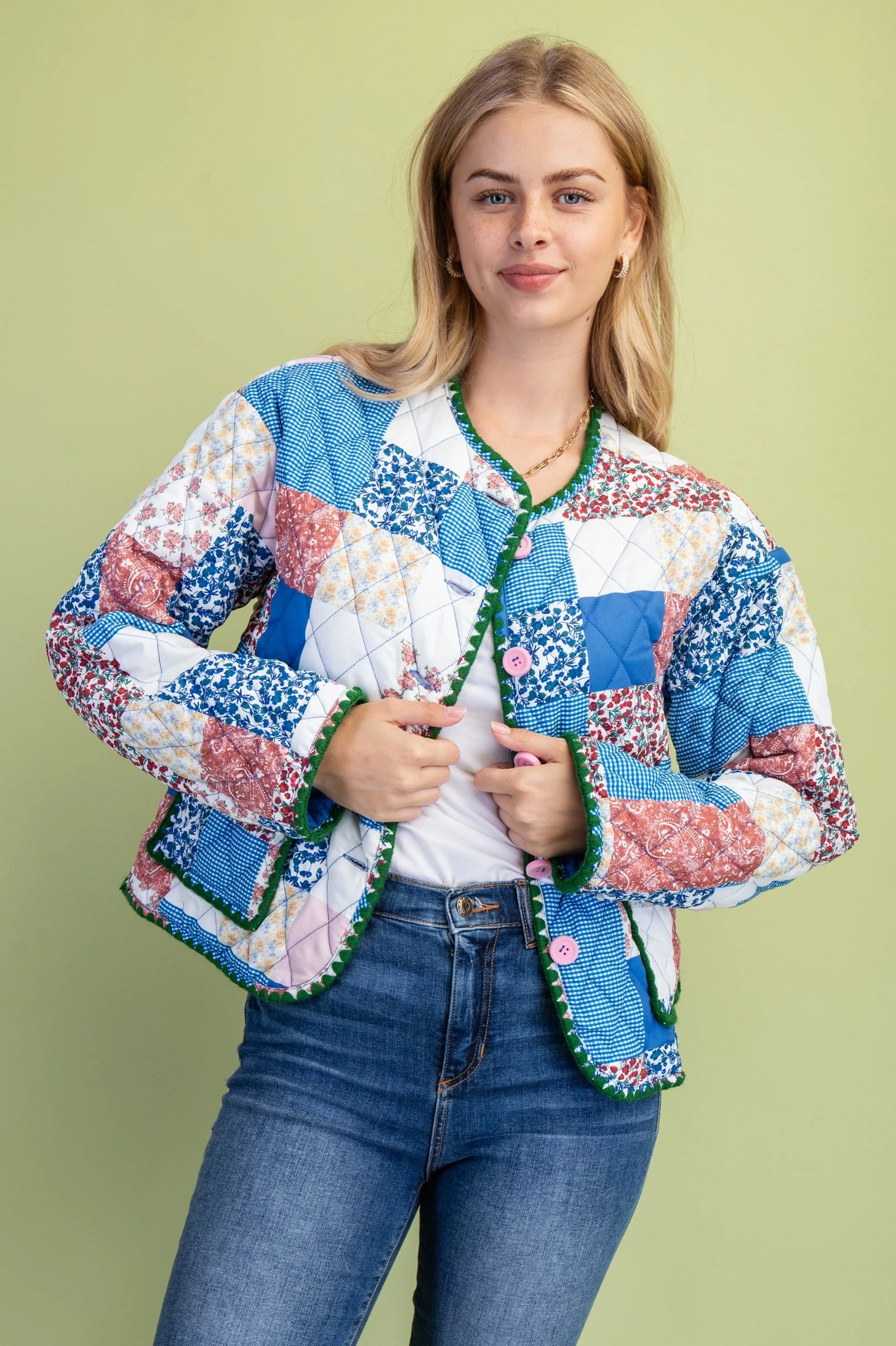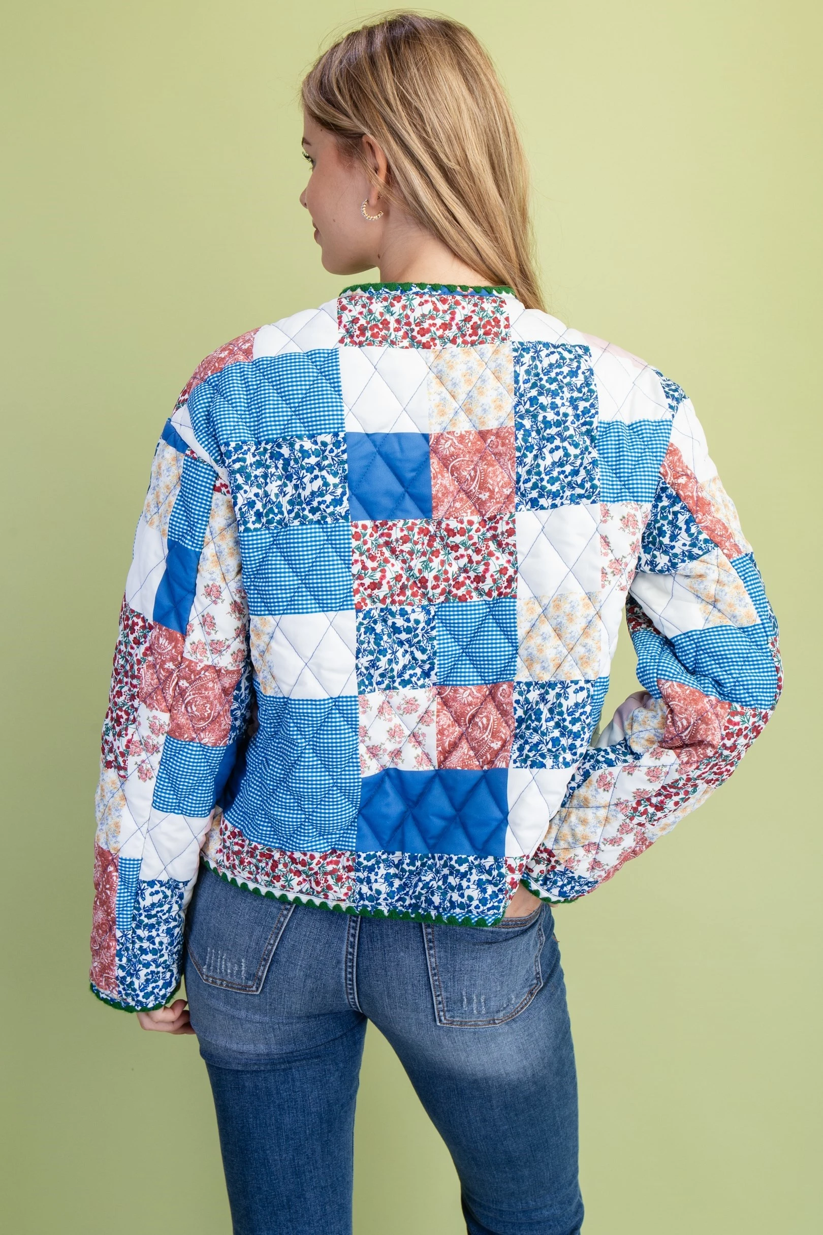 Mixed Patchwork Print Quilted Jacket with Stitching Details and Felt Buttons