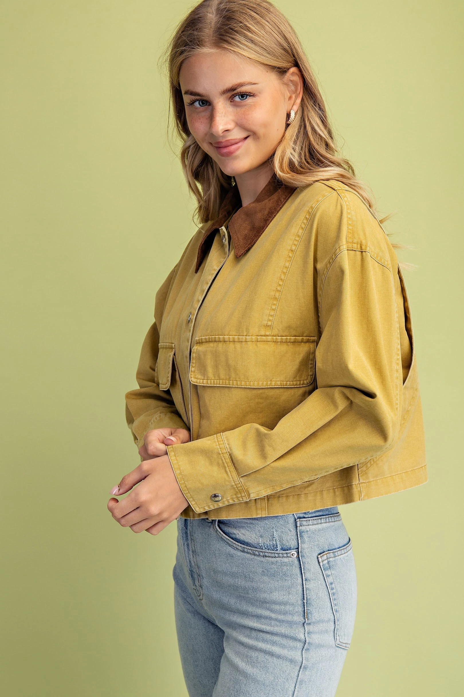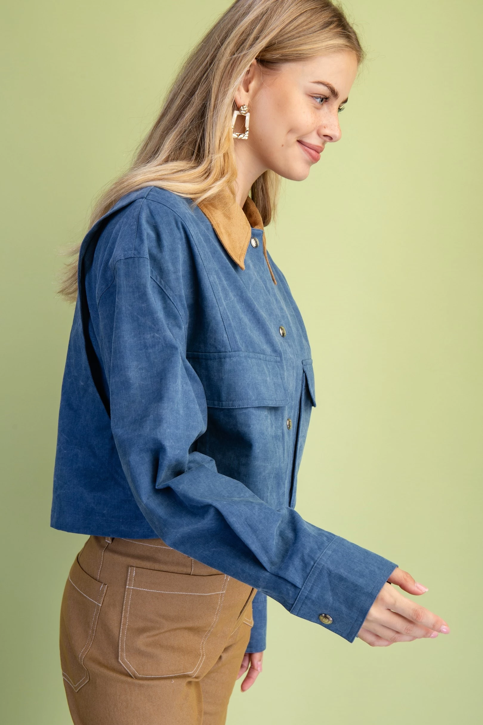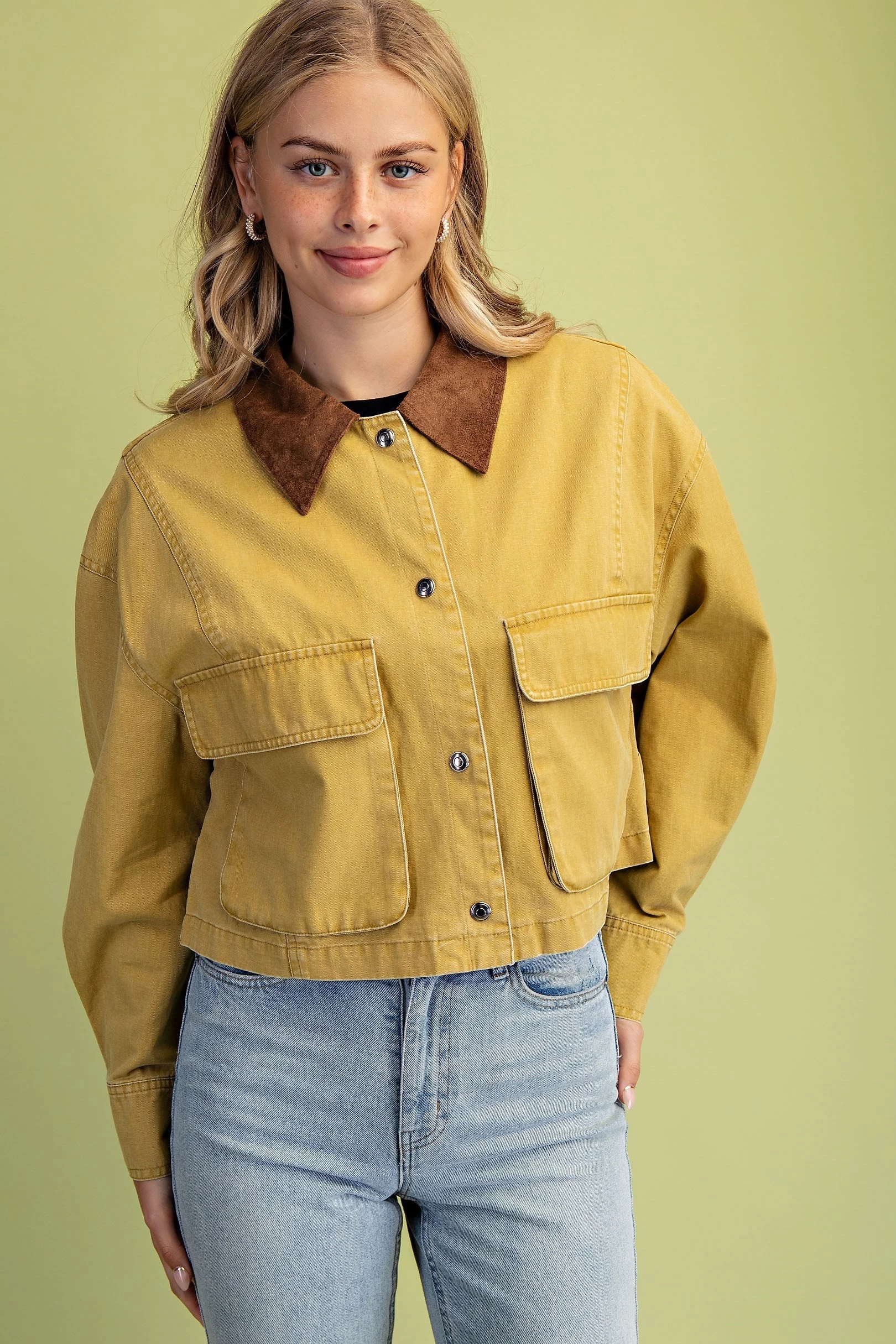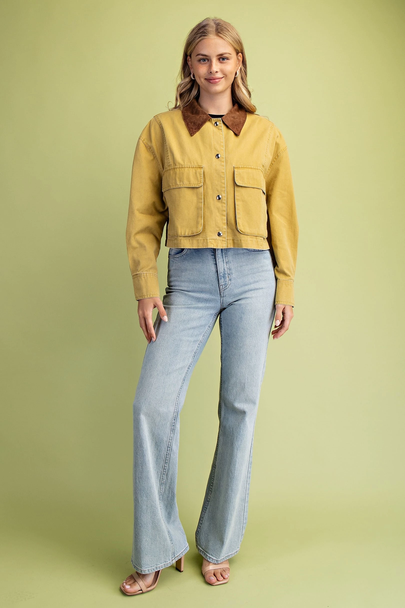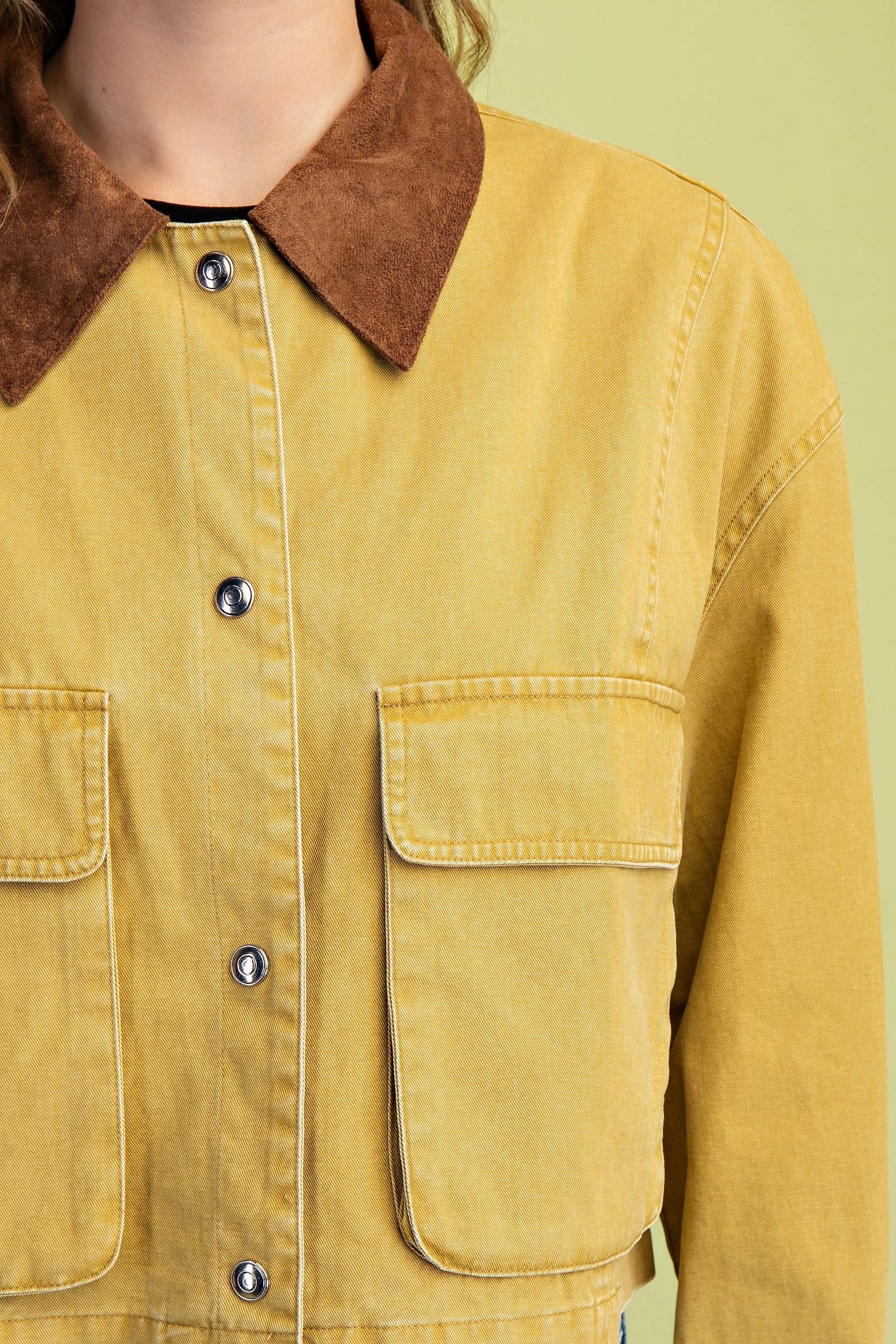 Snap Closure Jacket with a Suede Collar and Faux Back Pocket