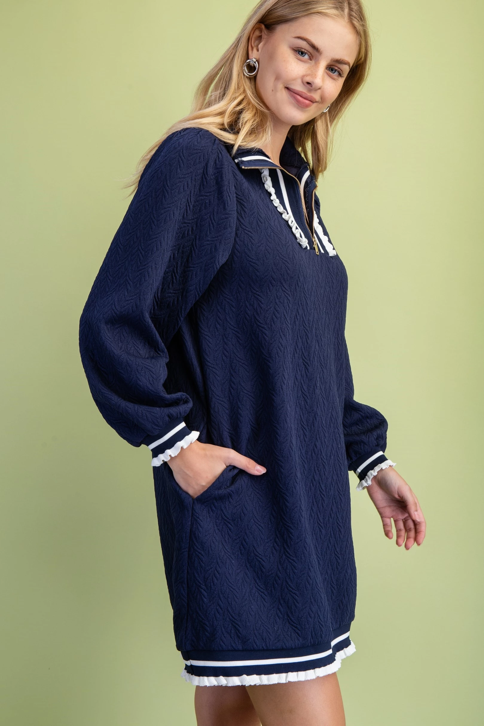 Textured Half Zip Dress with Ruffled Contrasting Stripe Details
