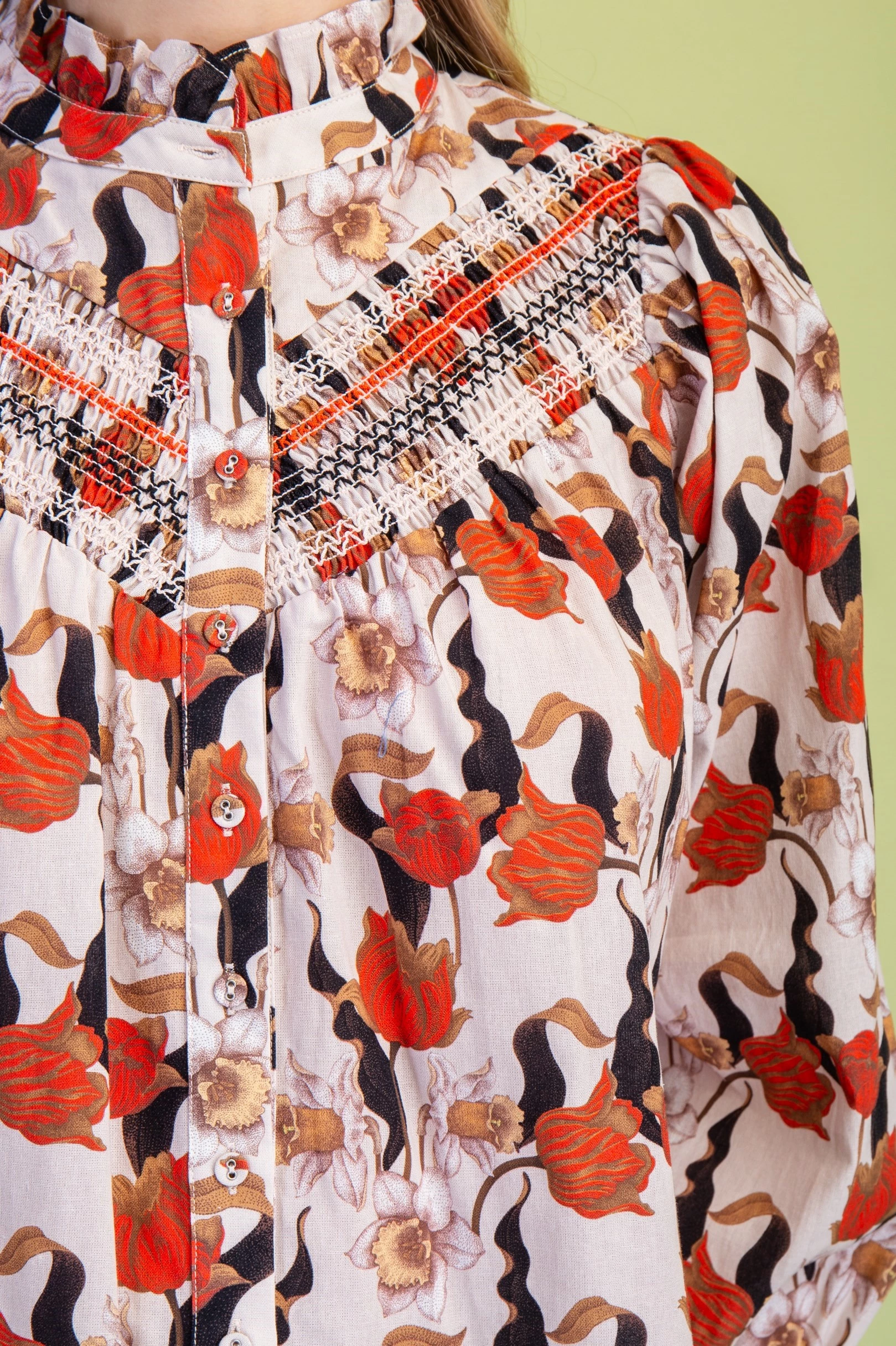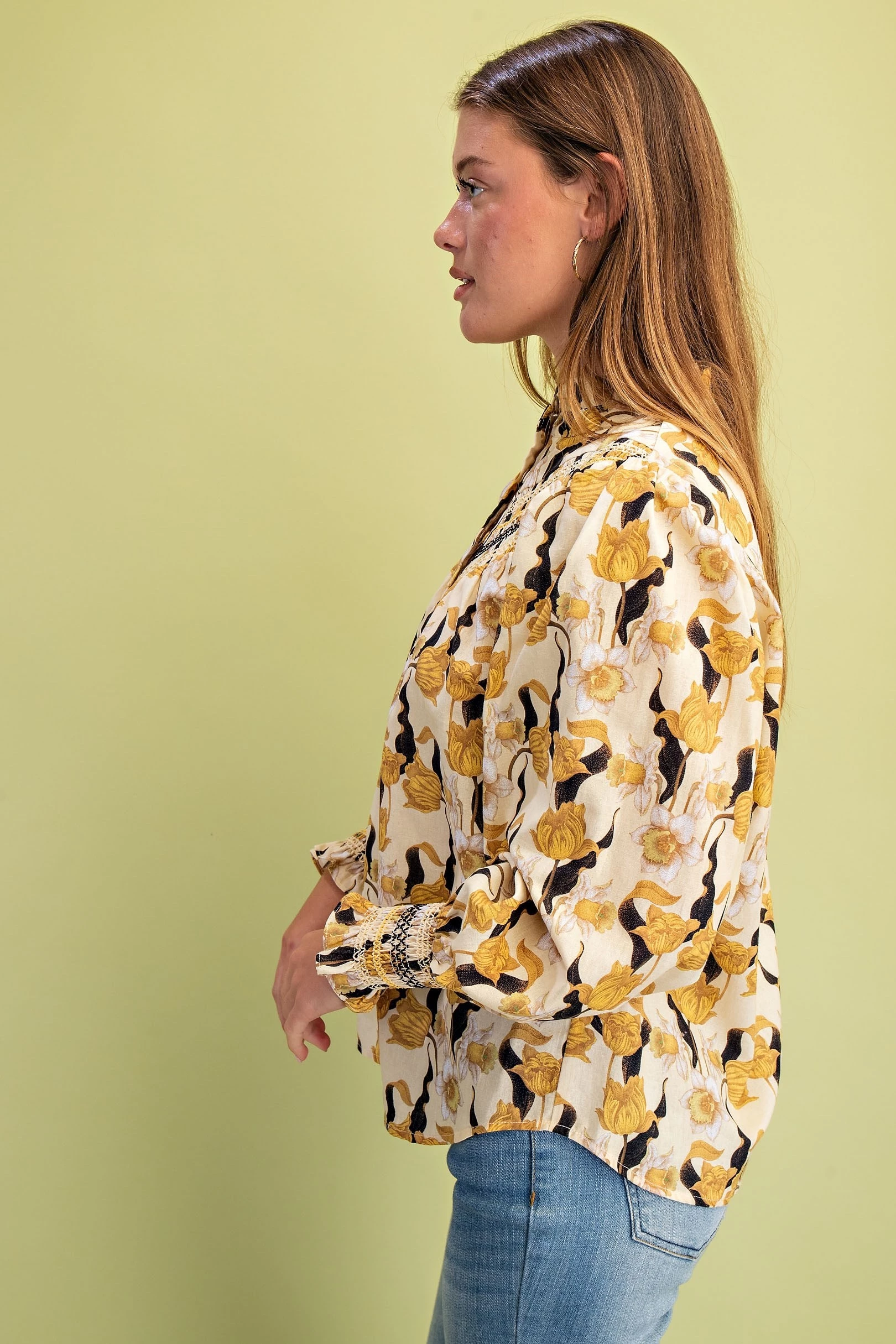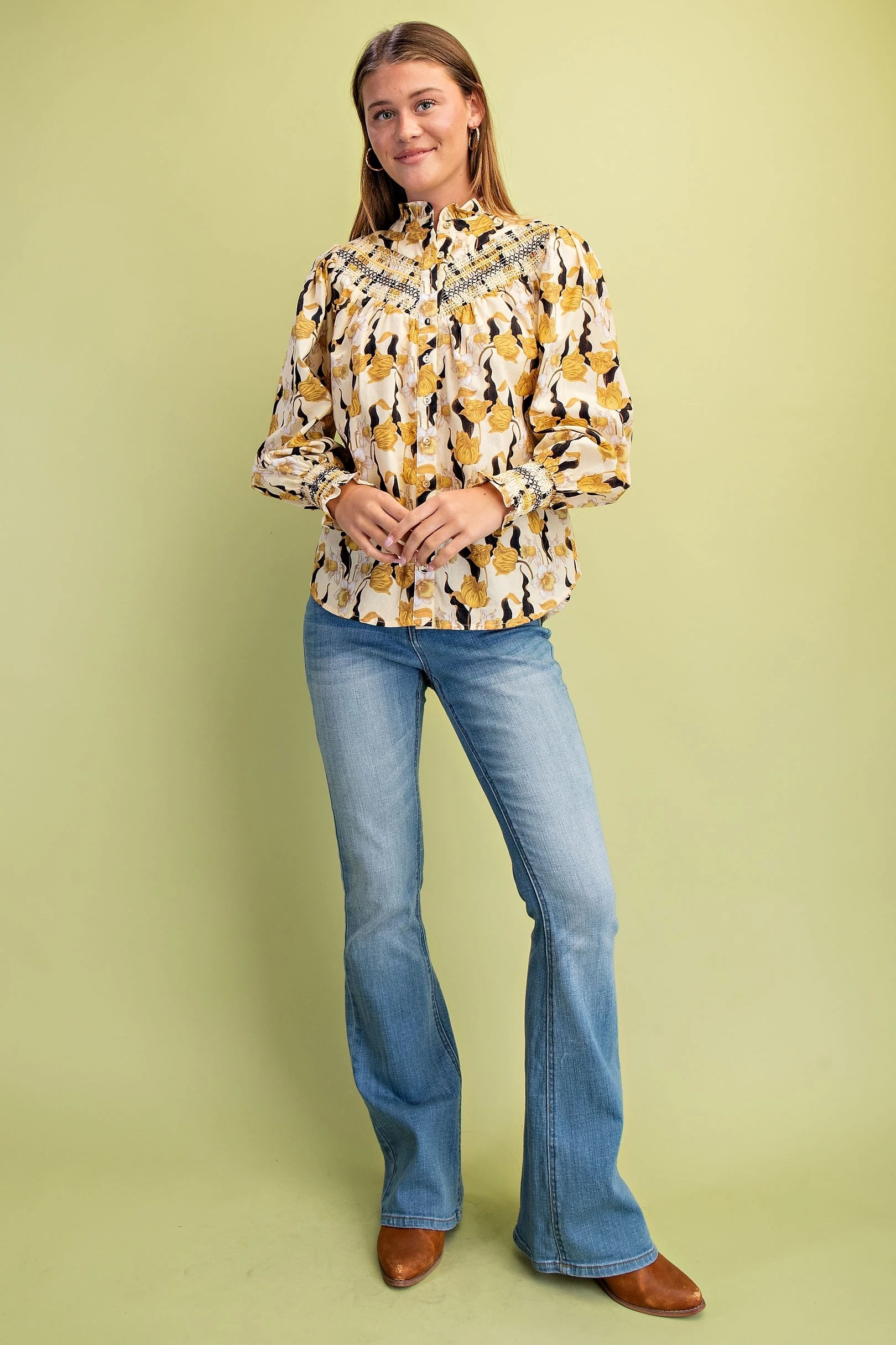 Floral Long Sleeve Button Down with Decorative Smocking Details and a Ruffled Collar