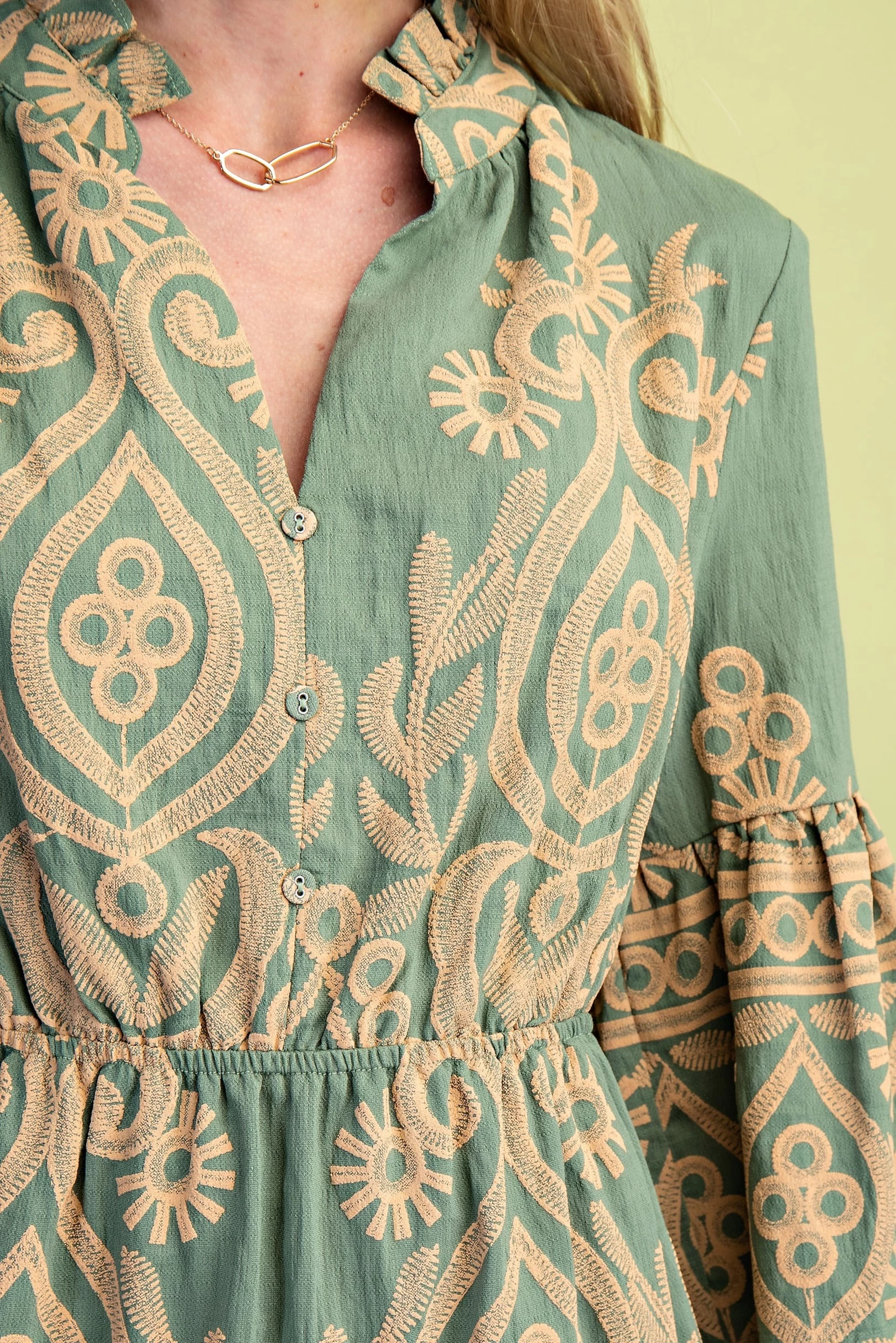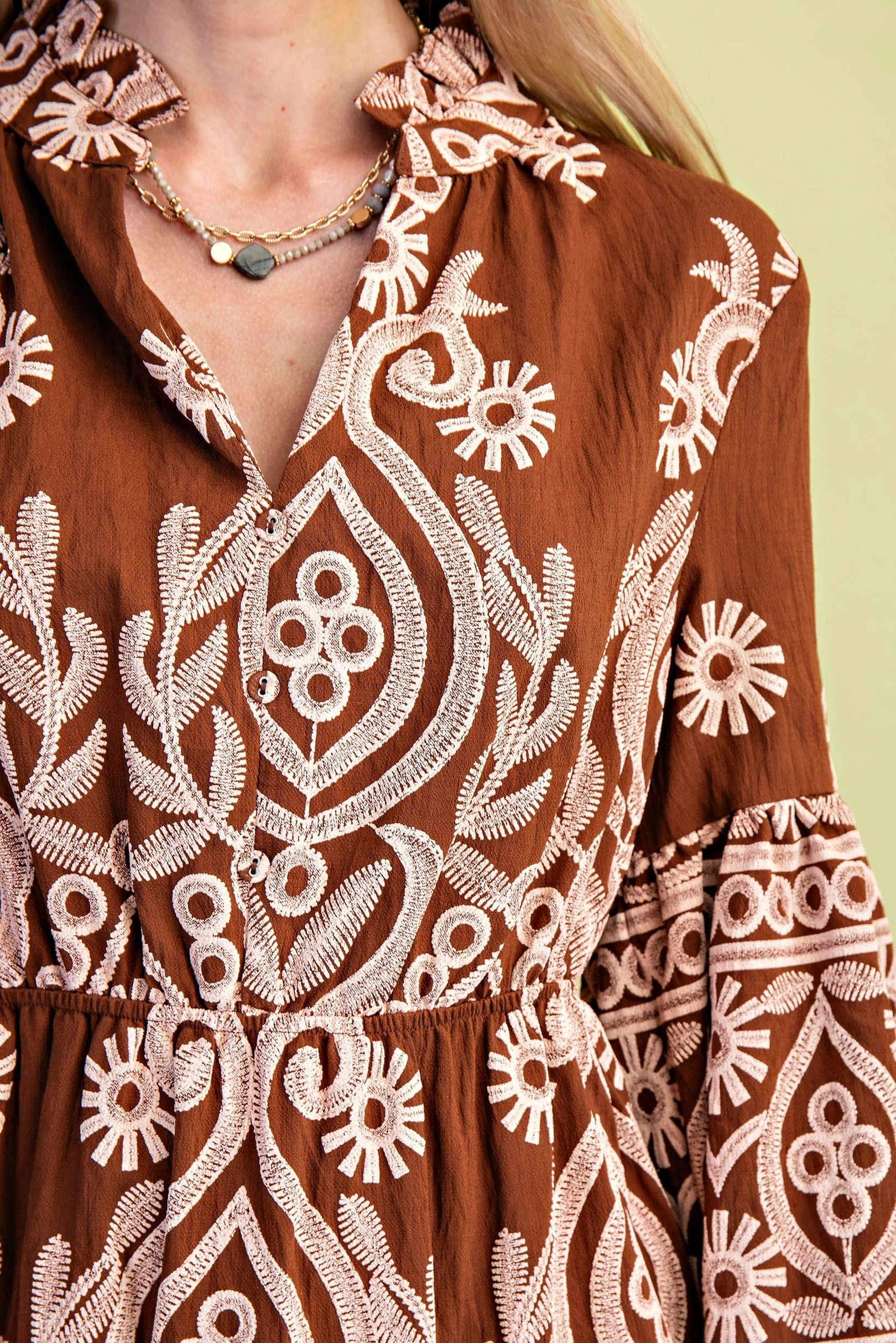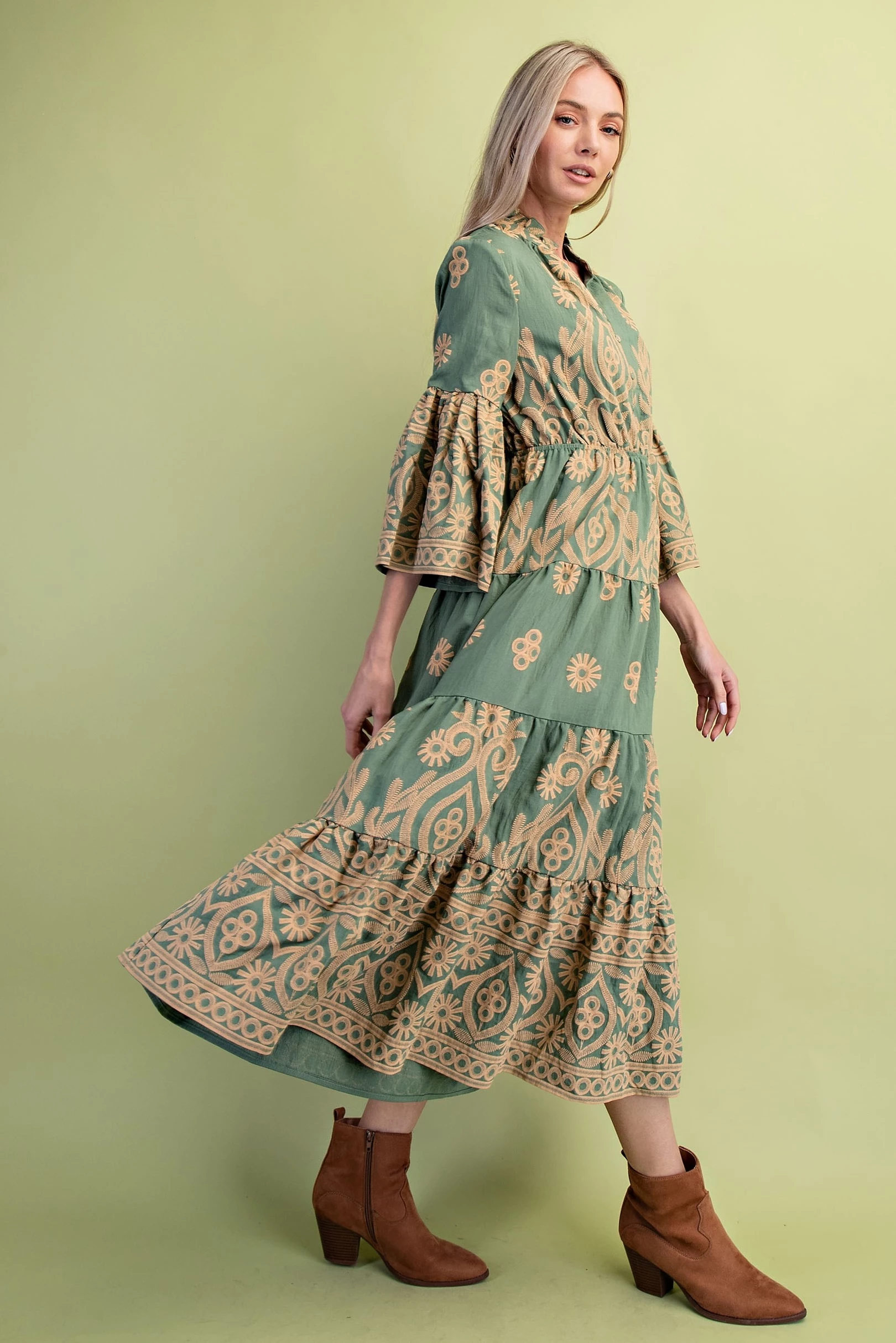 Textured Print Tiered Dress with a Ruffled Neck and Bell Sleeves