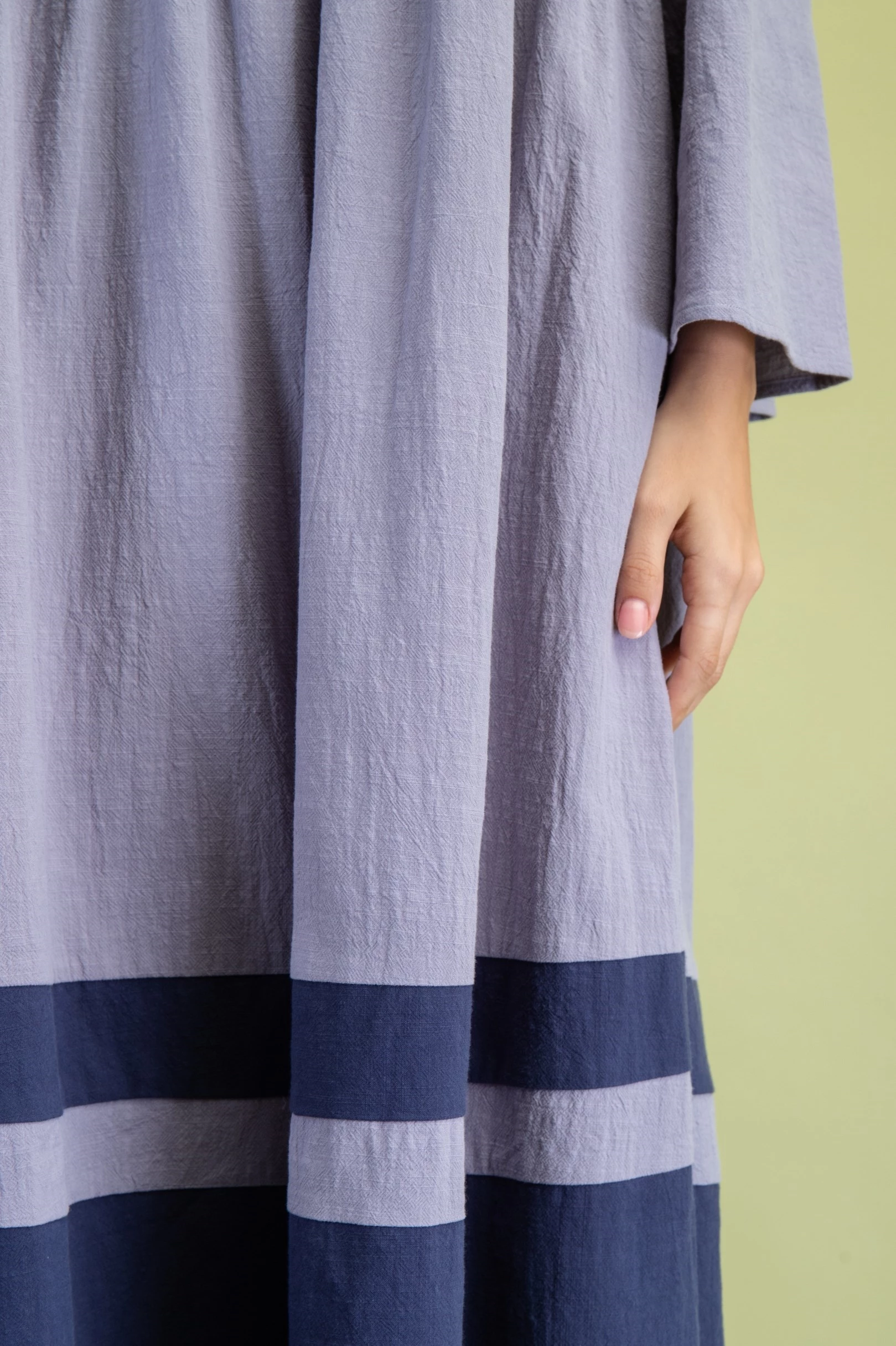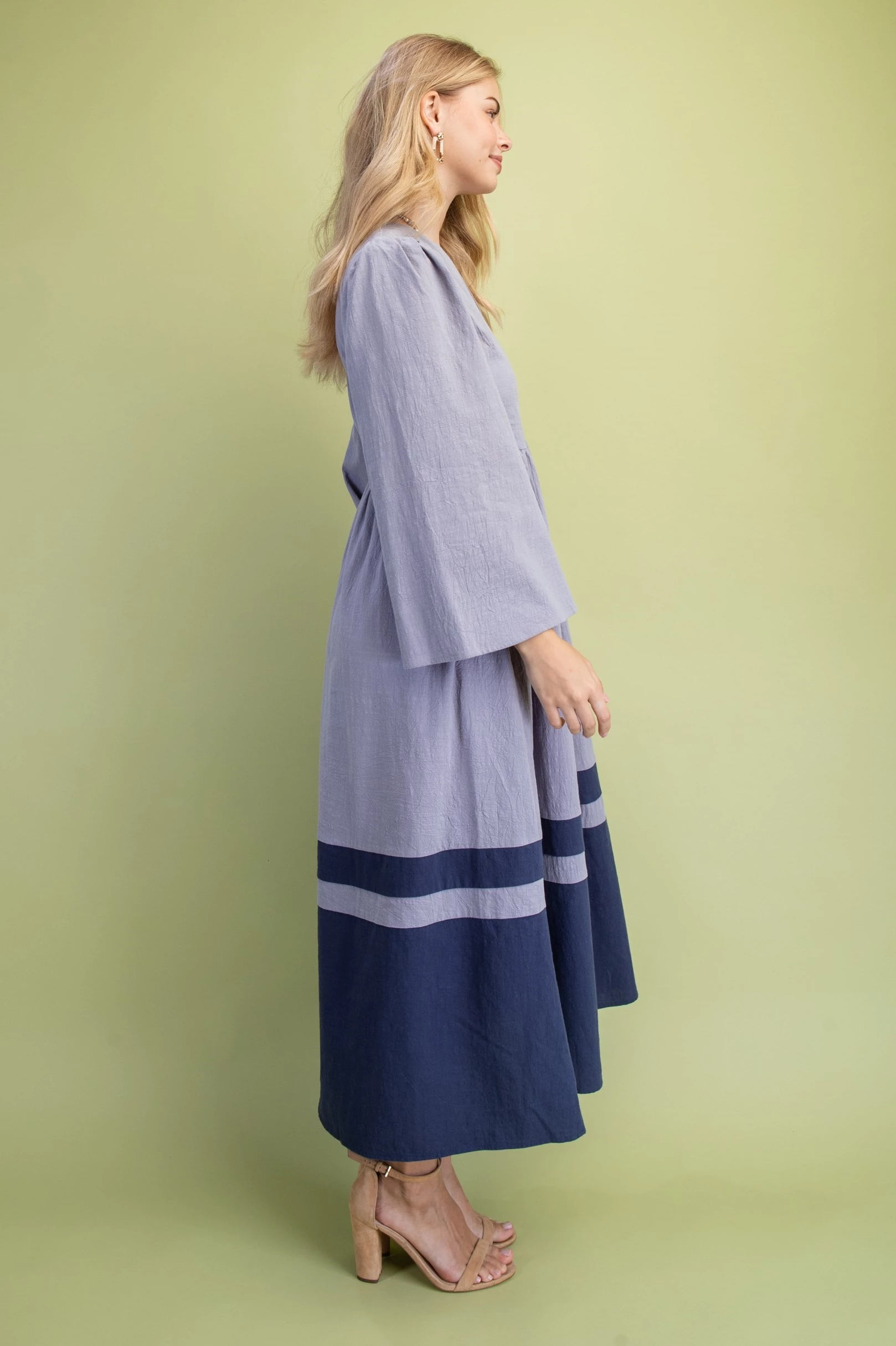 Textured Floral Print Chambray Half Button Up Dress with Box Pleat and Trapunto Stitching Details. The Skirt is Lined