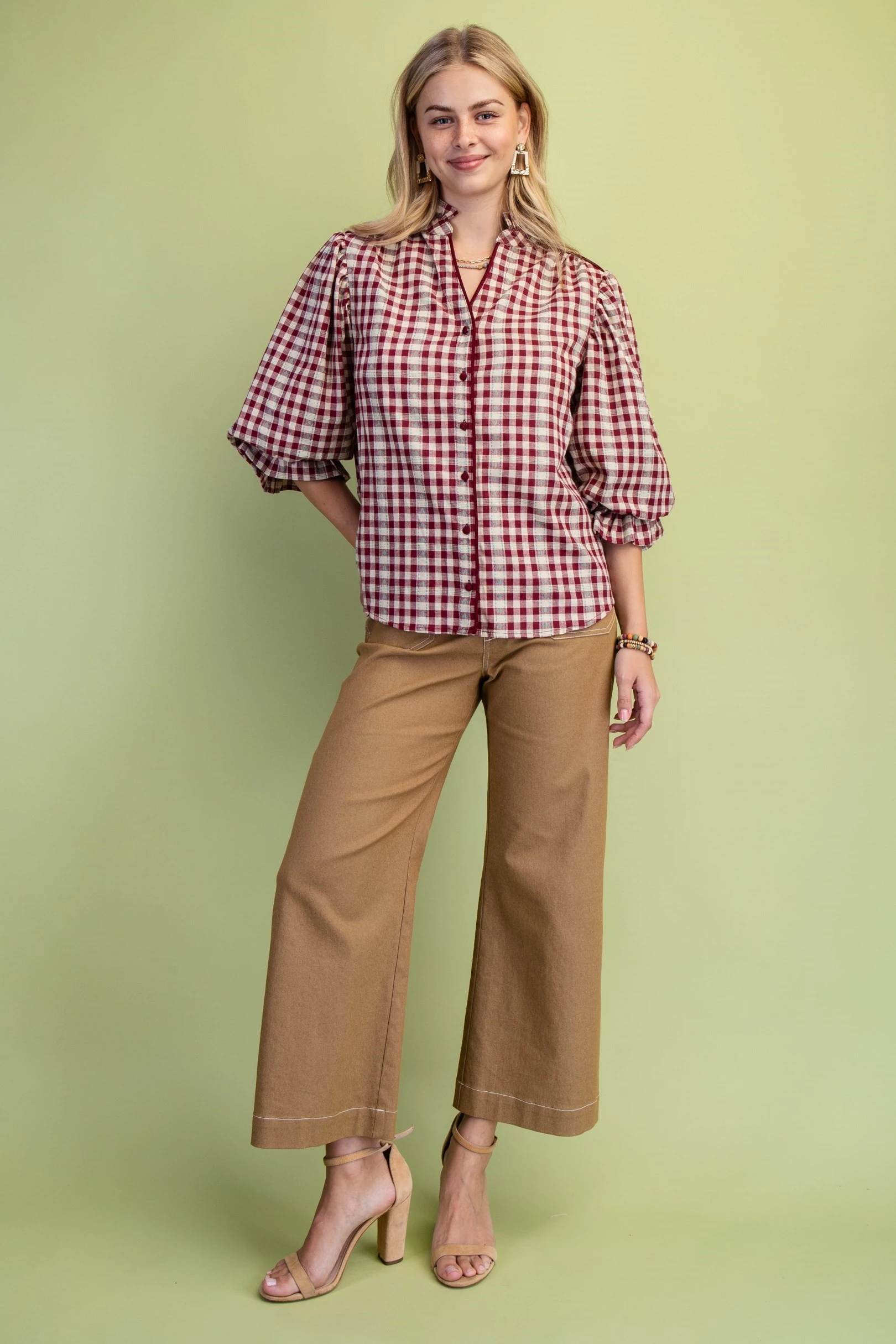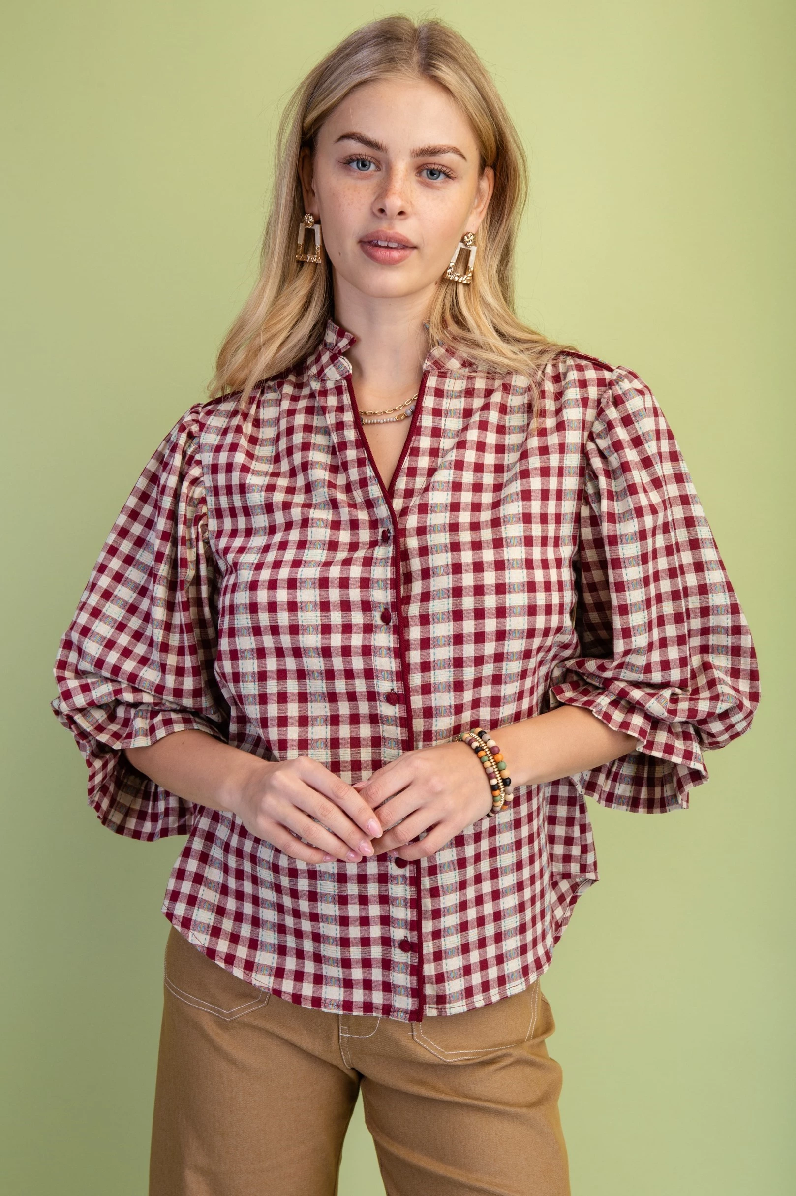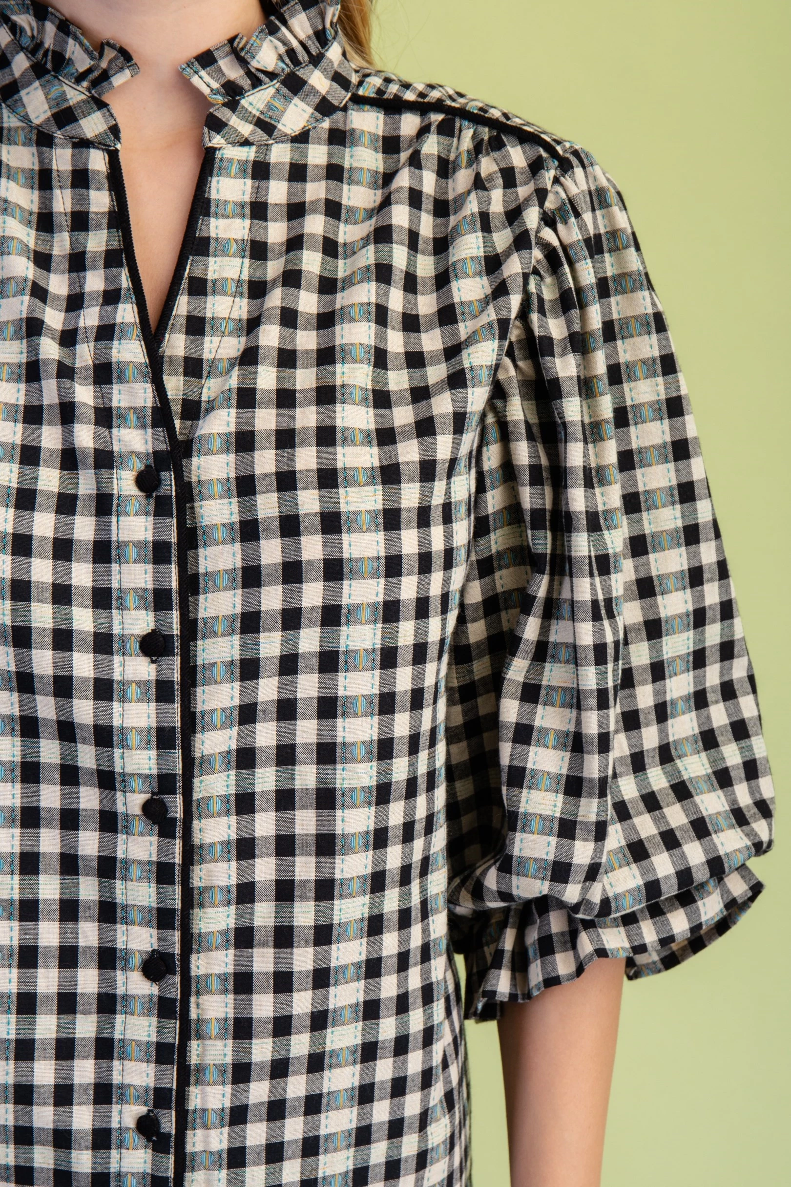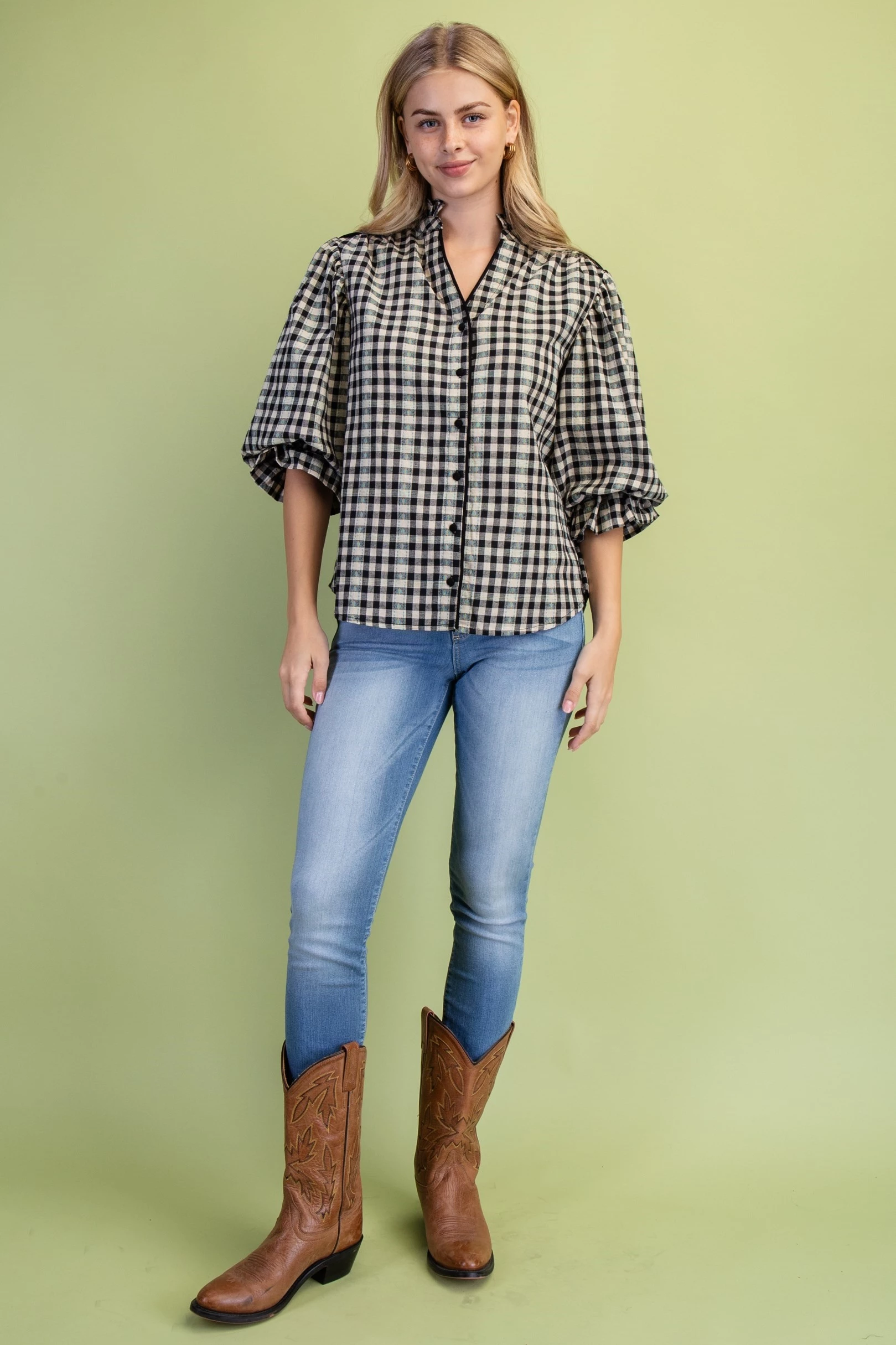 Check Print Button Down with 3/4 Length Gathered Balloon Sleeves and a Rounded Back Yoke