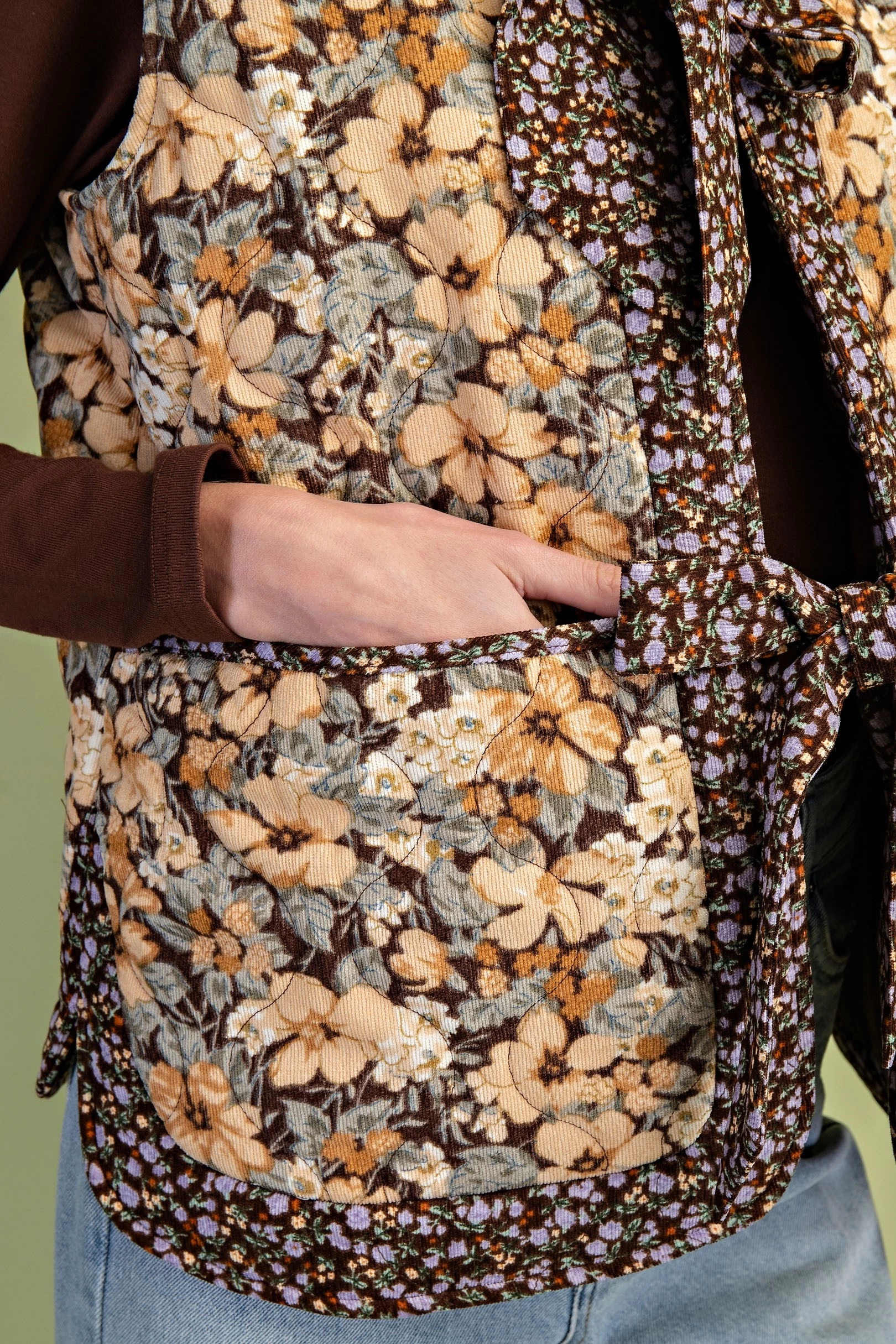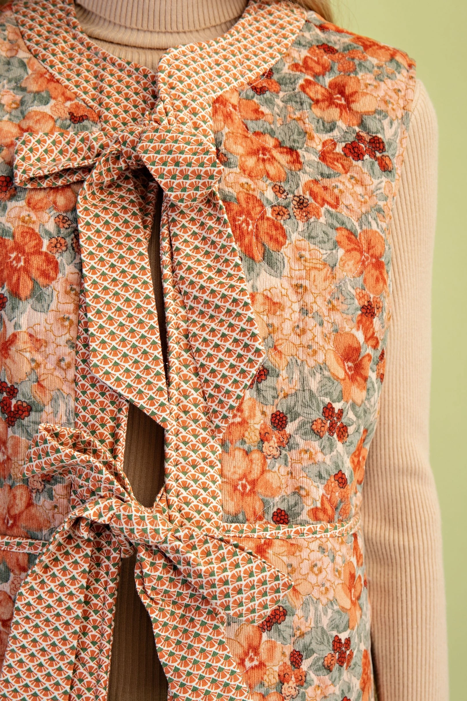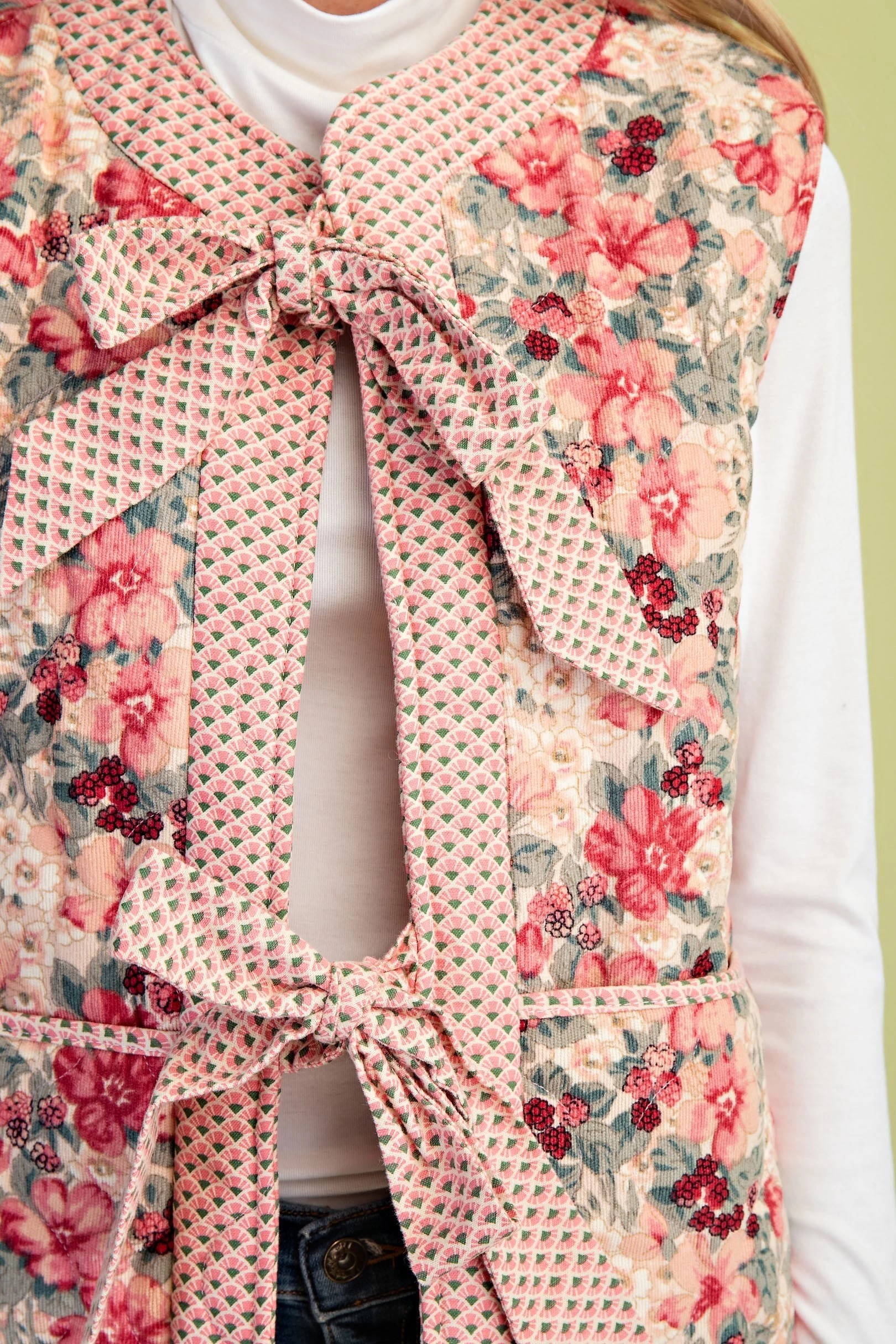 Quilted Floral Print Vest with Two Front Bow Ties and Contrasting Fabric Details