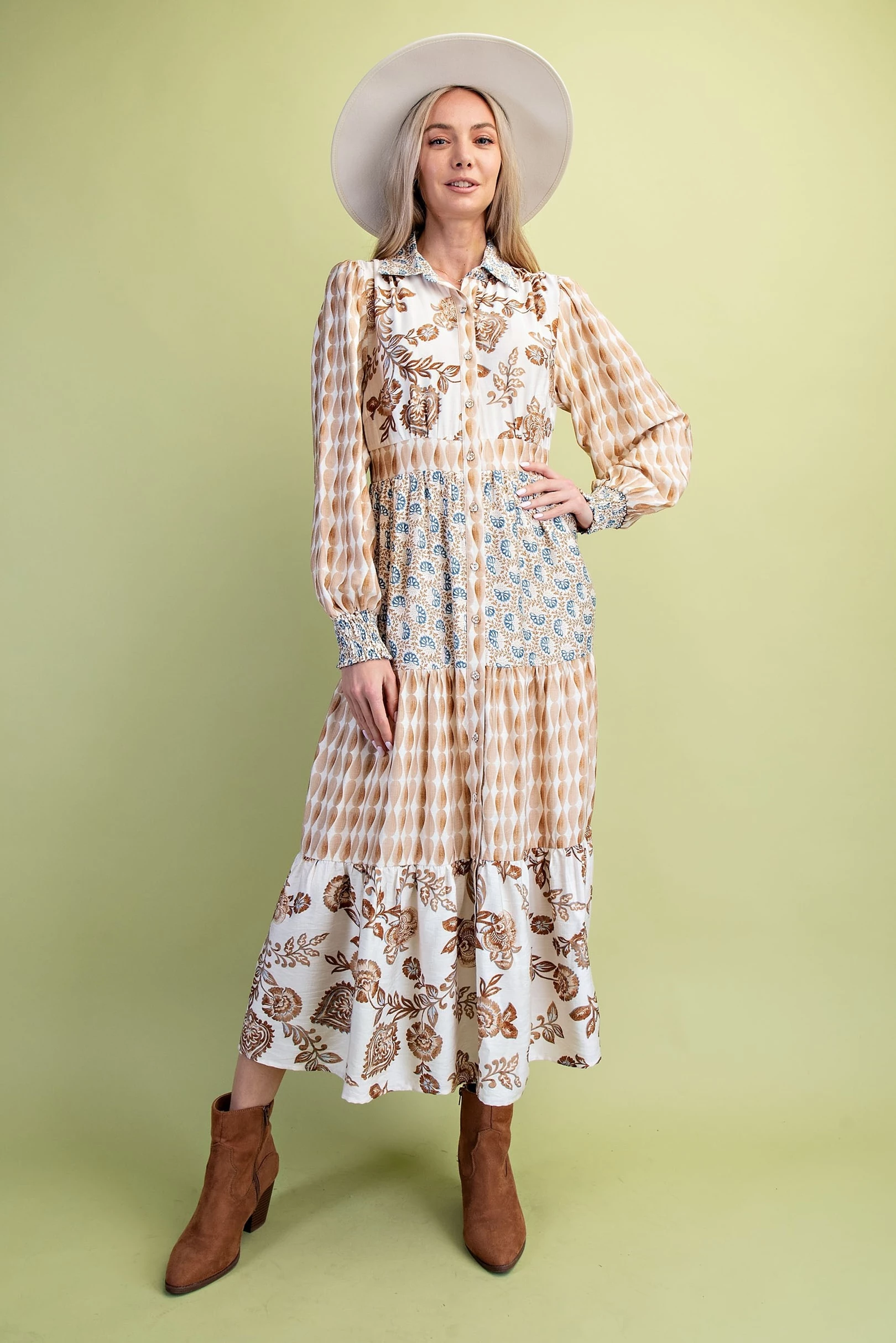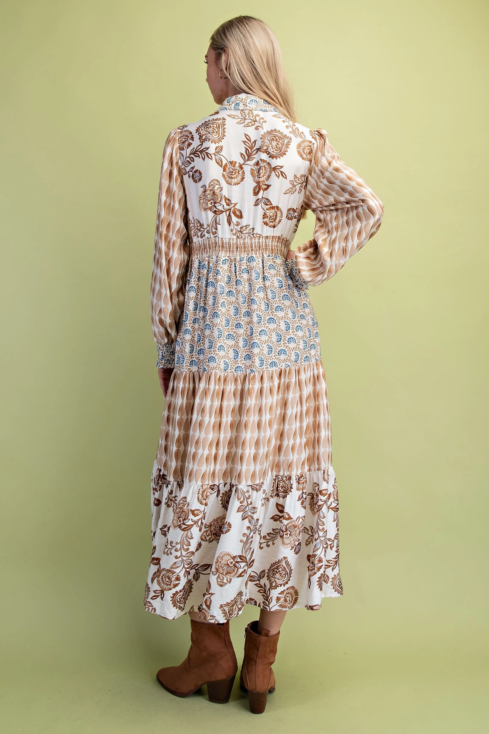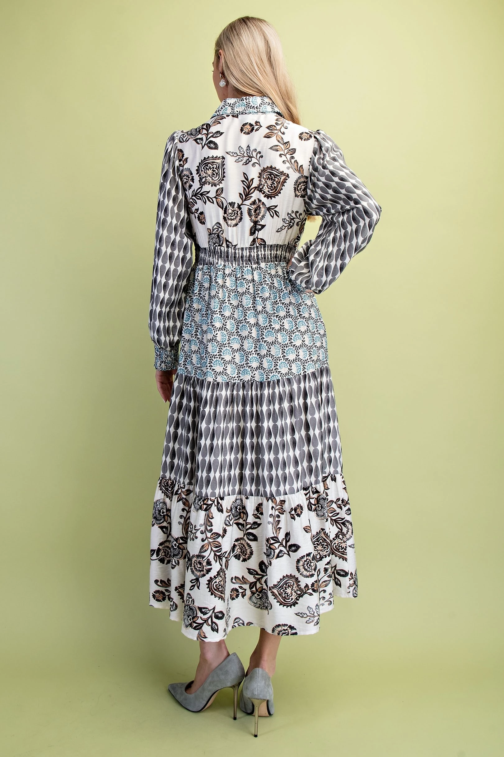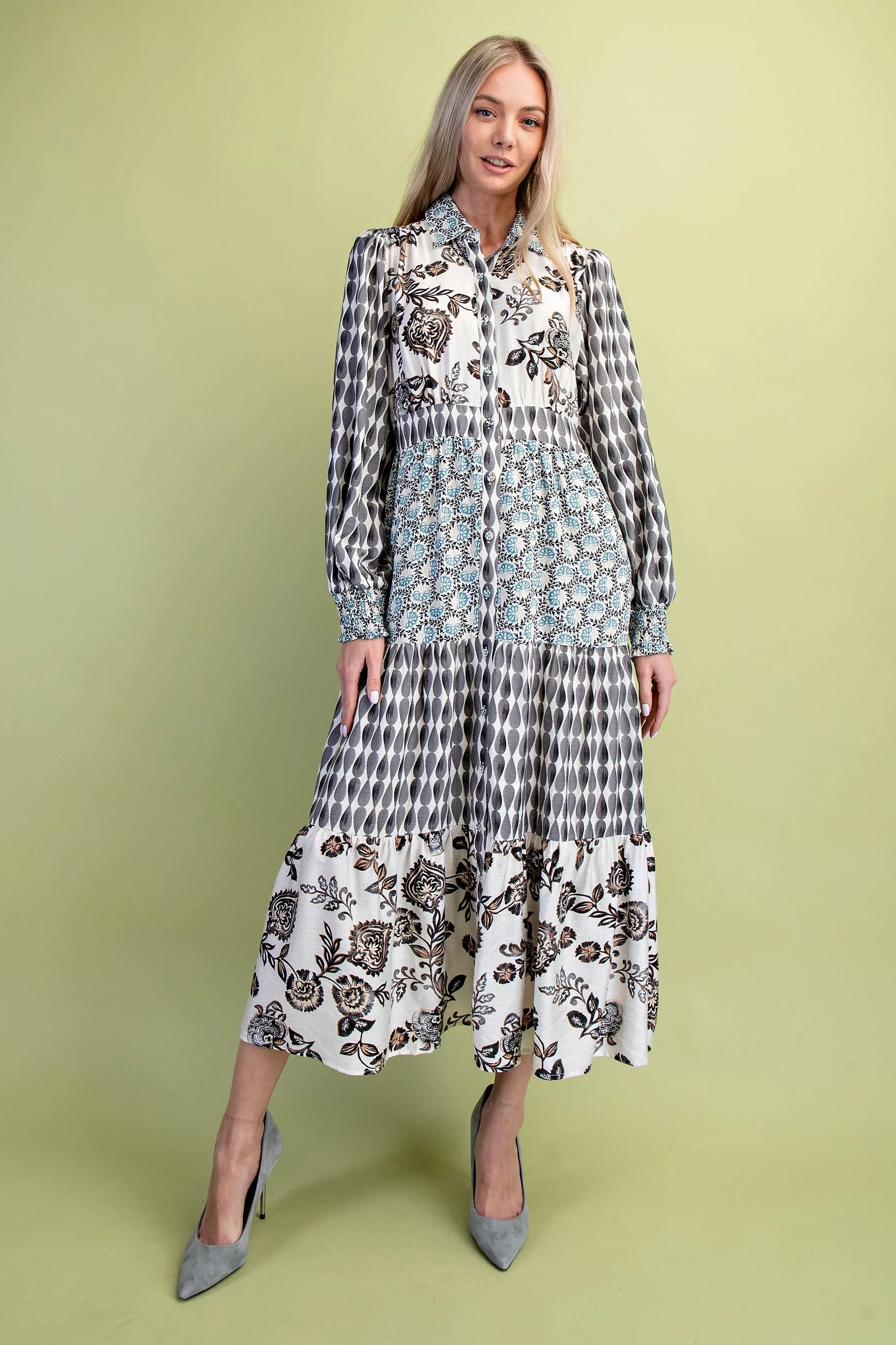 Mixed Print Tiered Shirt Dress with a Smocked Back Waist and Smocked Sleeve Hem. The Skirt is Lined
