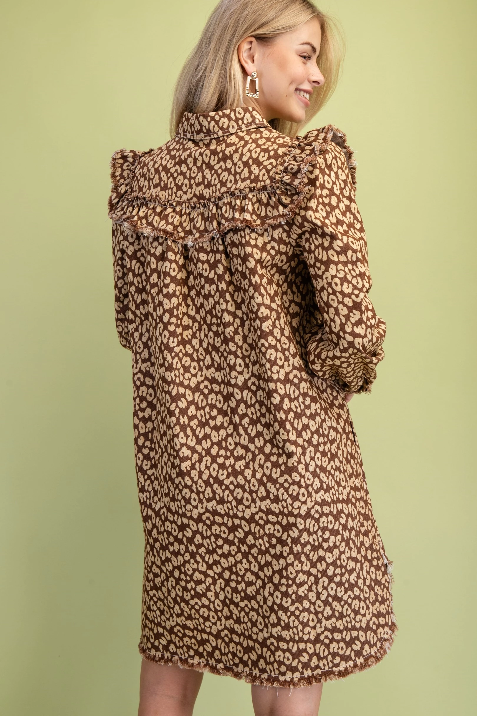 Leopard Print Denim Snap Closure Shirt Dress with Ruffle Details