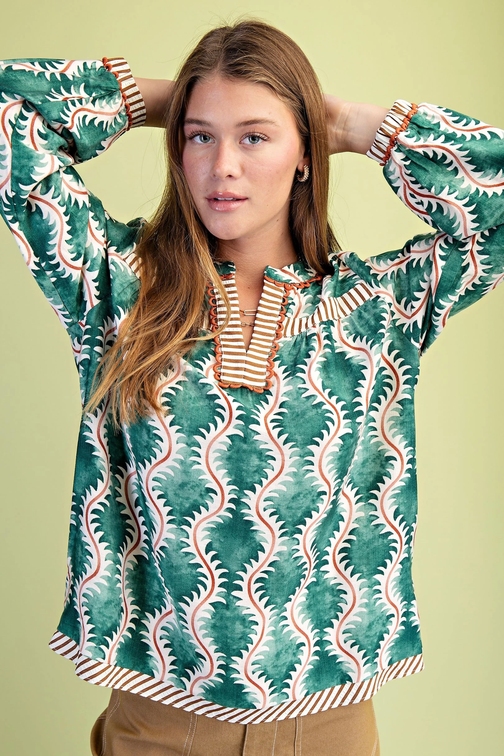 Printed V-Neck Top with Contrasting Stripe Accents and a Decorative Trim