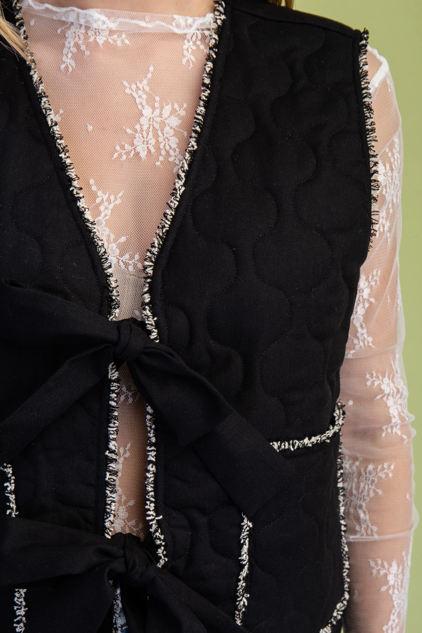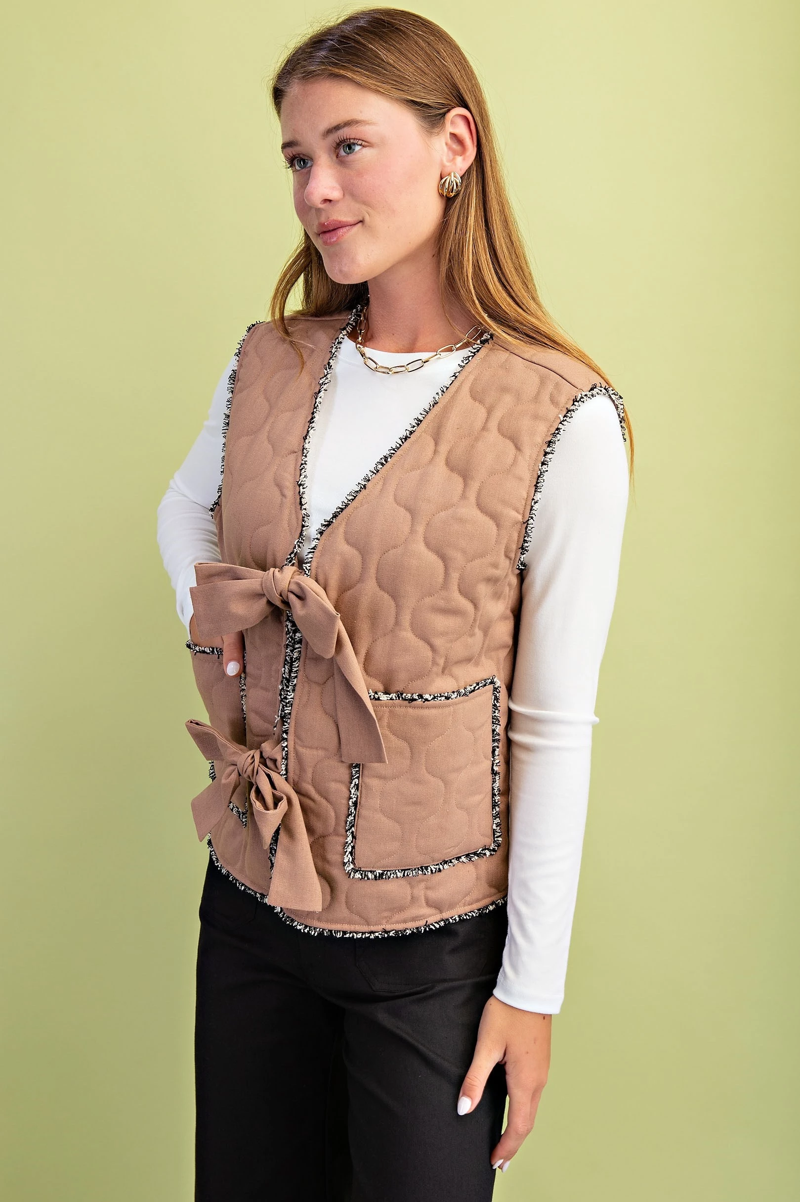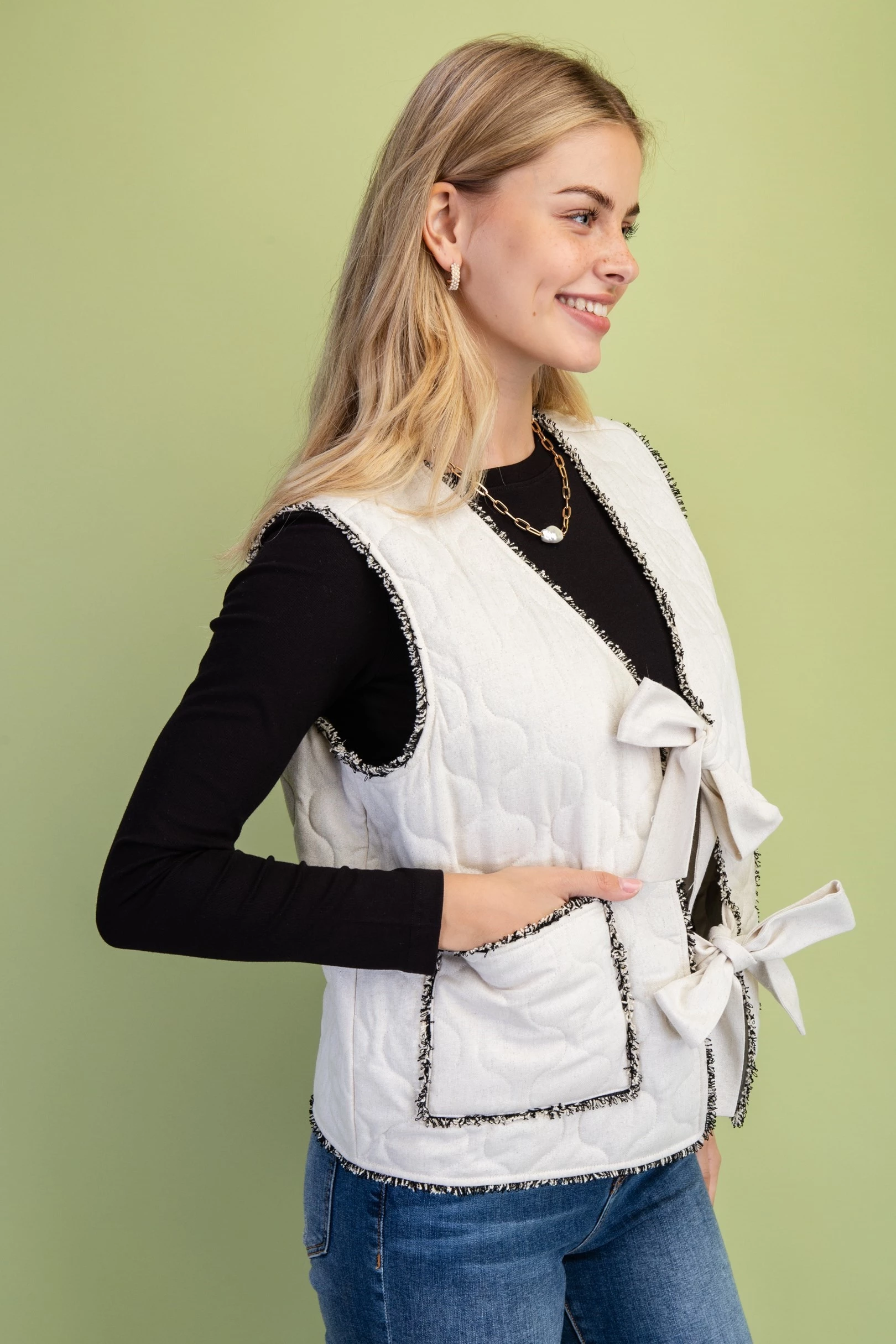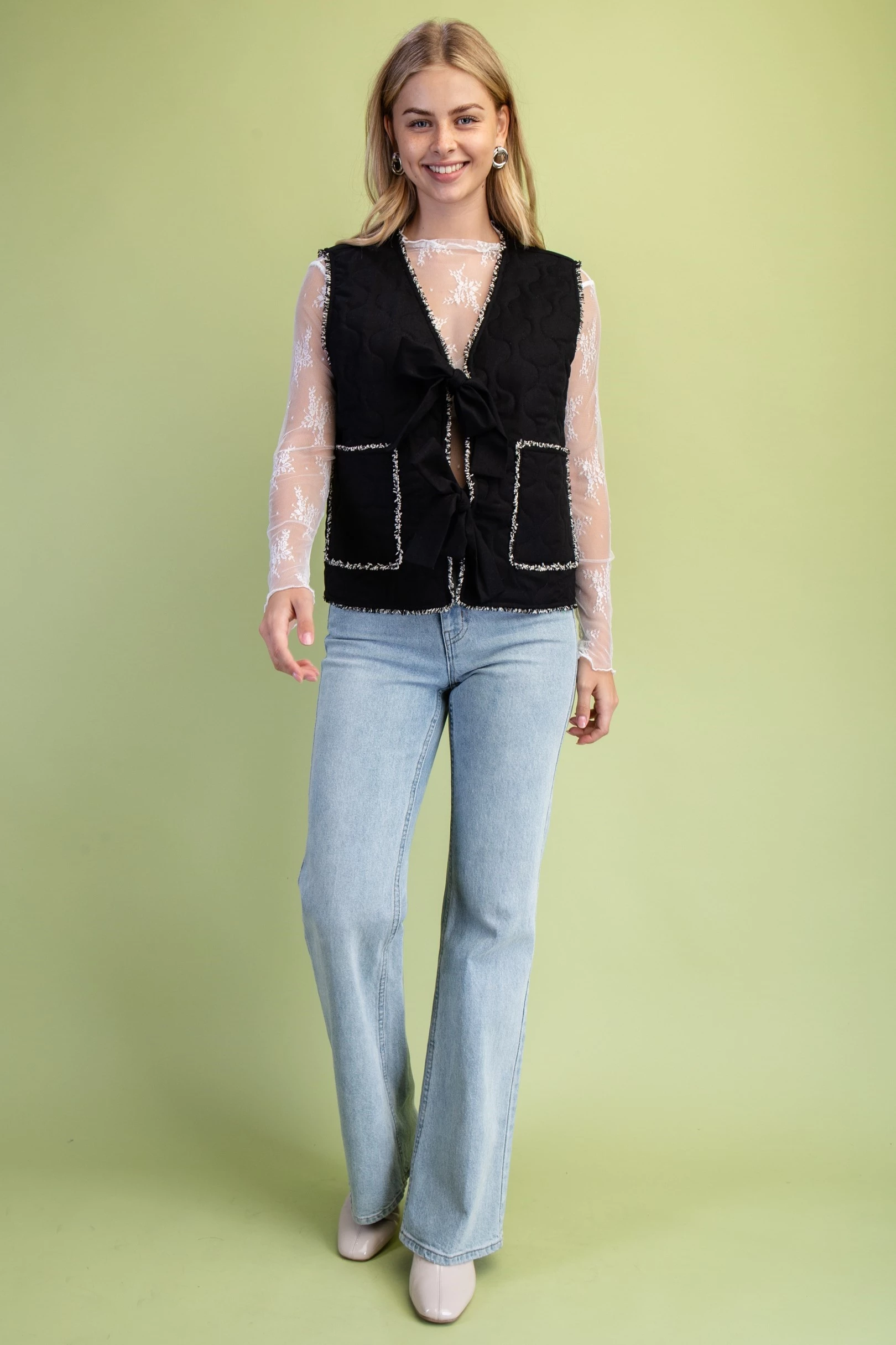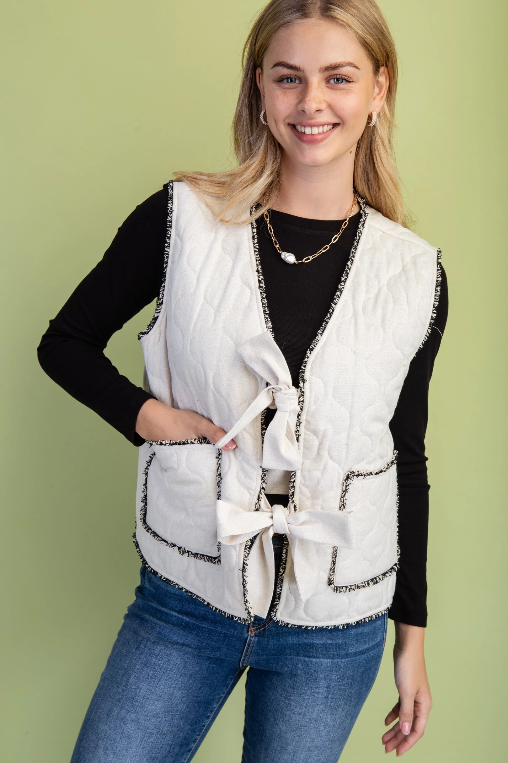 Quilted Button Up Vest with Frayed Fringe Details and Front Ties