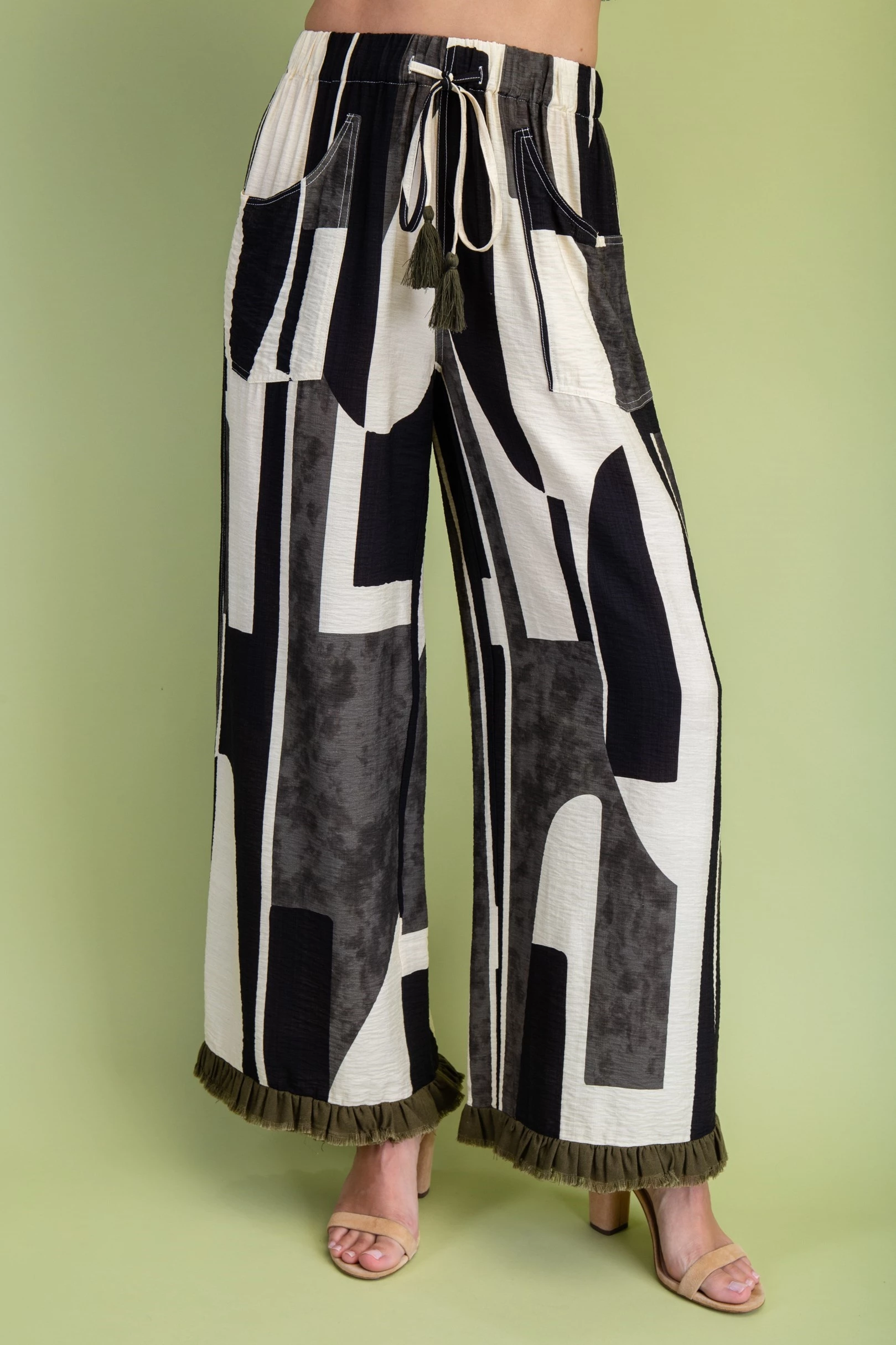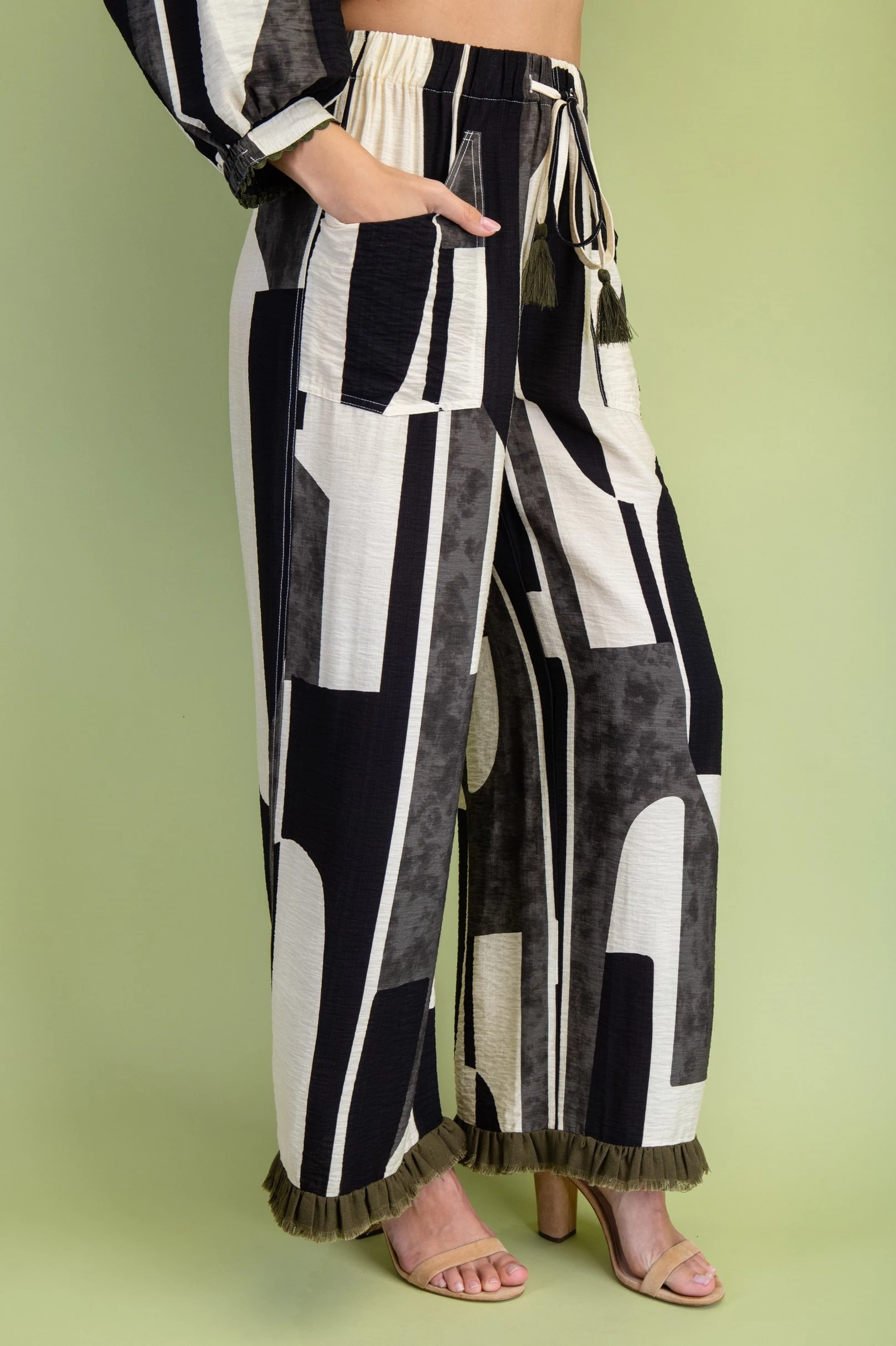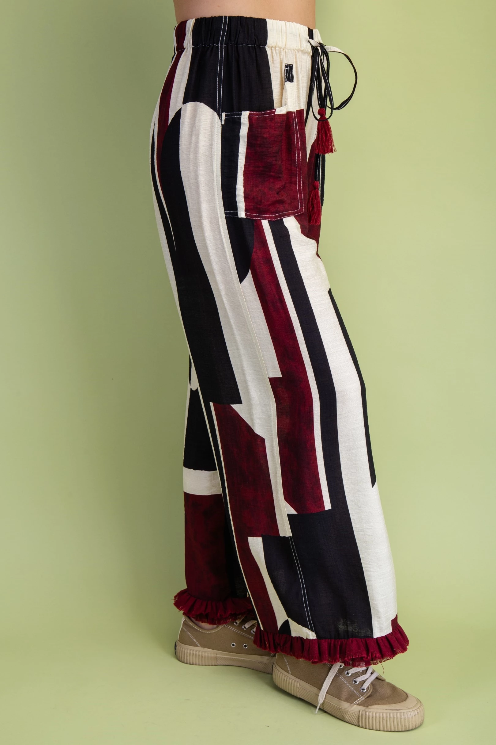Abstract Print Relaxed Fit Pants with a Frayed Hem and Tassel Drawstring