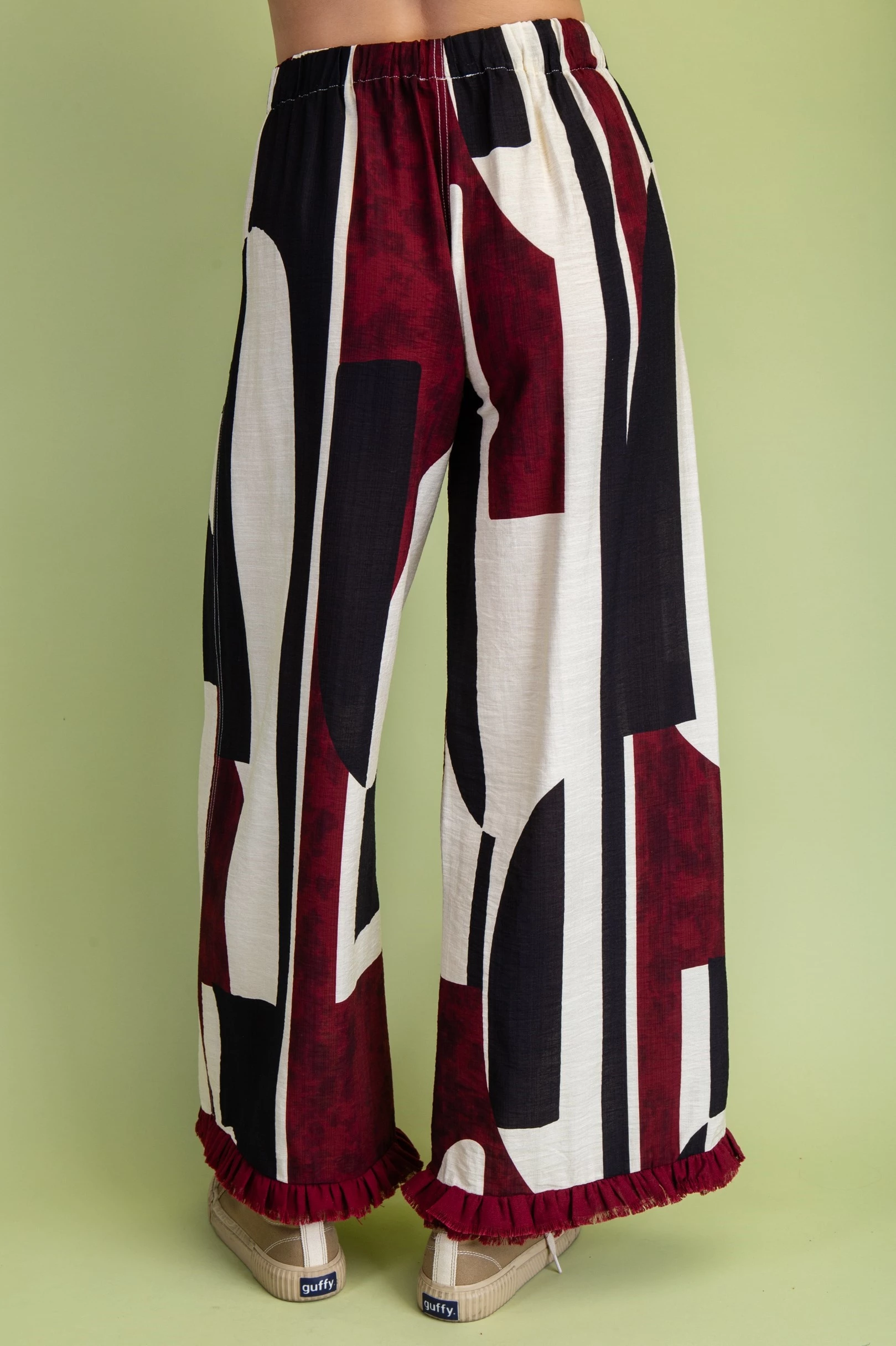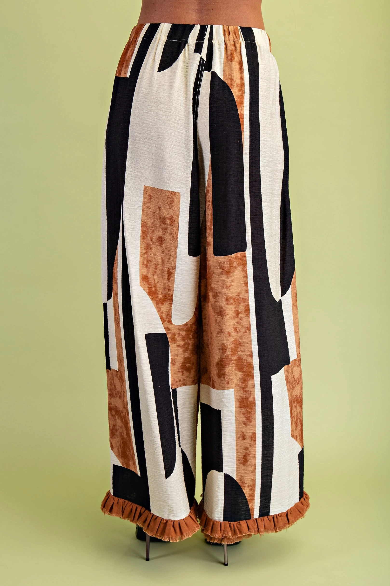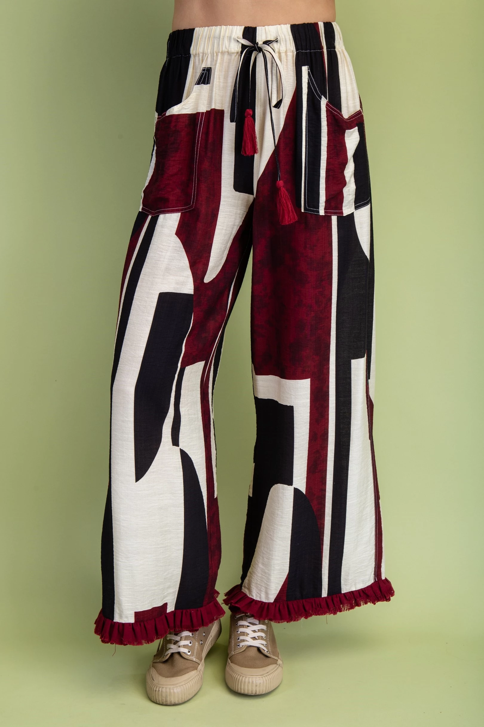 Abstract Print Relaxed Fit Pants with a Frayed Hem and Tassel Drawstring