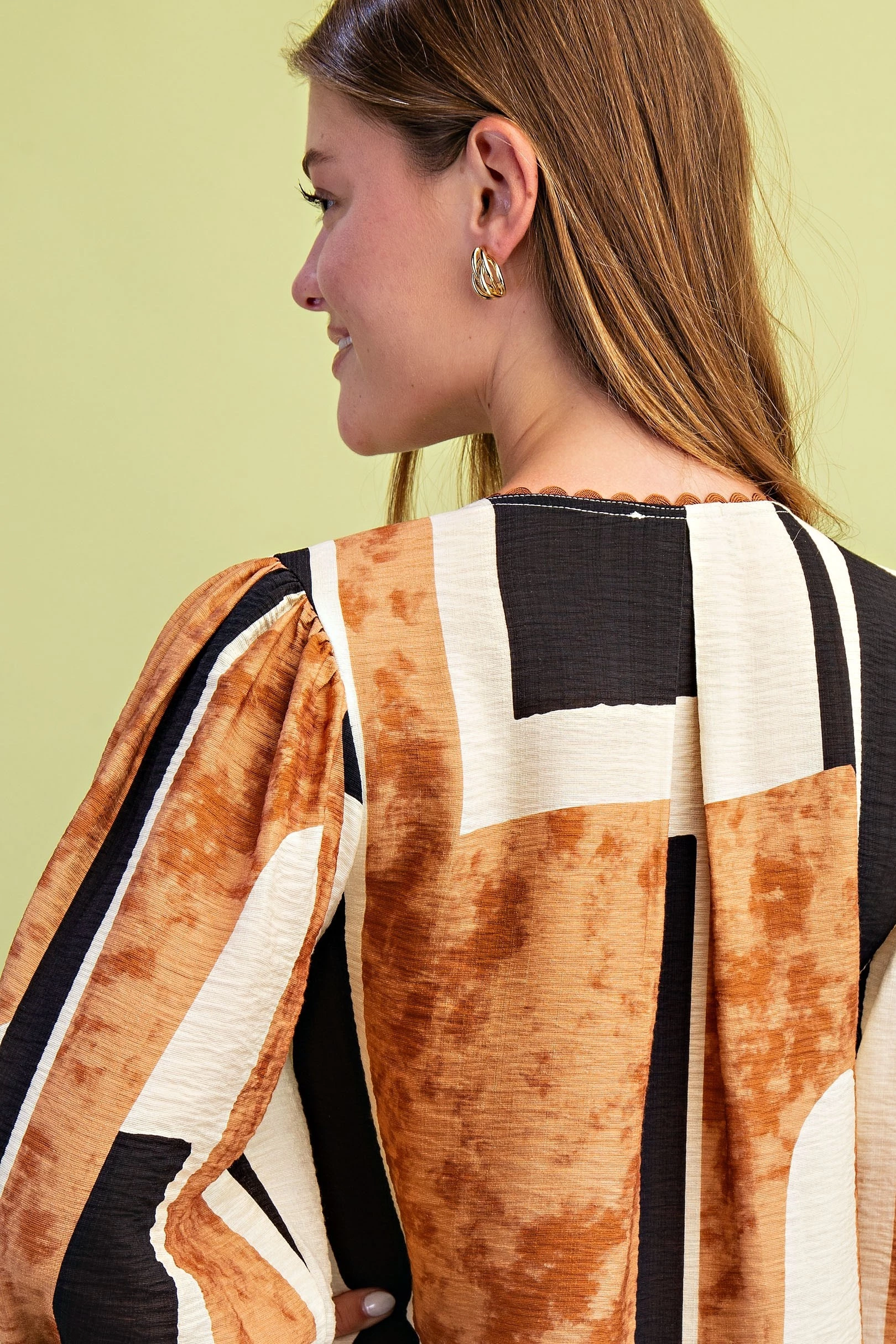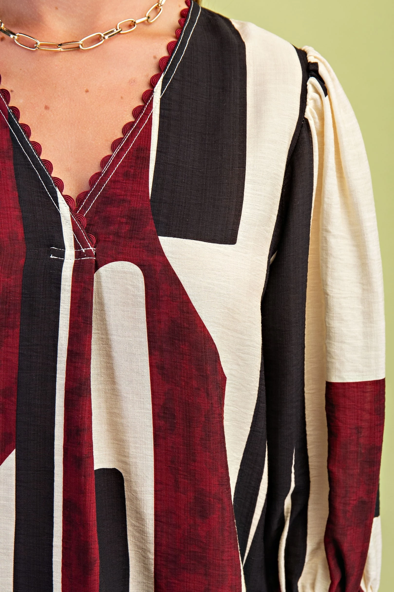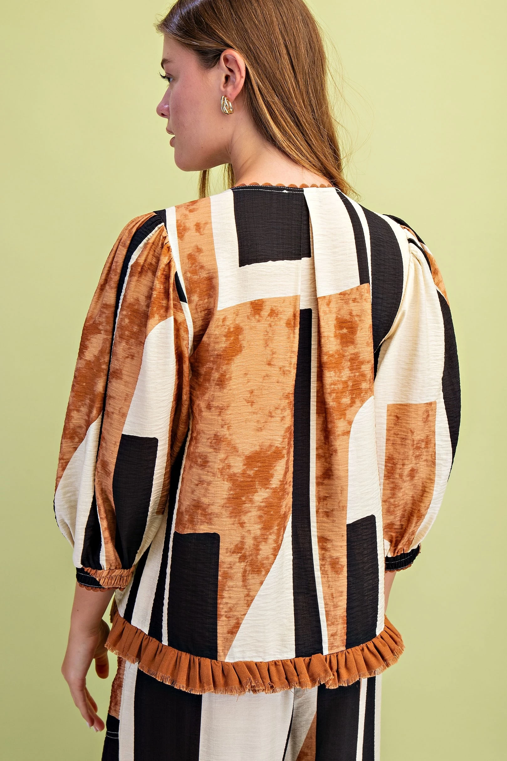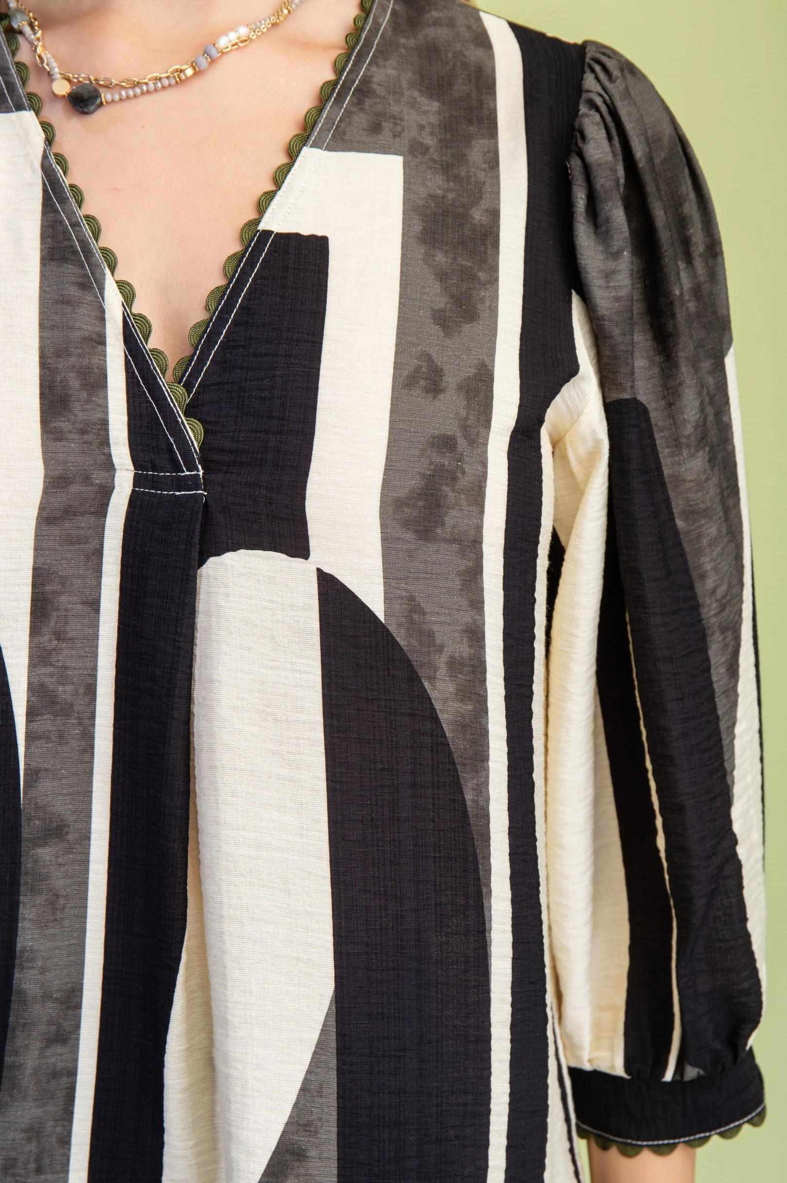 Abstract Print V-Neck Top with Ric-Rac Trim and a Frayed Hem