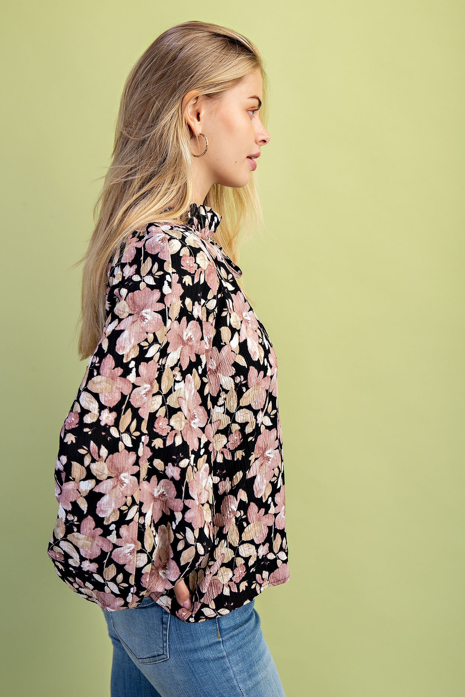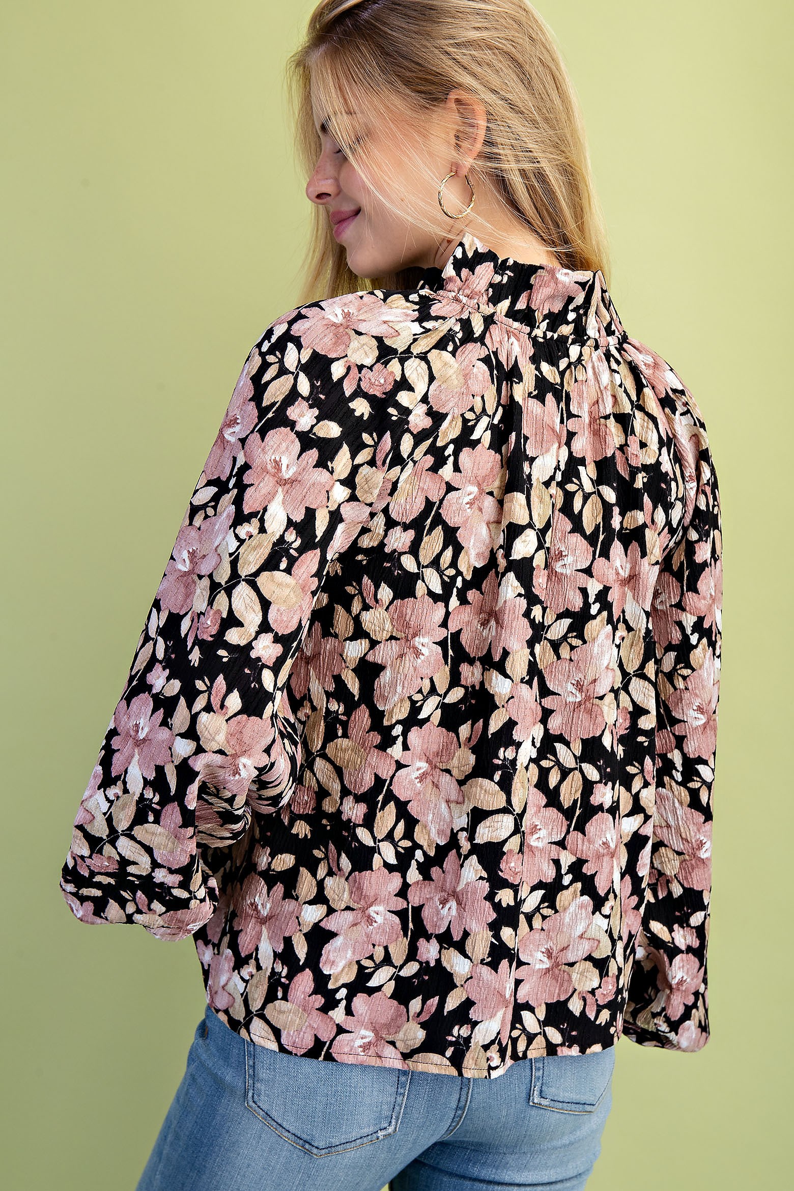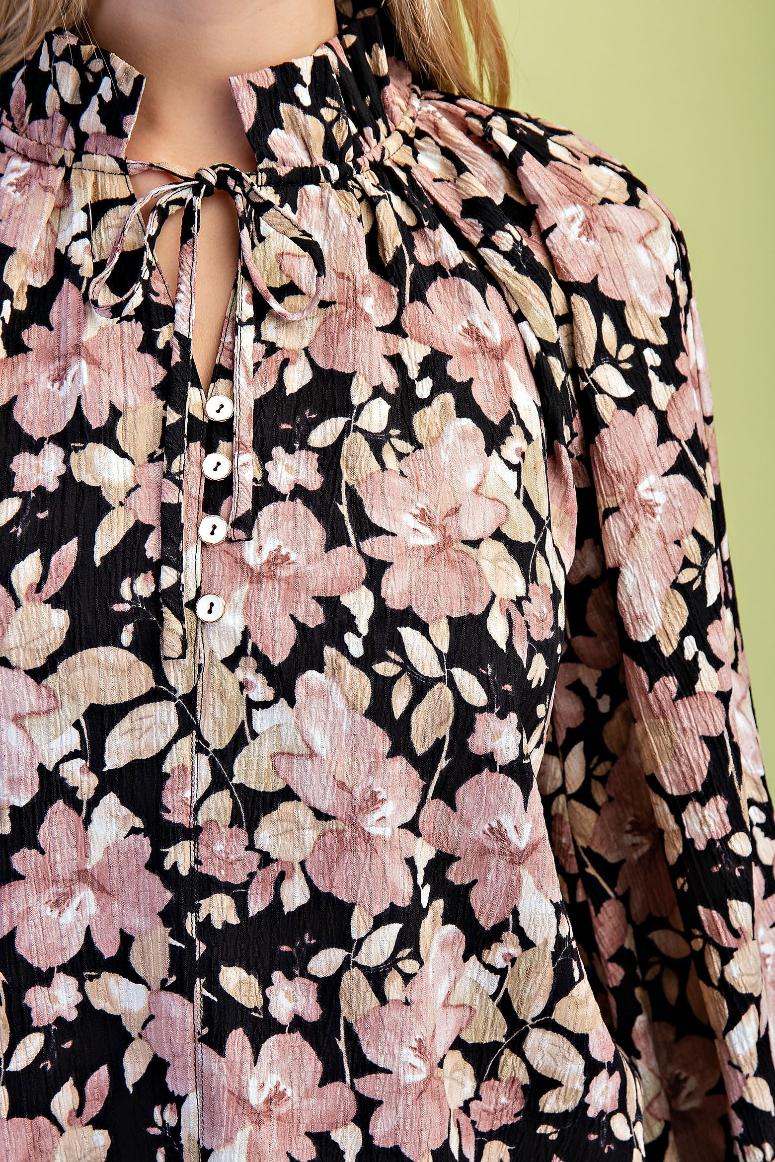 Floral Print High Ruffle Collar Blouse with a Front Tie Neck and Balloon Sleeves