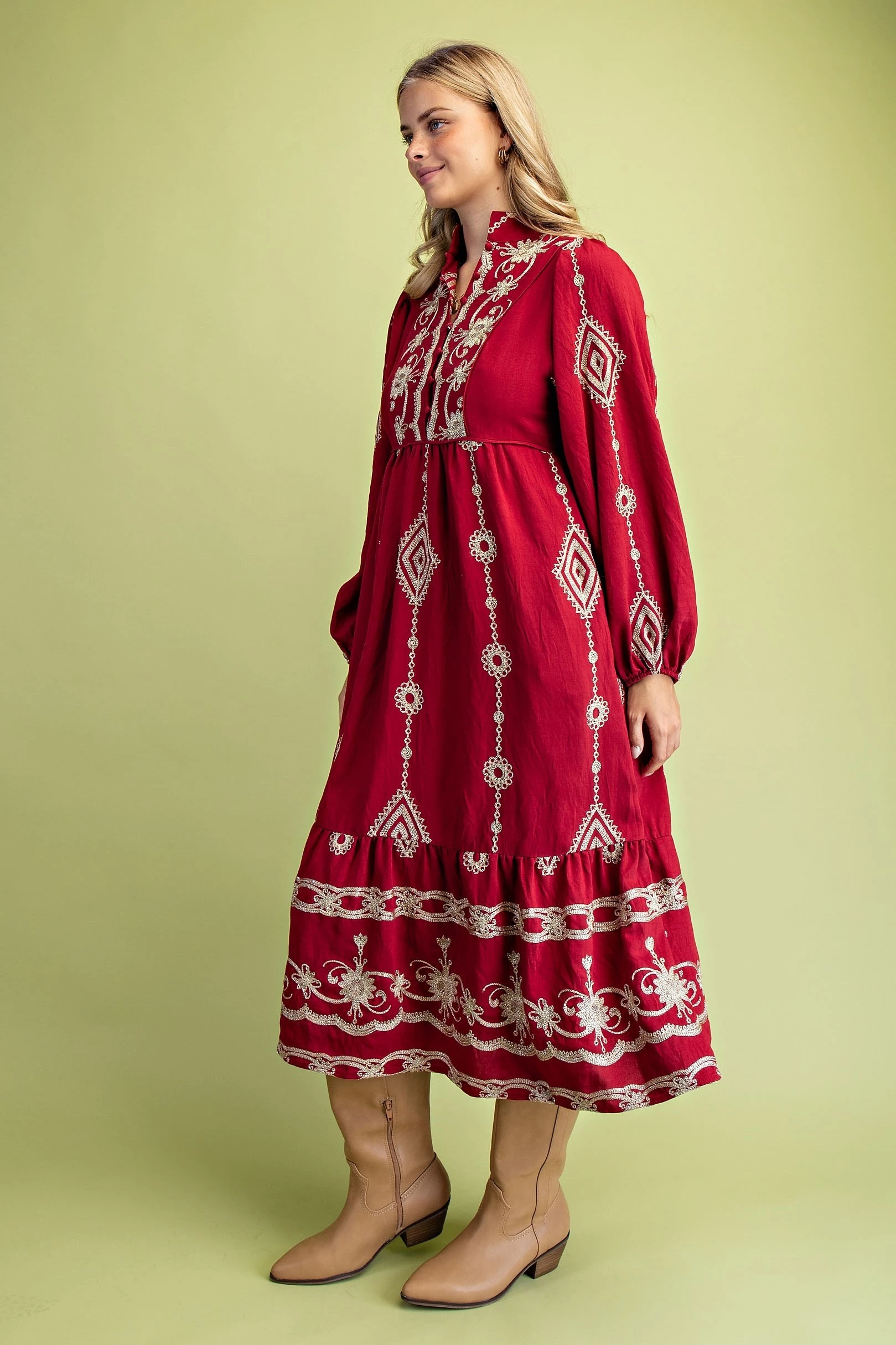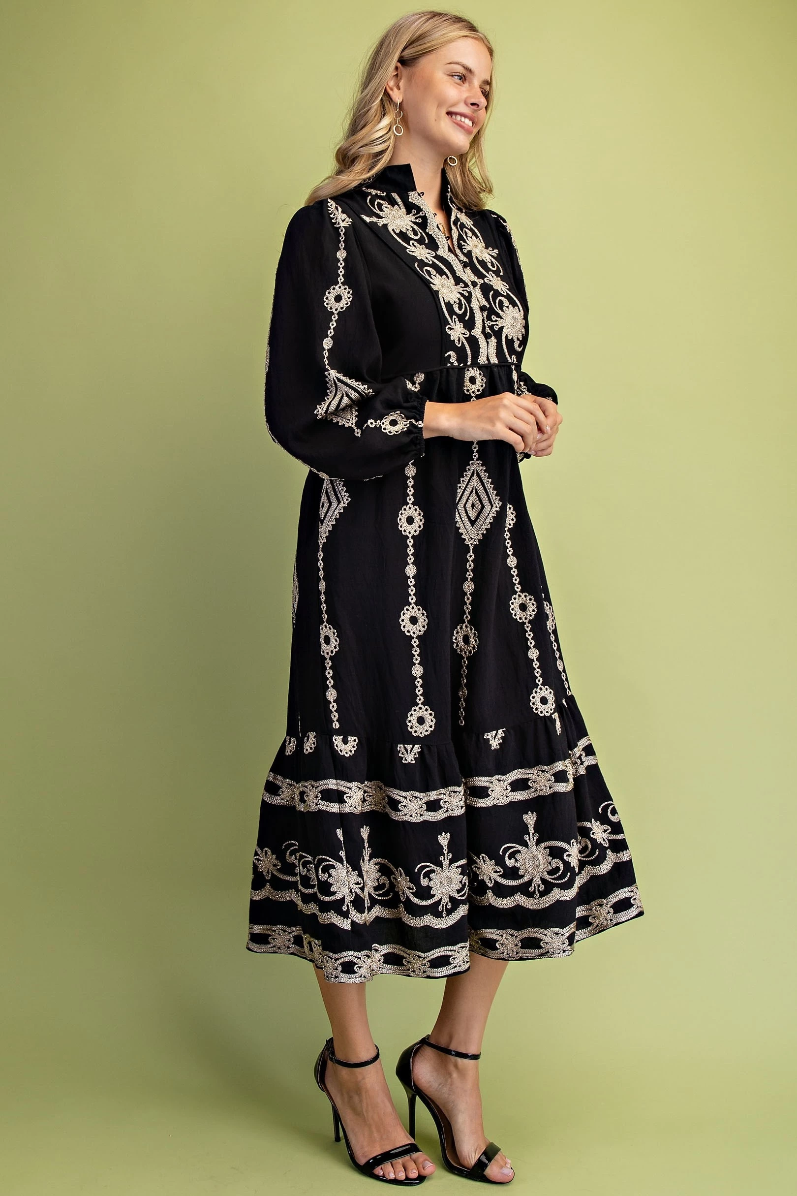 Buttoned V-Neck Midi Dress with Metallic Embroidery. The Skirt is Lined