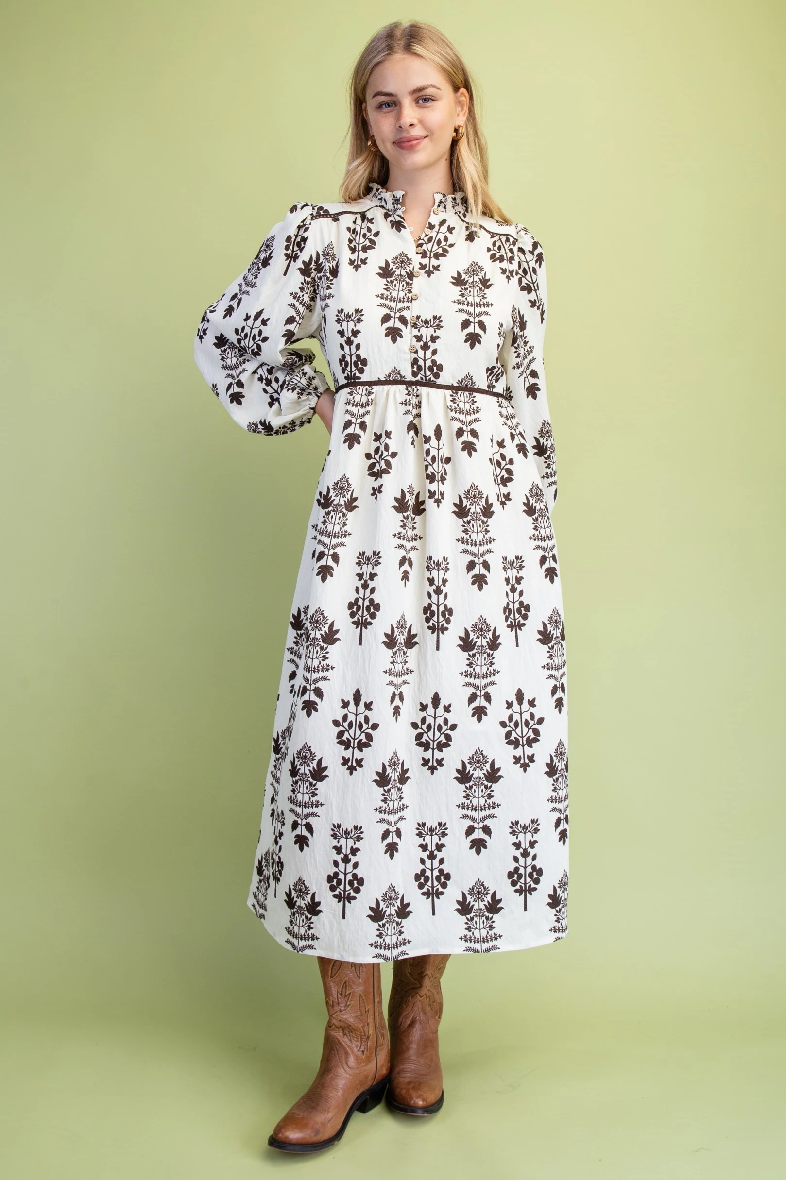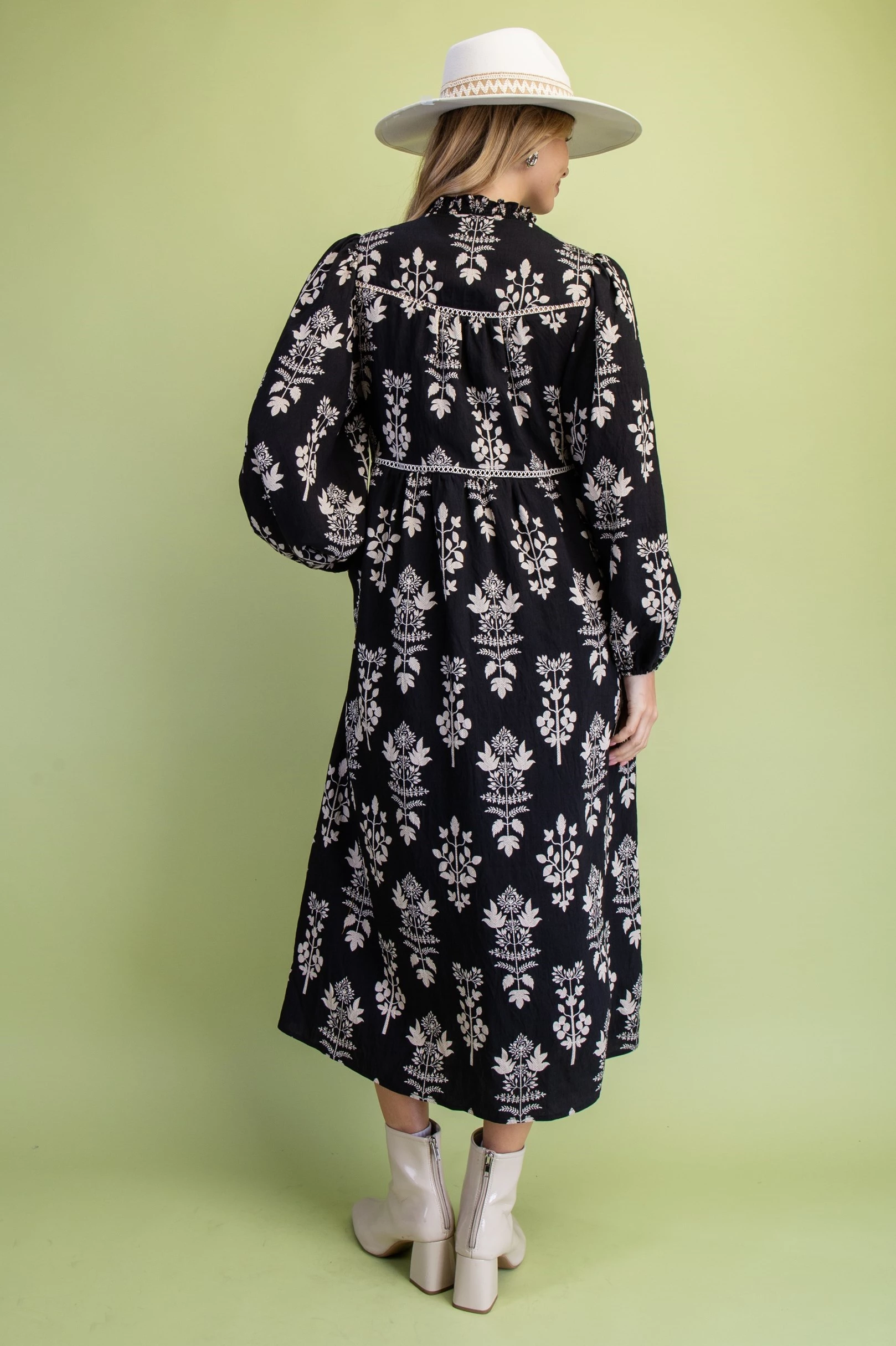 Floral Print Smocked Neck Midi Dress with Trim Details. The Dress is Lined