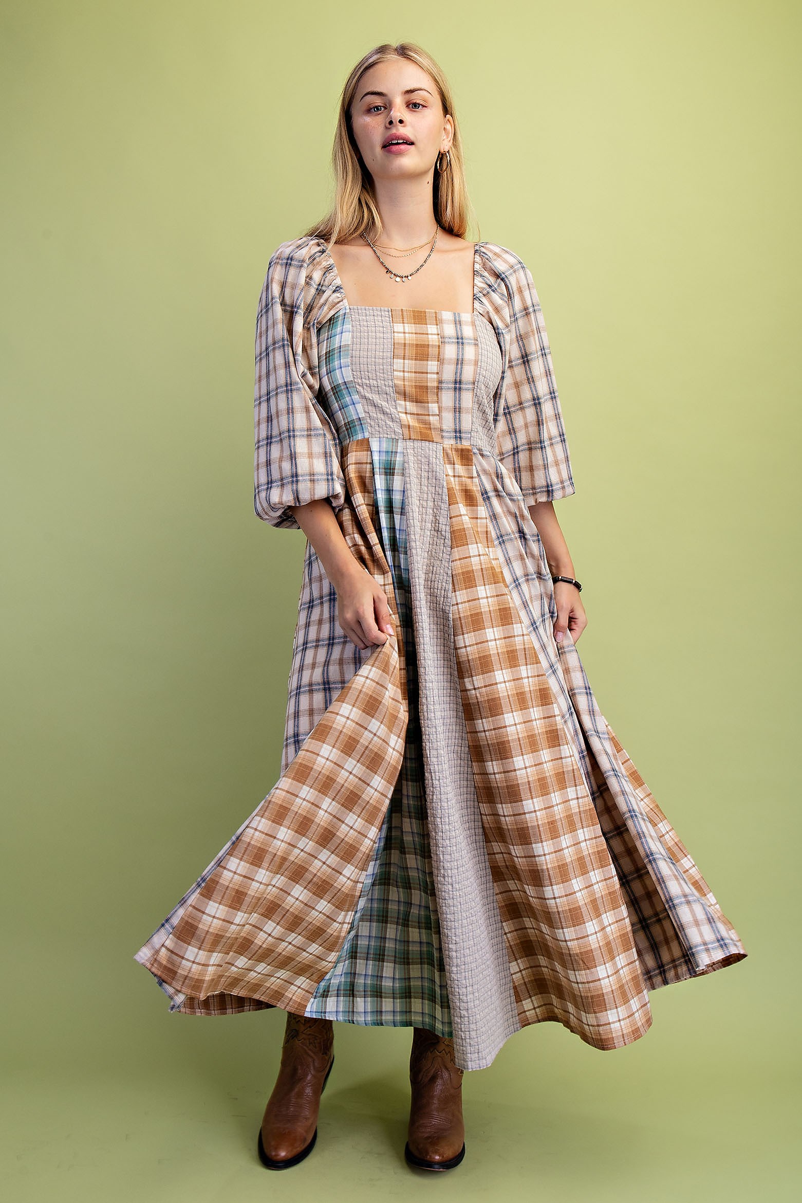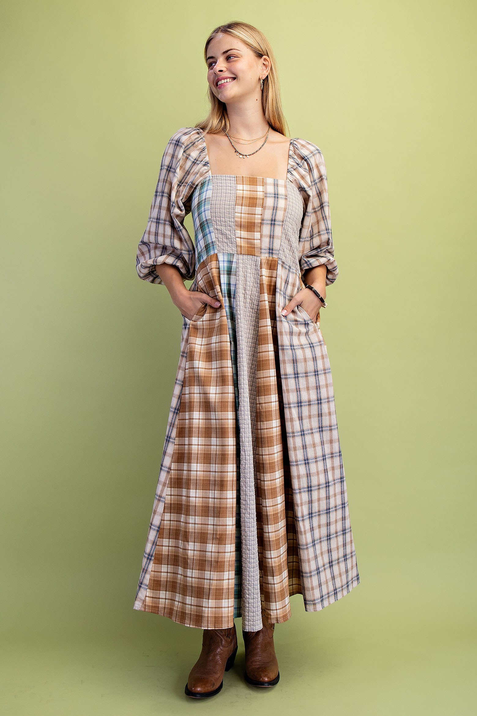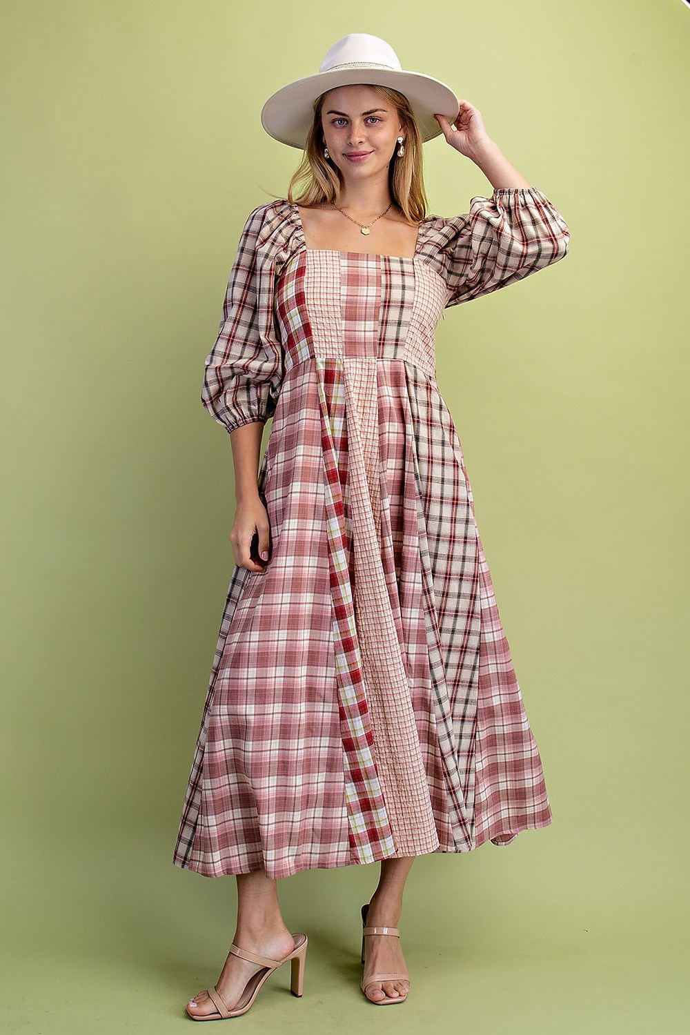 Western Mixed Plaid Midi Dress with a Smocked Back. The Dress is Lined