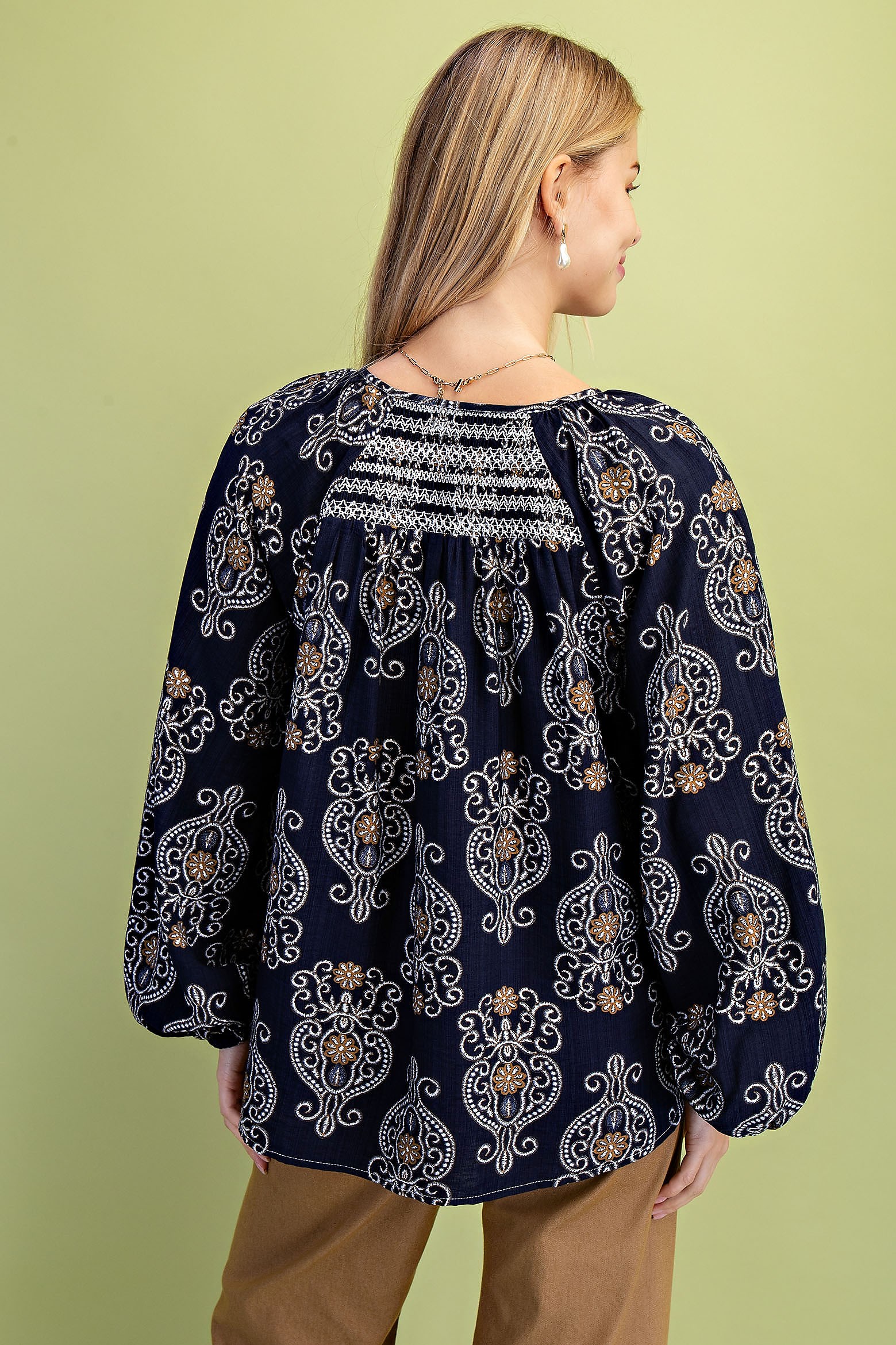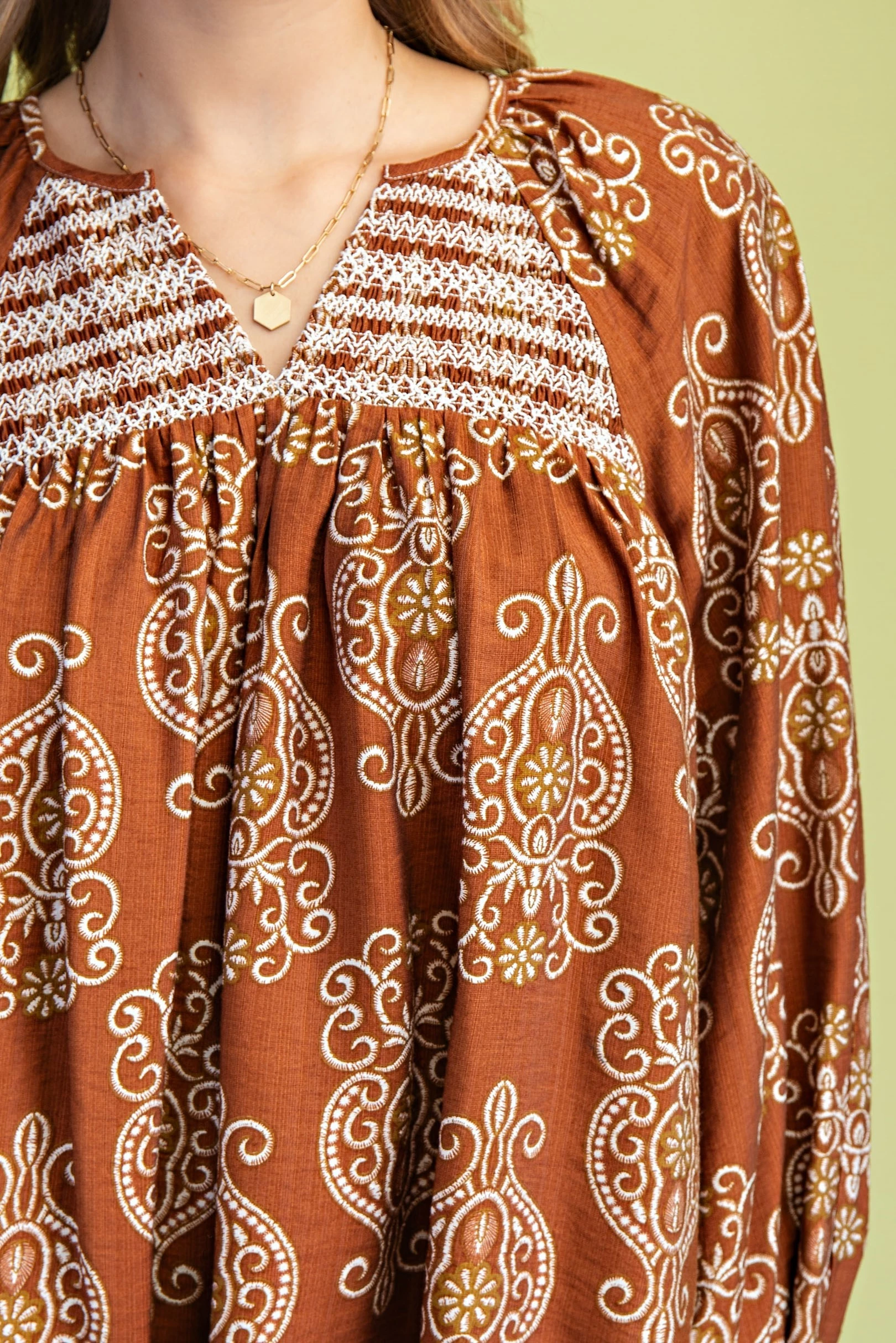 Printed Balloon Sleeve V-Neck Blouse with Decorative Smocking on Front and Back