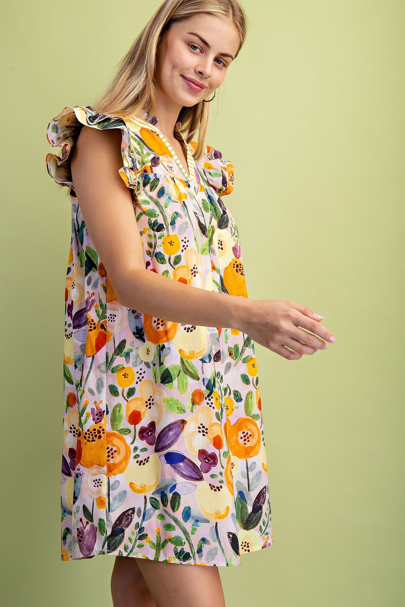 Printed V-Neck Mini Dress with a Ruffled Neck and Short Puff Sleeves. The Dress is Lined