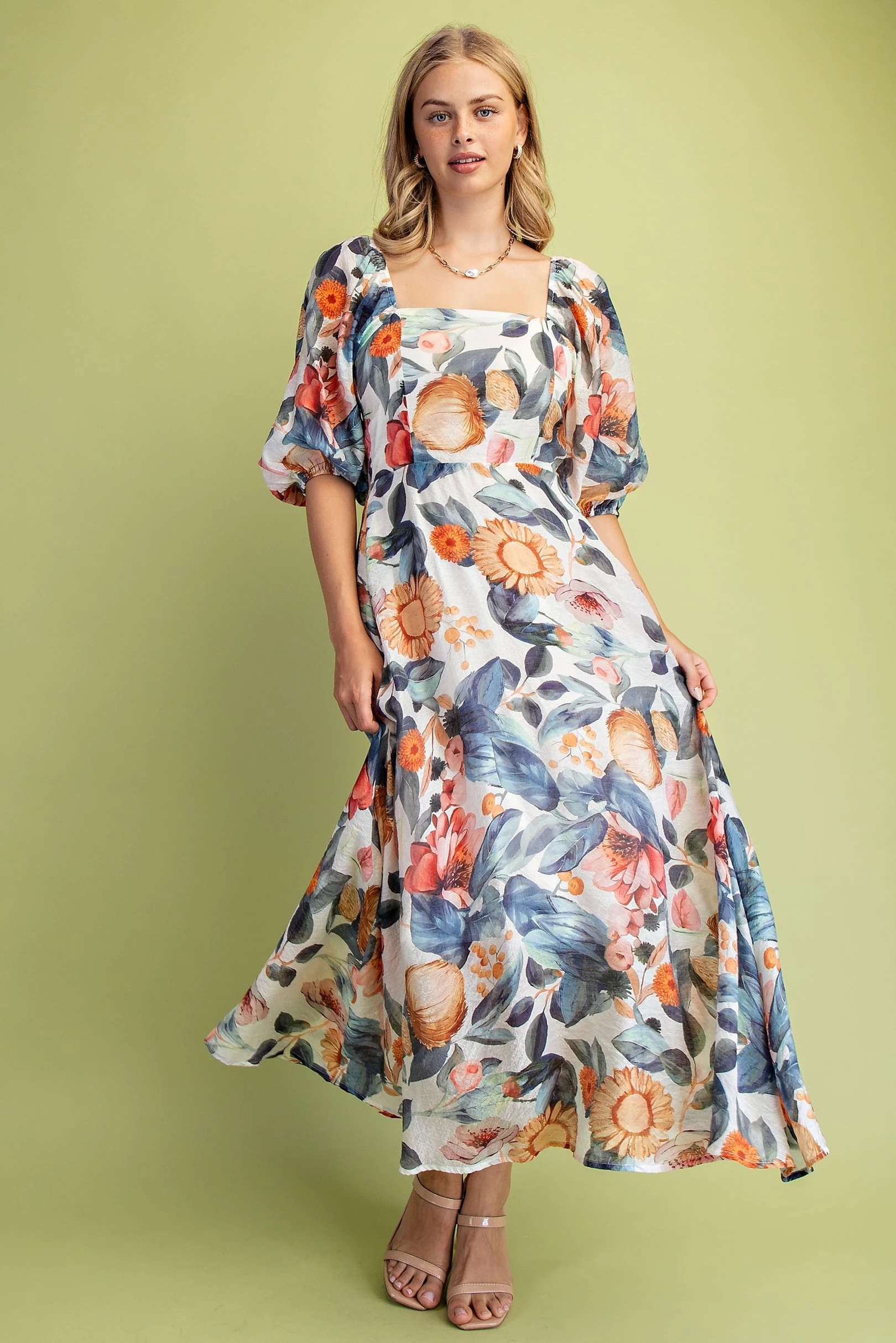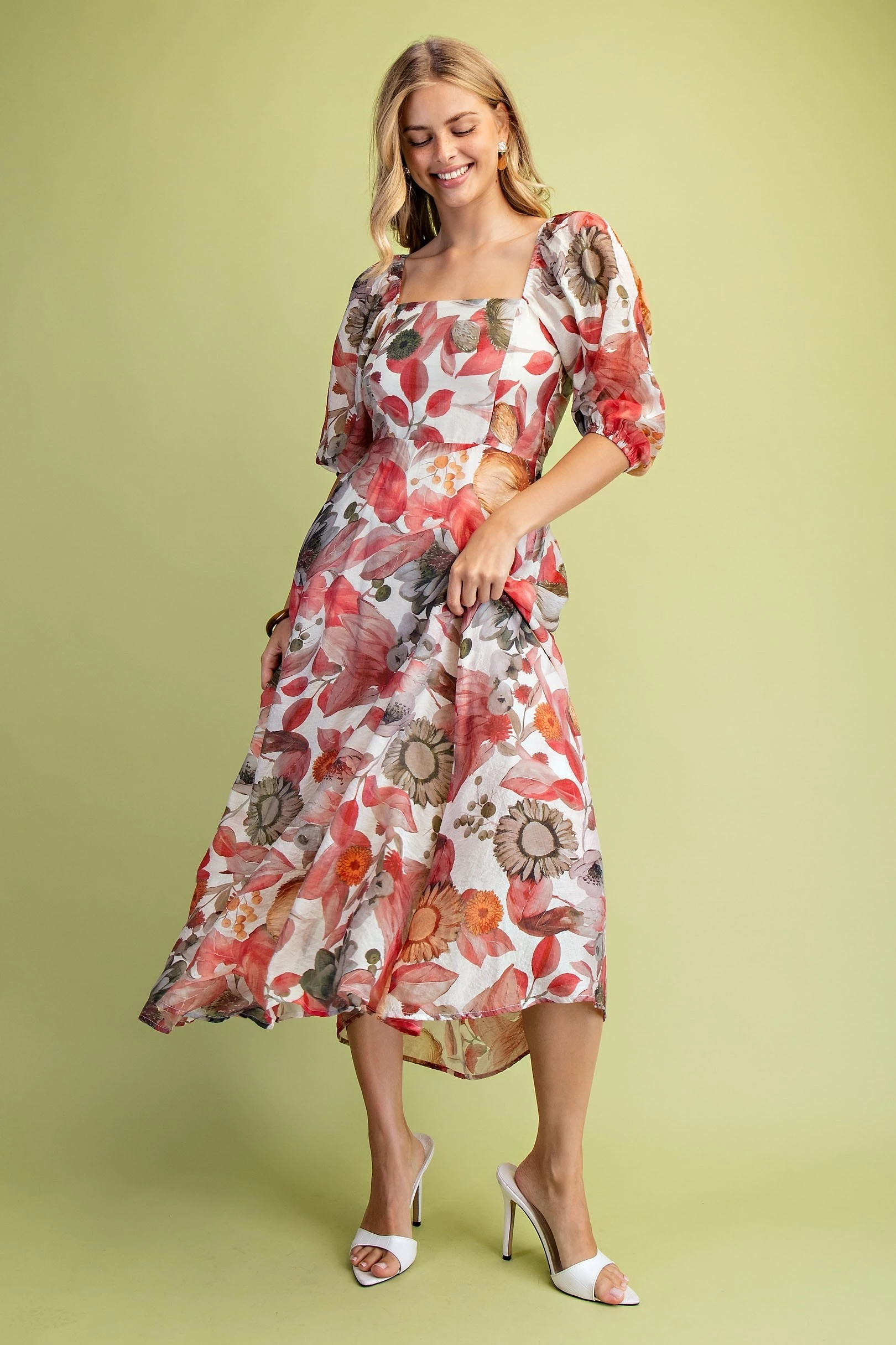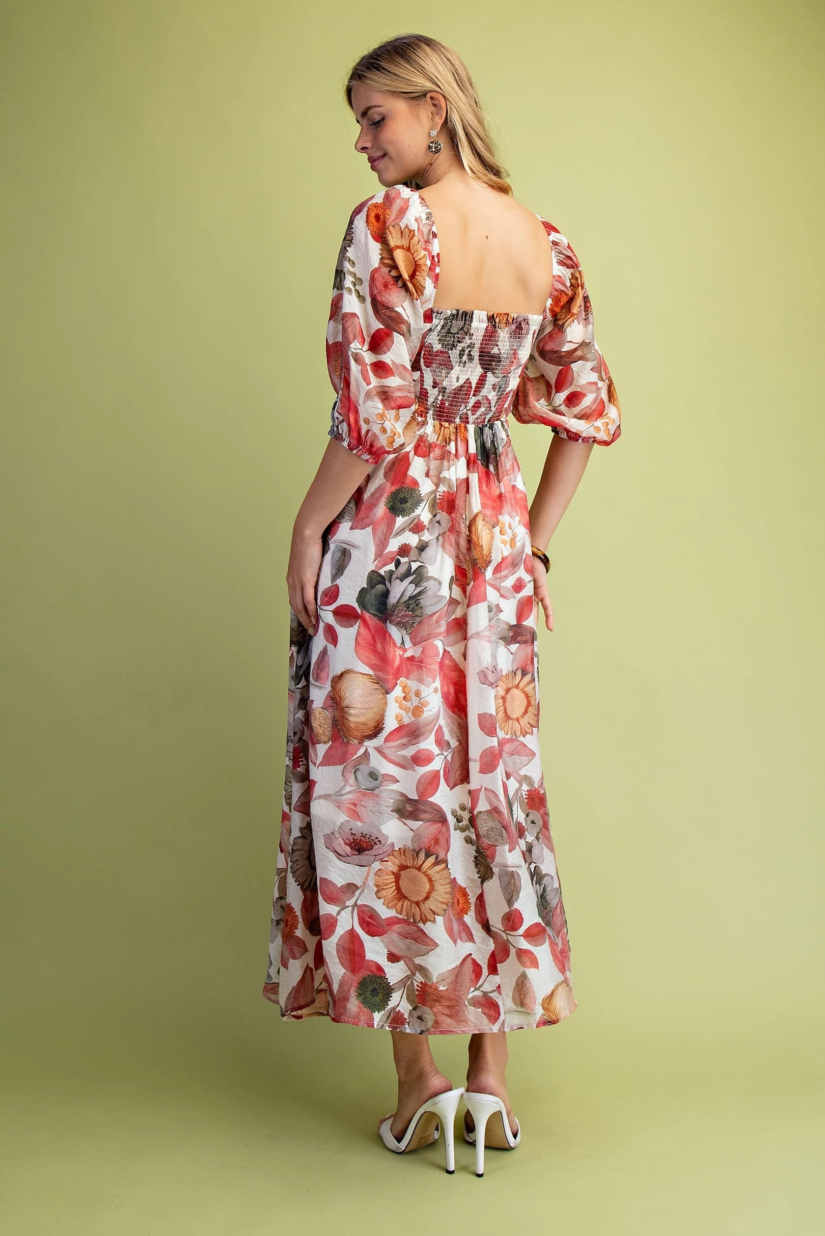 Floral Print Midi Dress with a Smocked Back and Elastic Banded Arm. The Dress is Lined