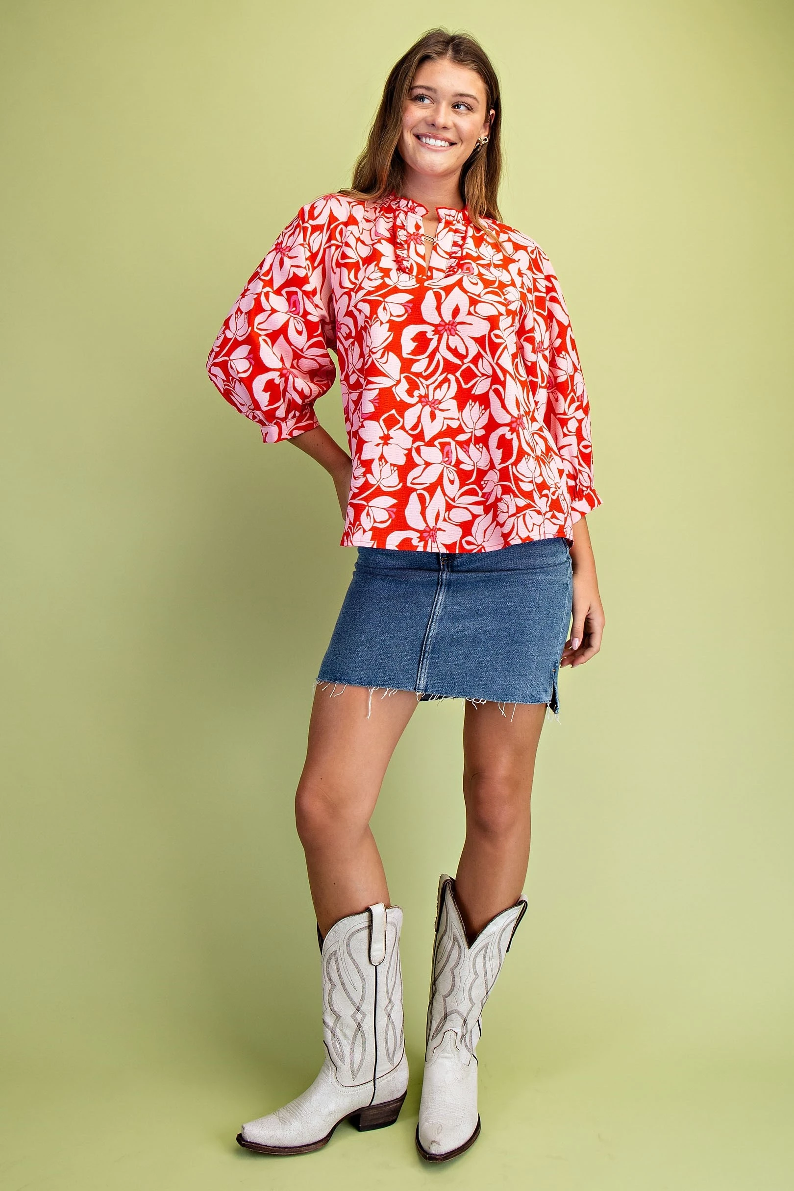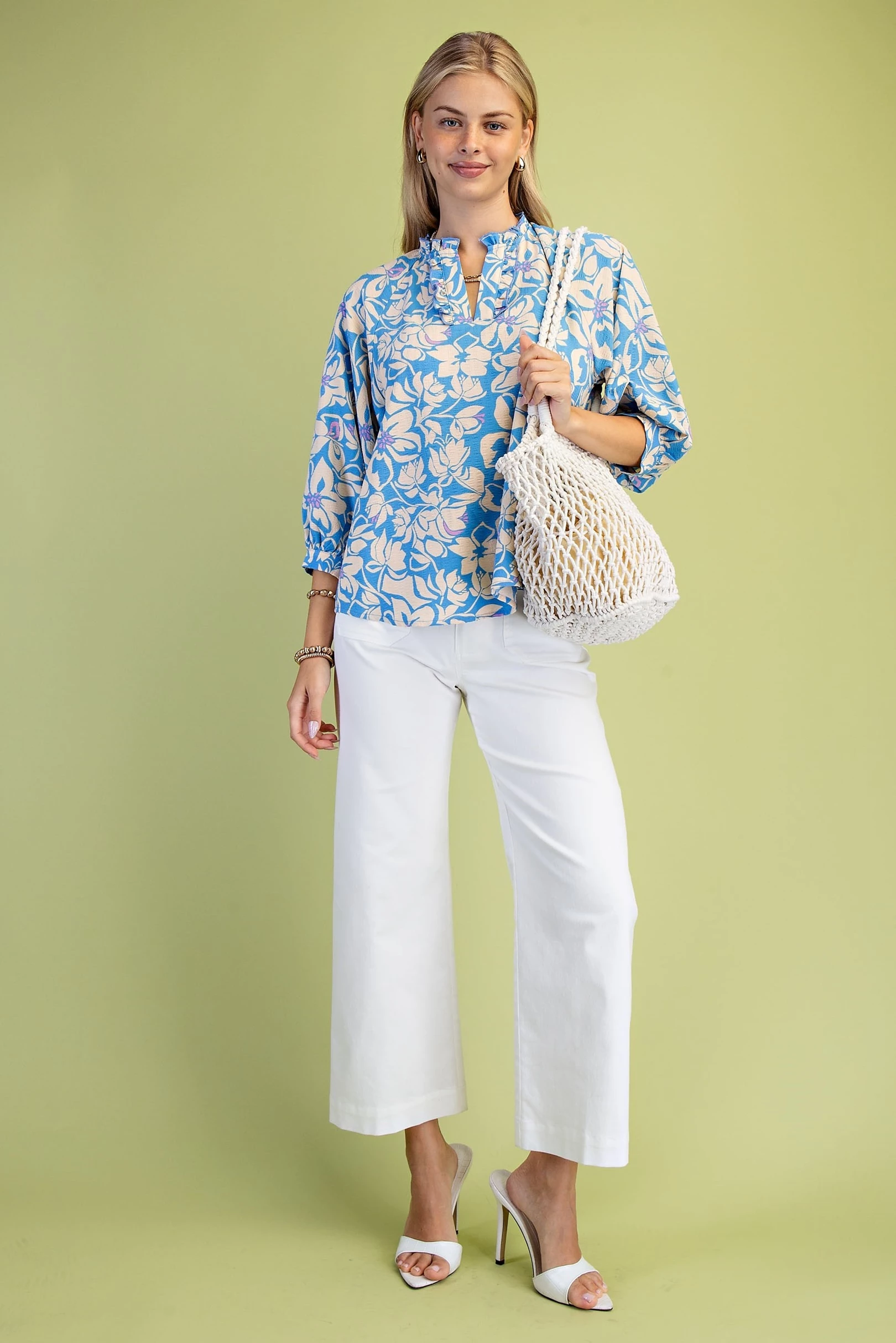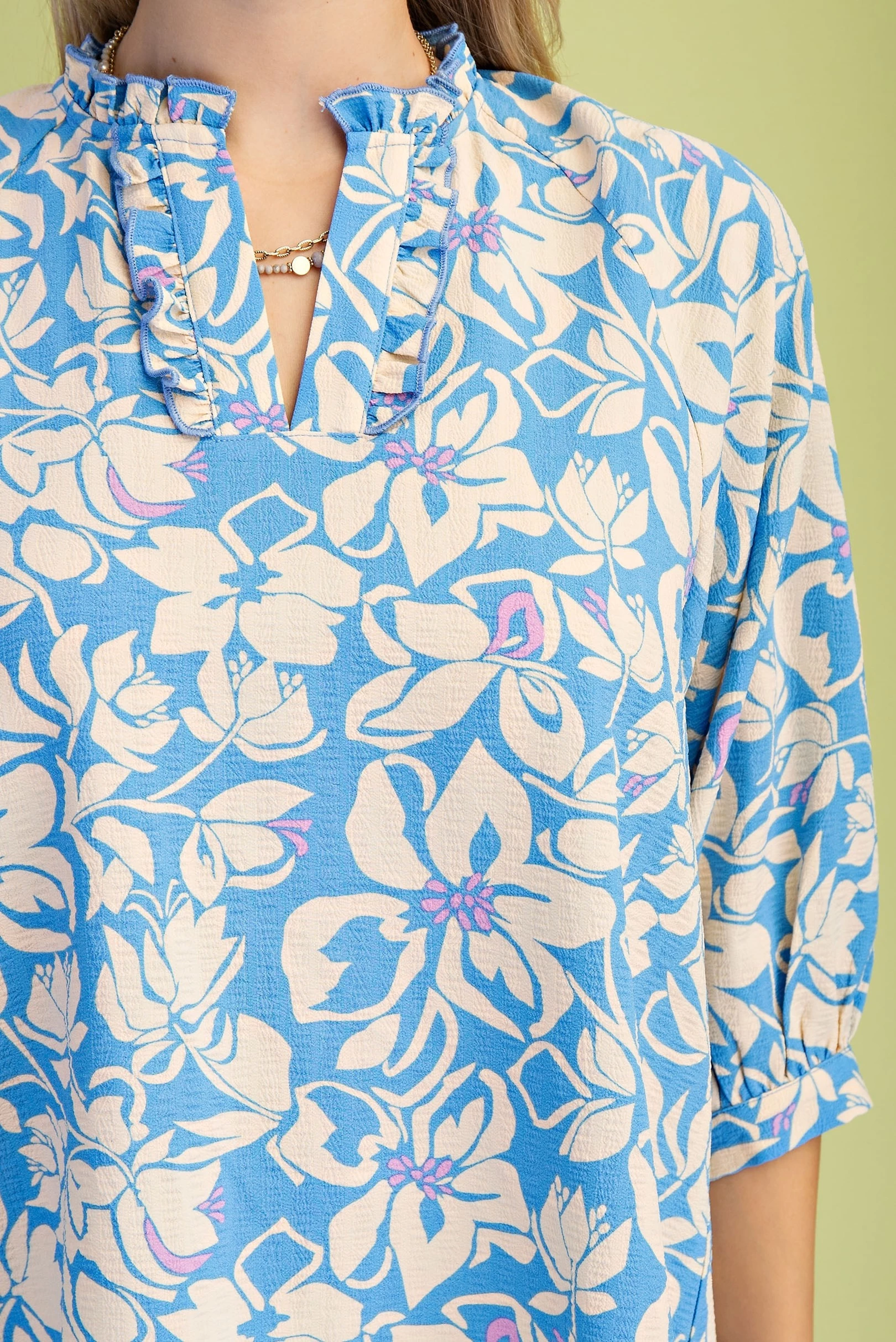 Floral Print Textured Top with 3/4 Length Sleeves and a Ruffled Neck