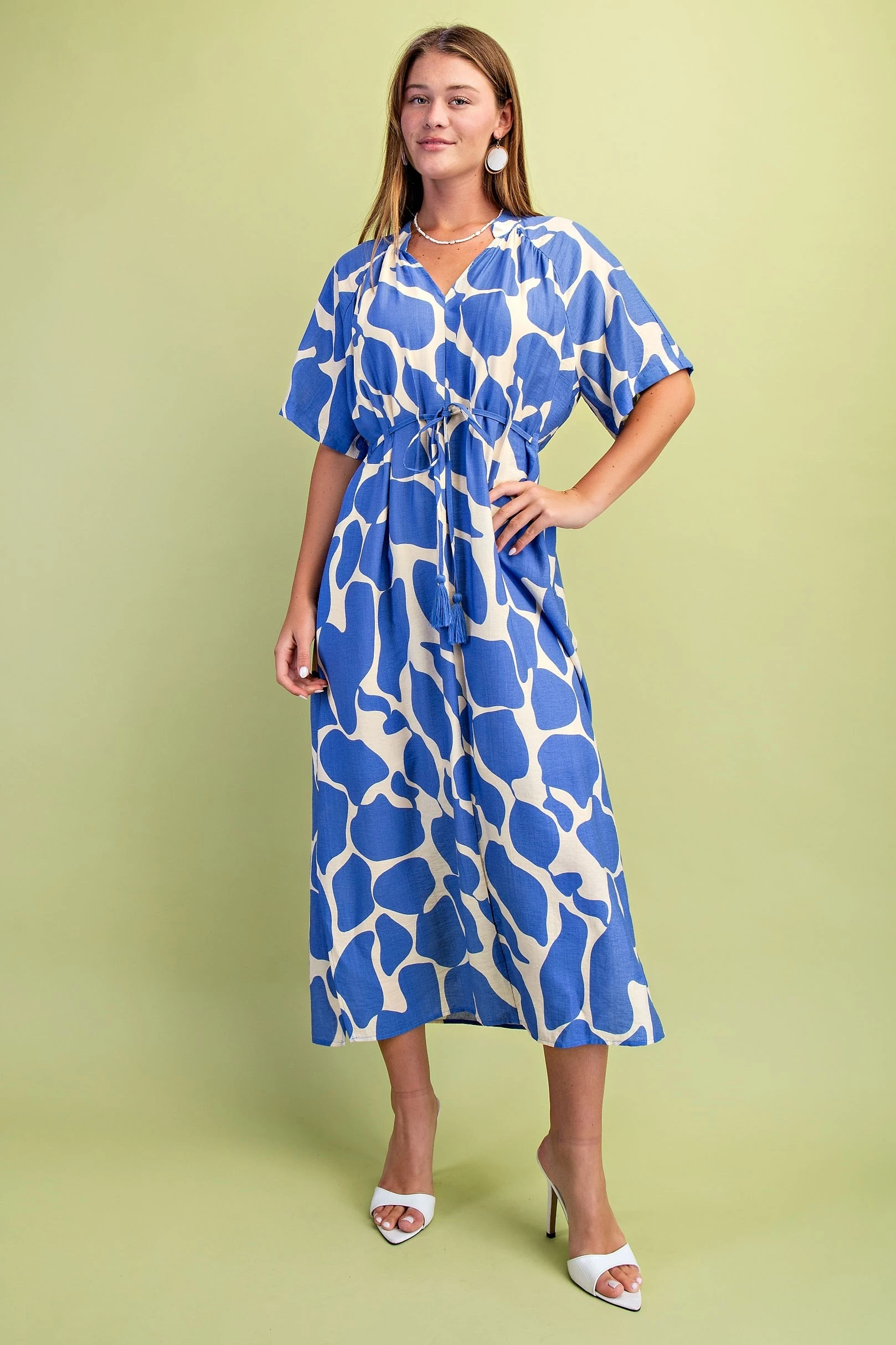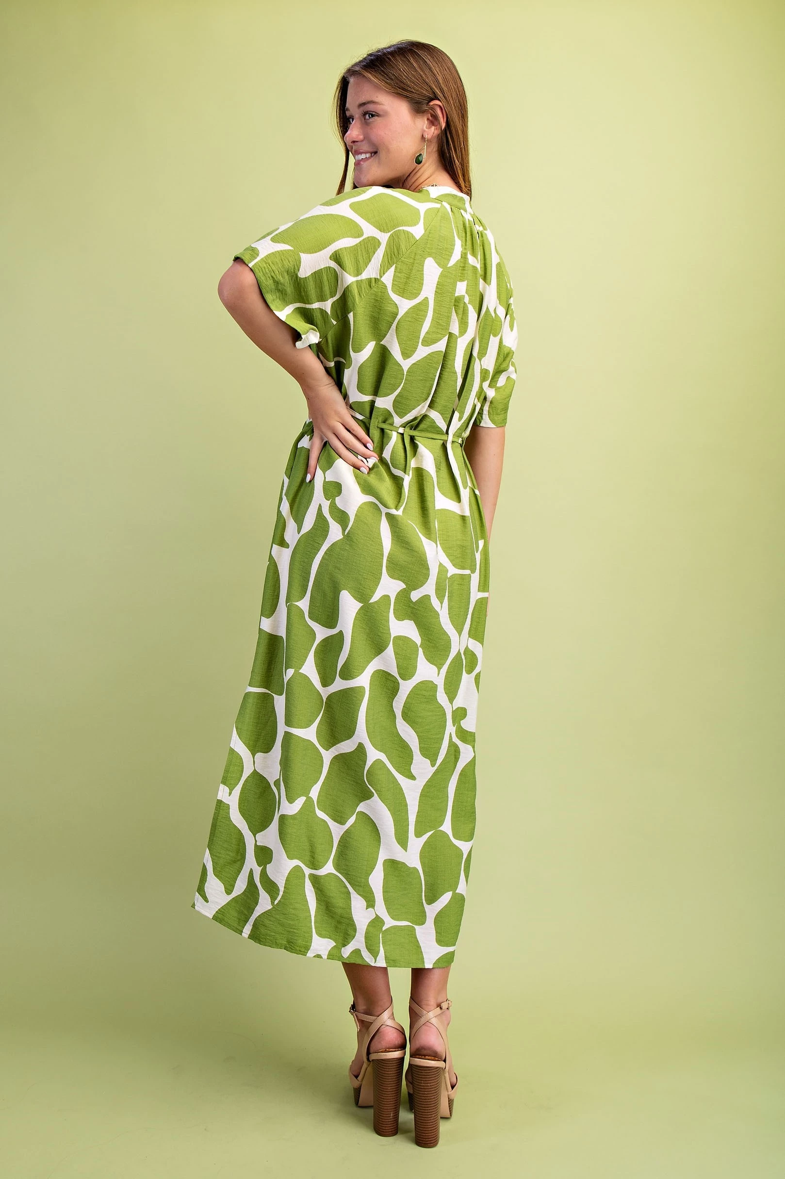 Giraffe Print Midi Dress with a Tassel Belt. The Dress is Lined