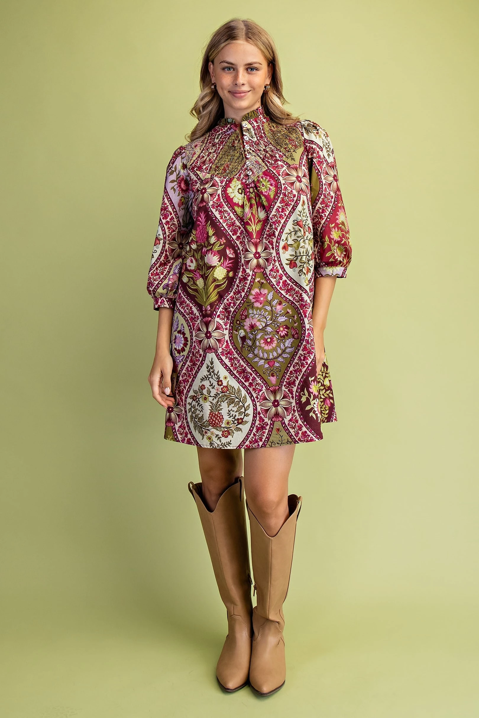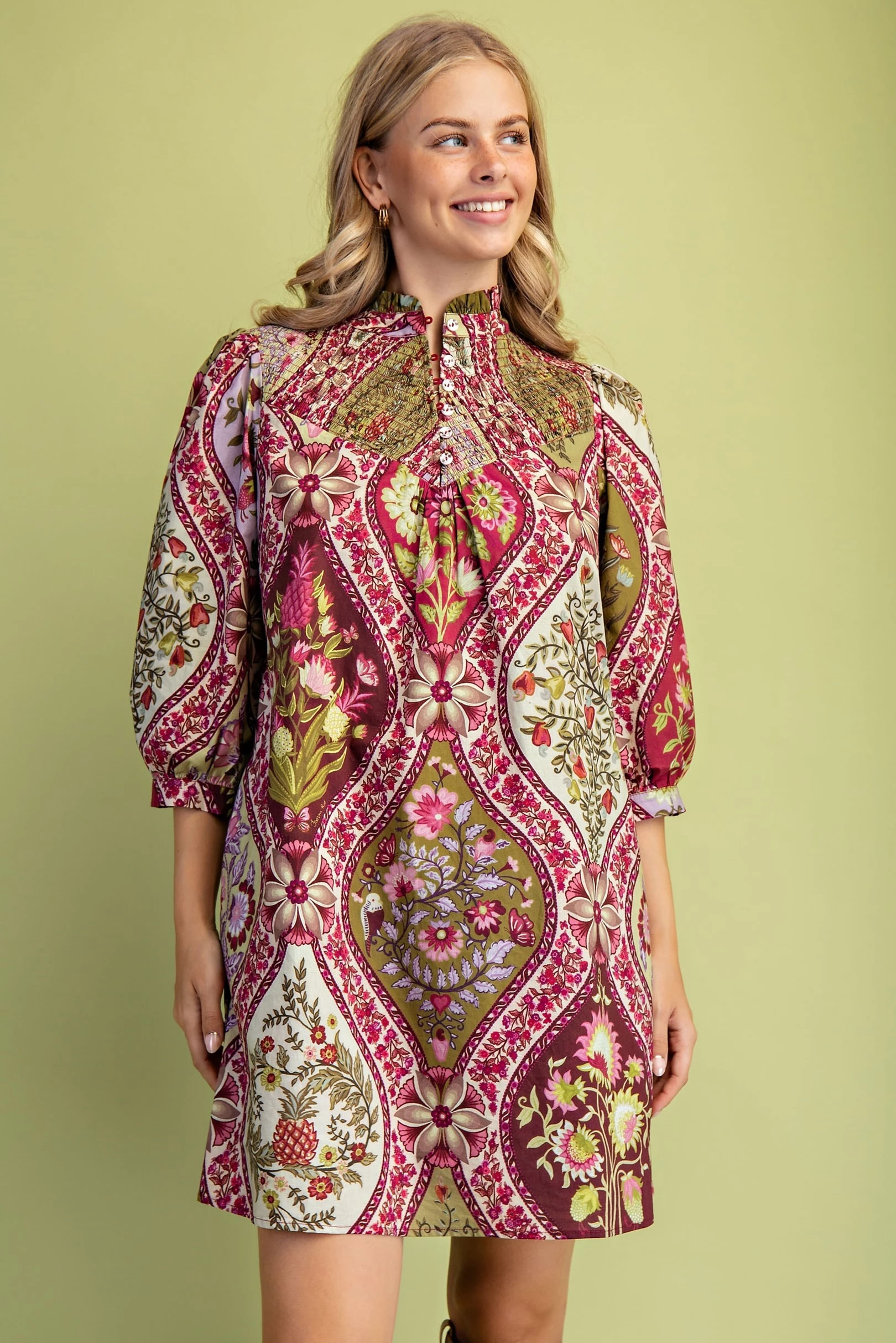 Printed Mini Shirt Dress with a Pleated Waist. The Dress is Lined