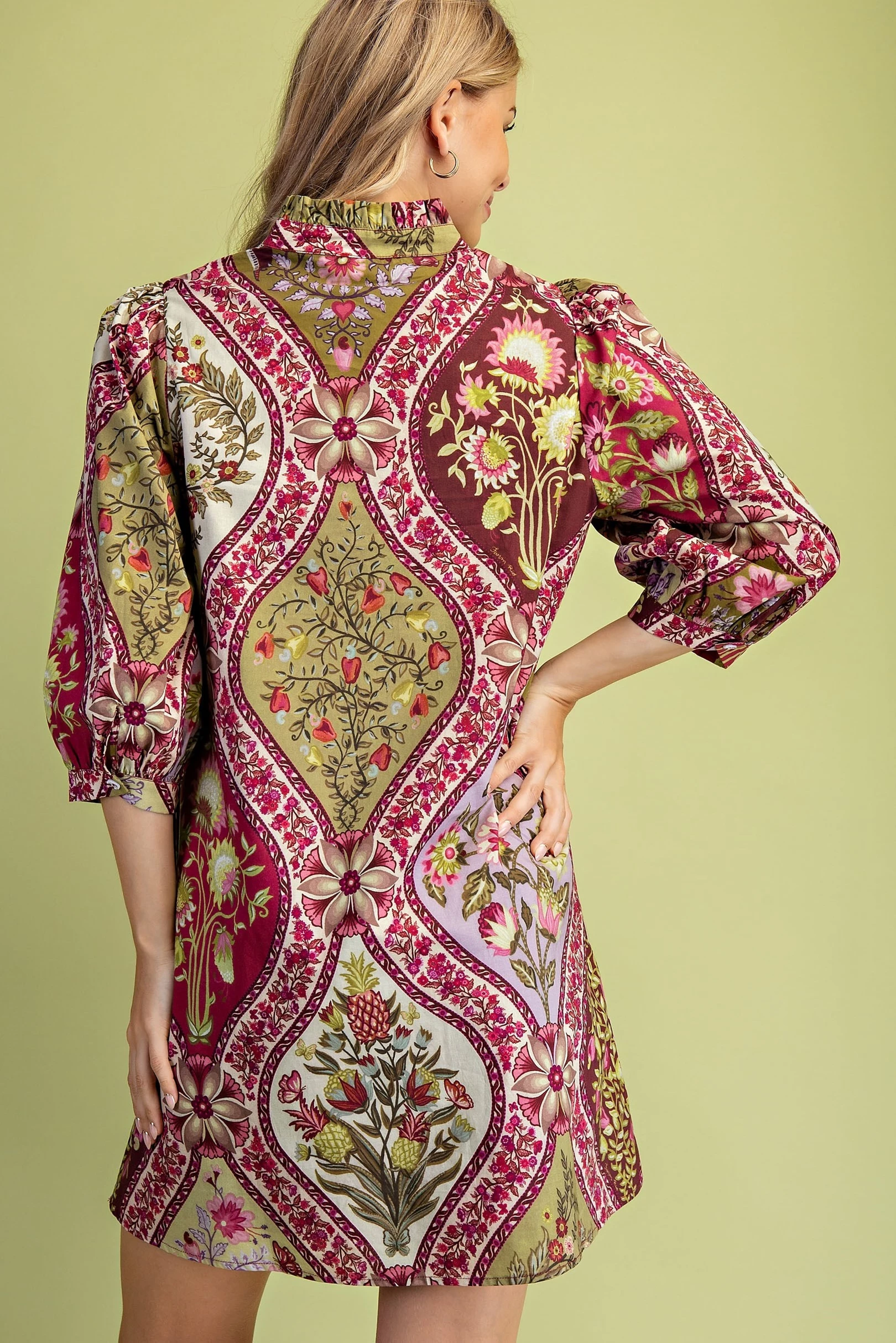 Floral Print Button Down Top with 3/4 Length Gathered Balloon Sleeves