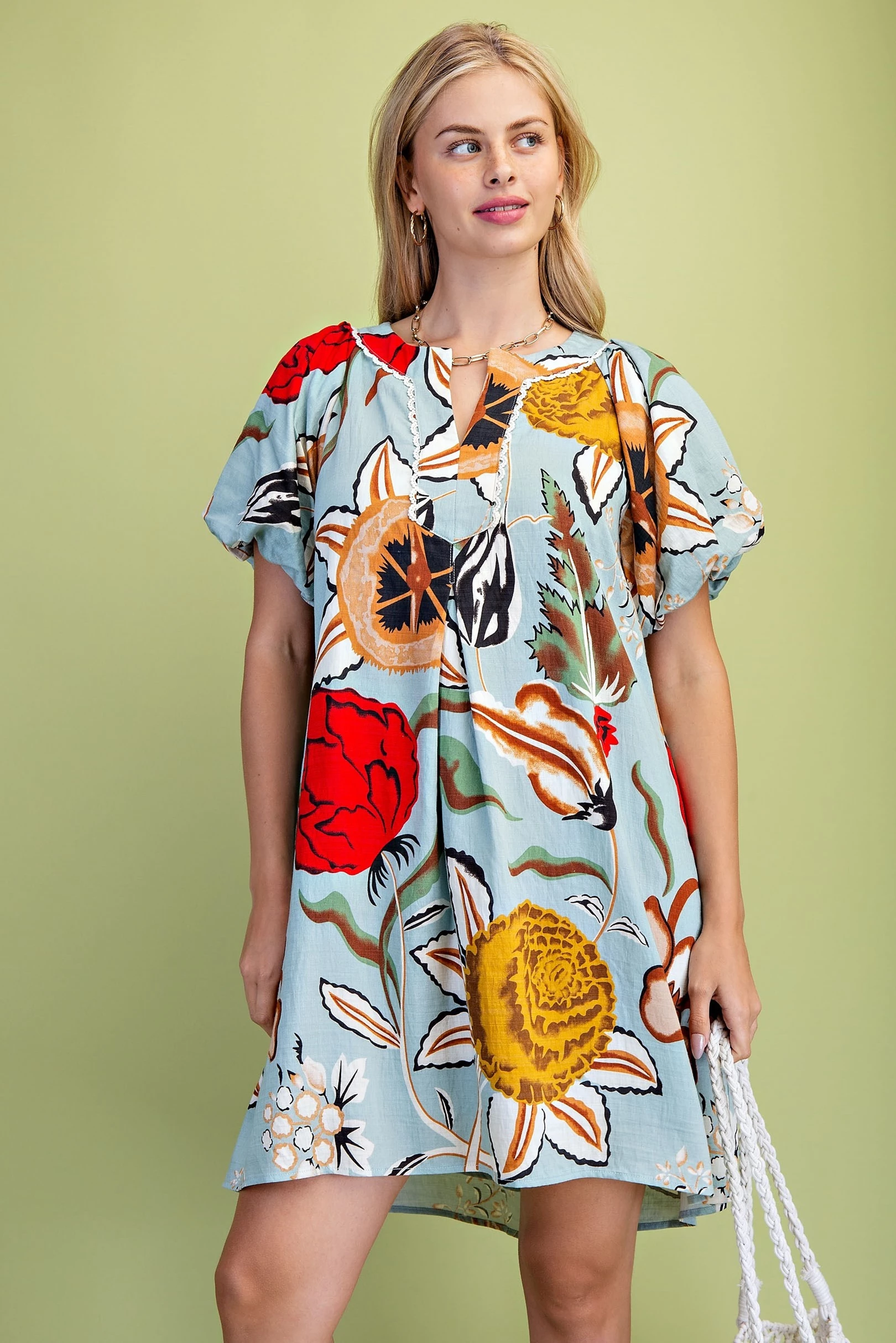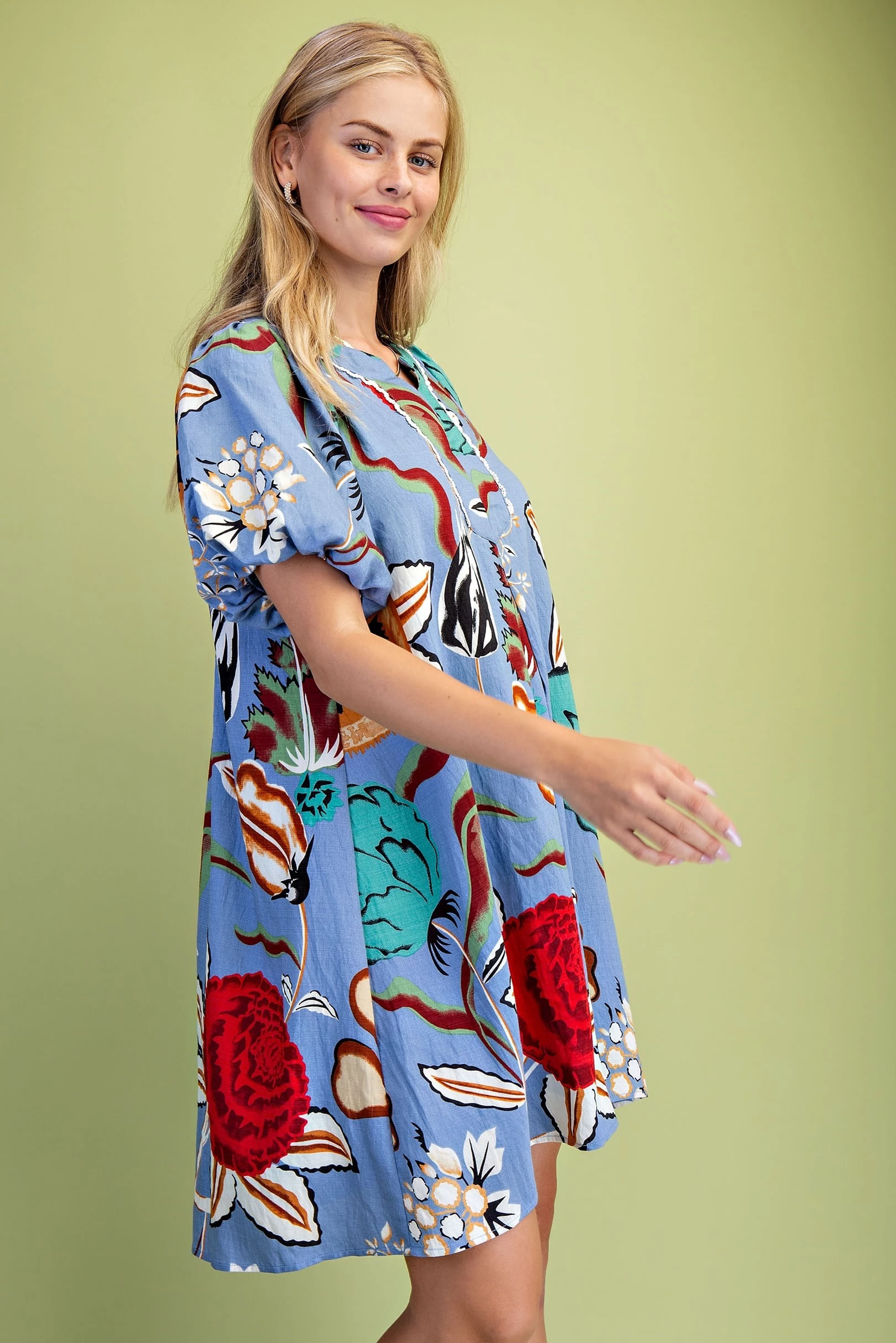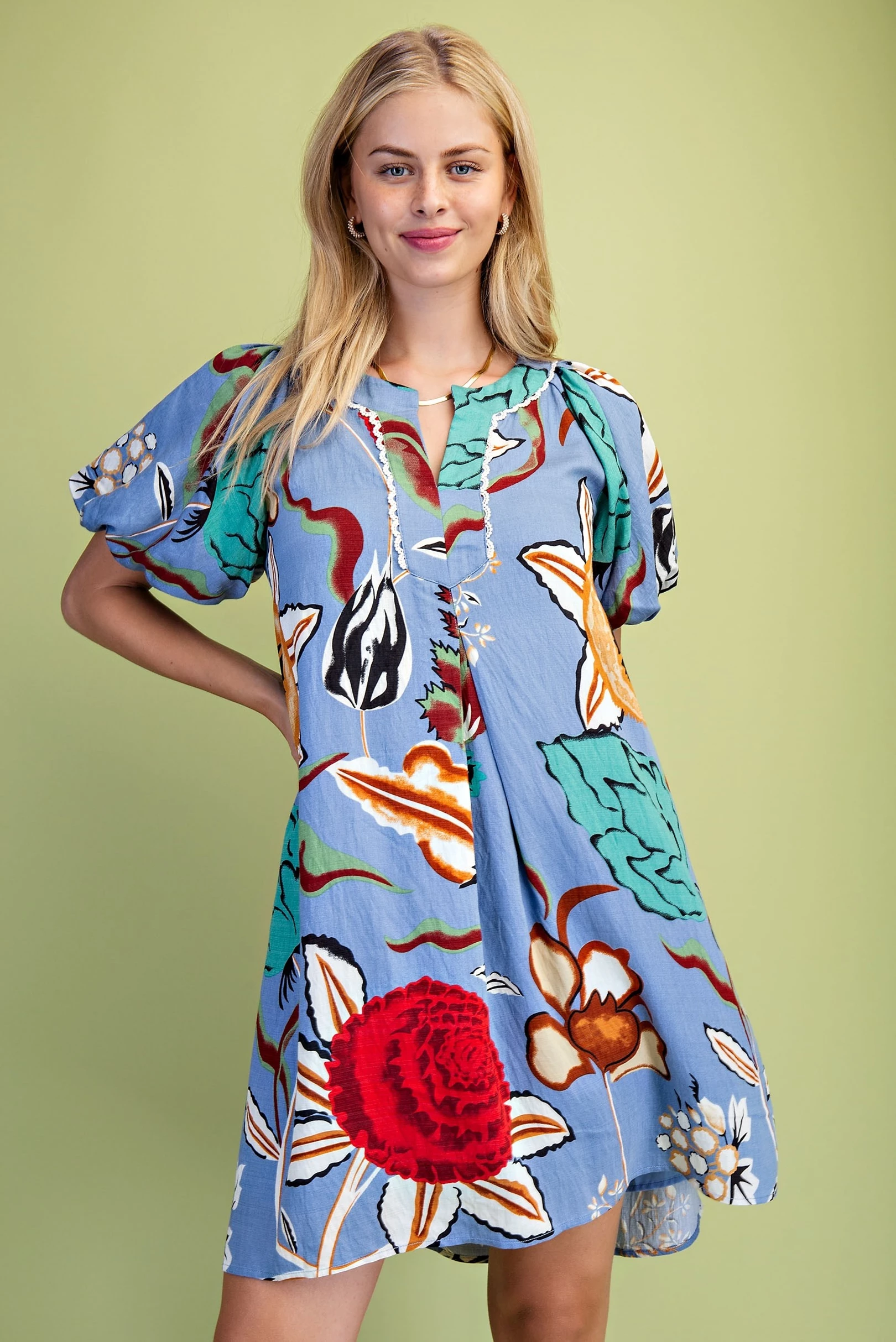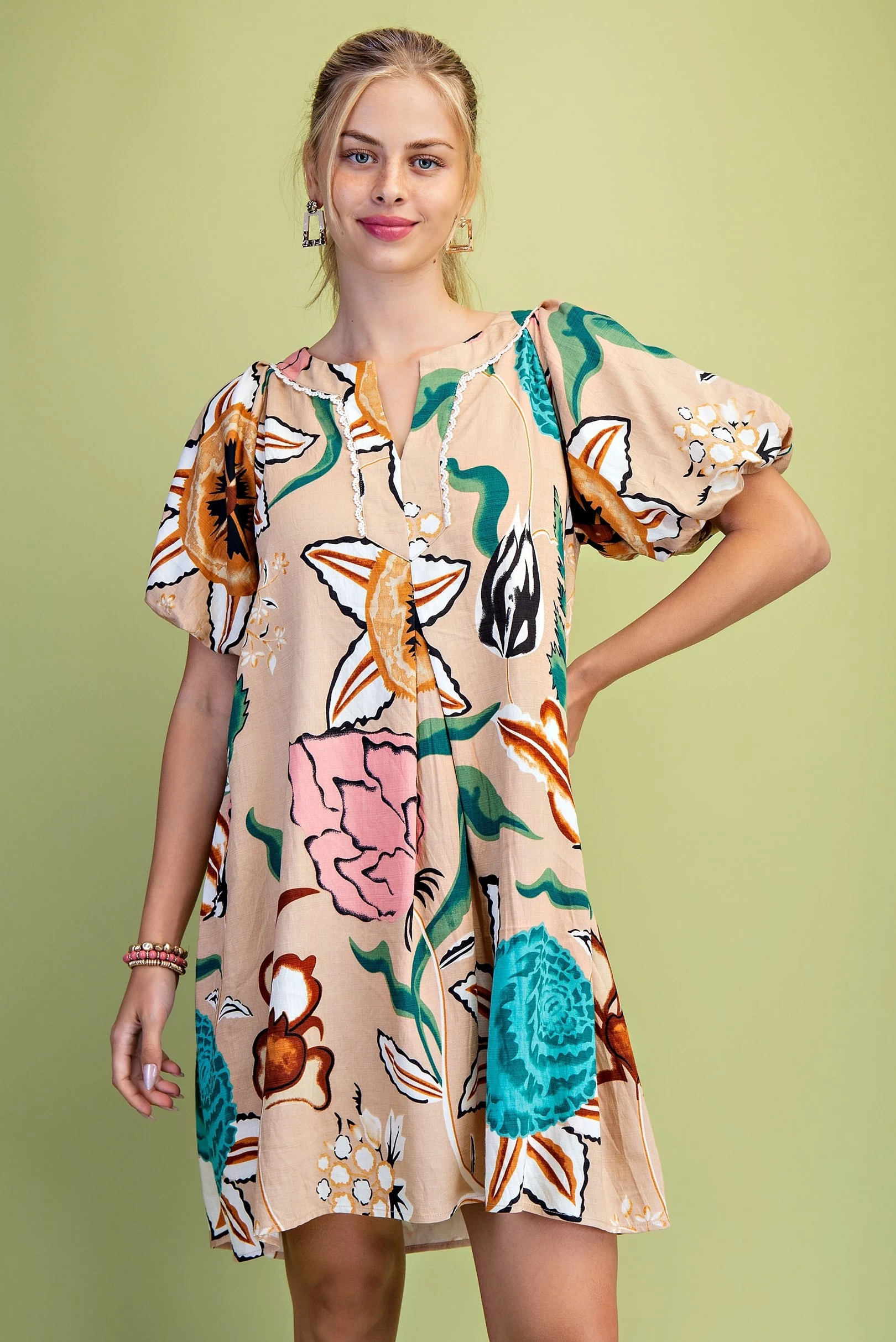 Linen V-Neck Mini Dress with Contrasting and Embroidered Appliqué Design Details. The Dress is Lined