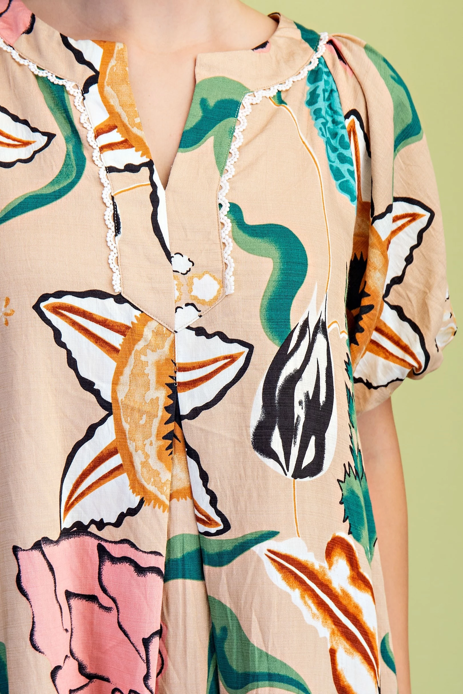 Floral Mock-Neck Top with Contrasting Stripe Accents and Decorative Trim