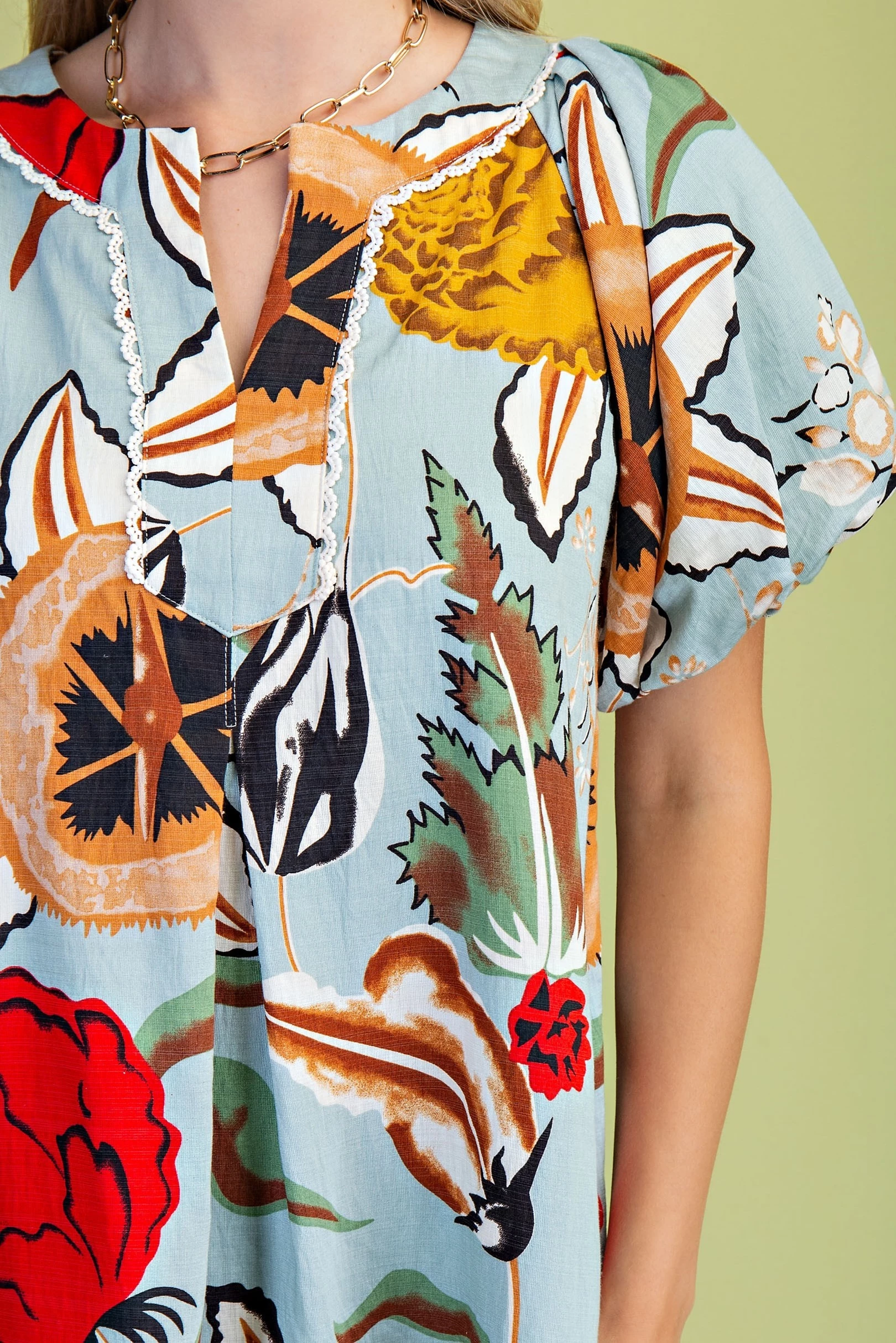 Floral Printed Button Down Top with 3/4 Length Gathered Balloon Sleeves