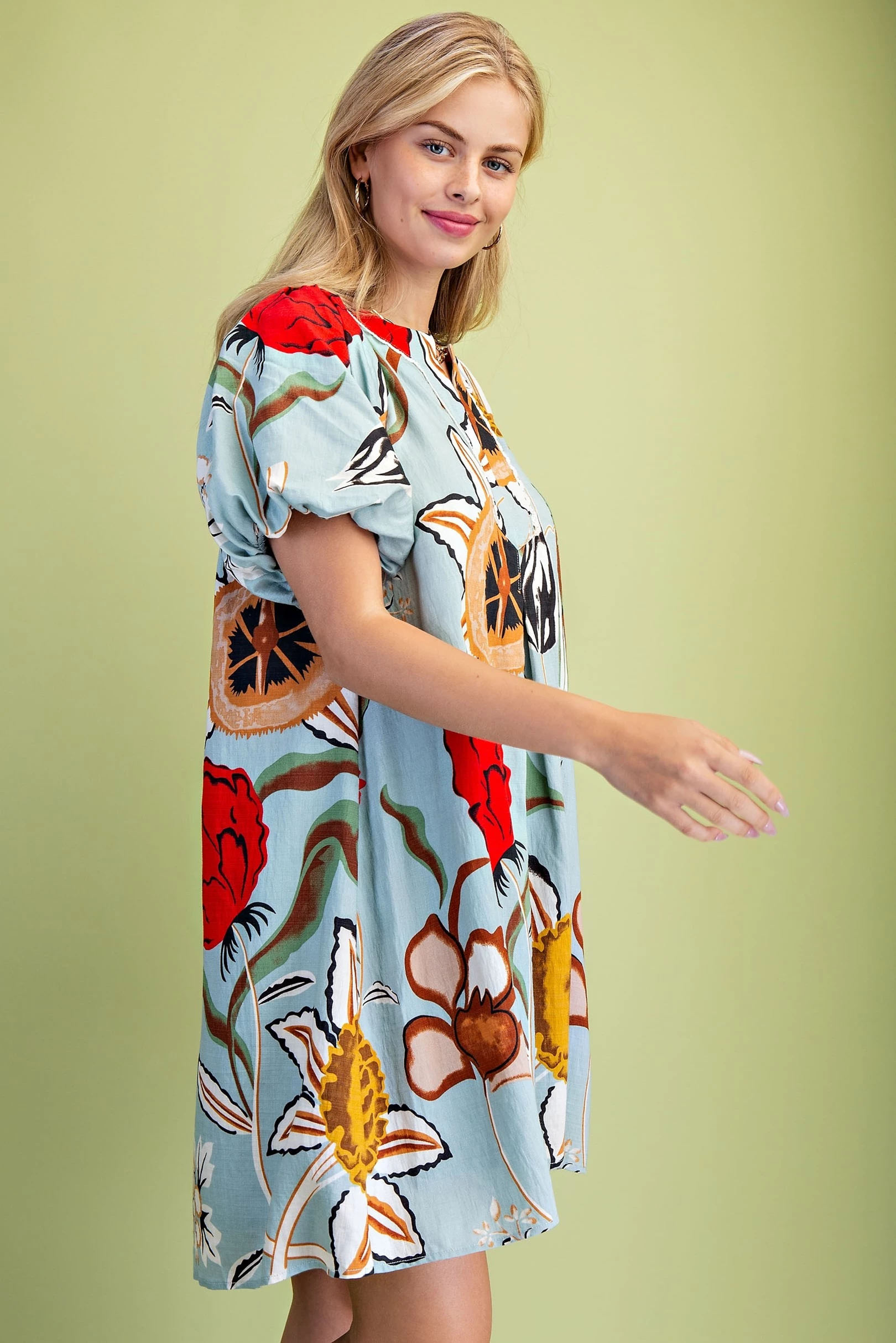 Floral Print Ruffled Neck Mini Dress with Contrasting Stripe Accents and Layered Ruffle Sleeves. The Skirt is Lined