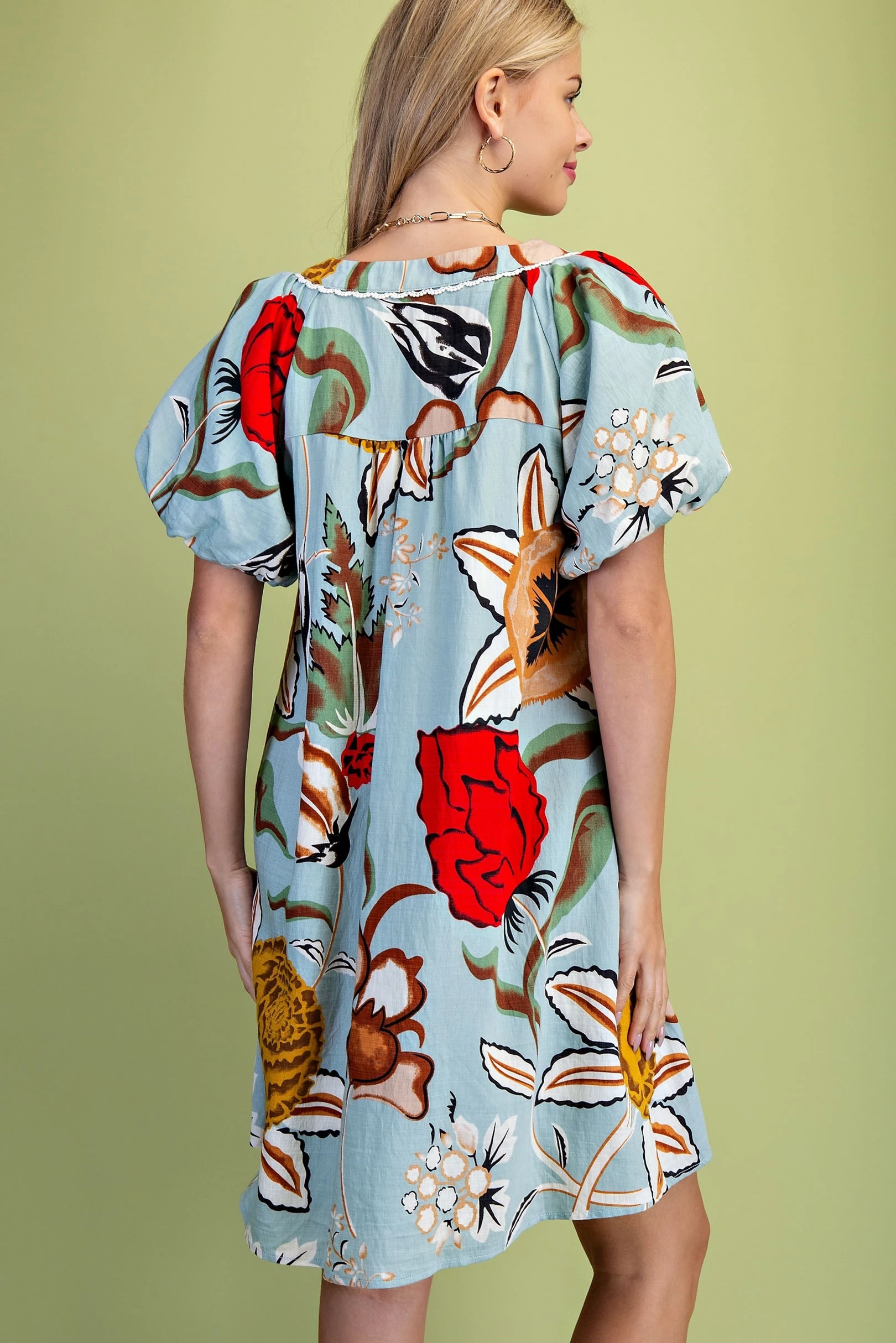 Linen V-Neck Dress with Embroidered Appliqué Design Details. The Dress is Lined