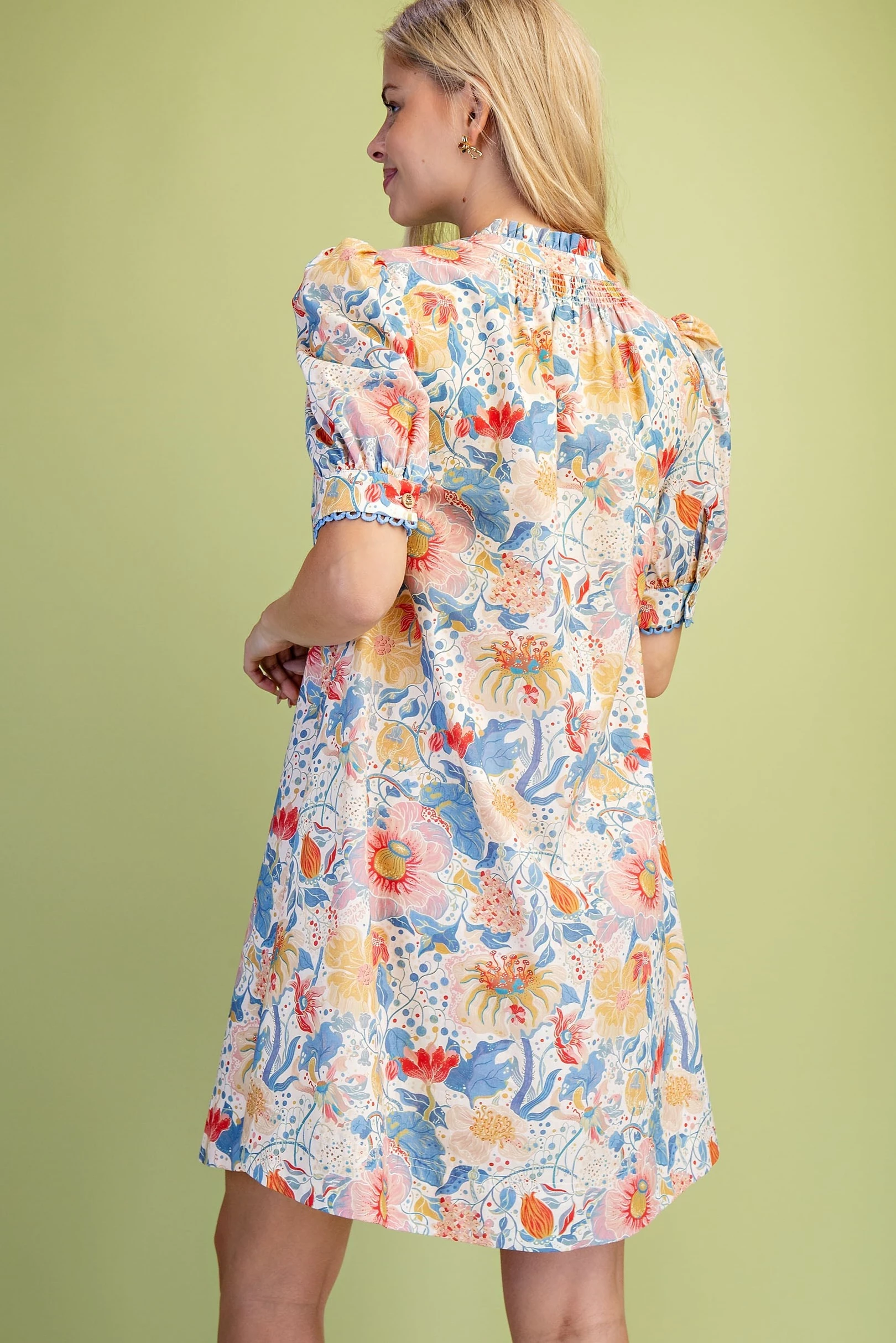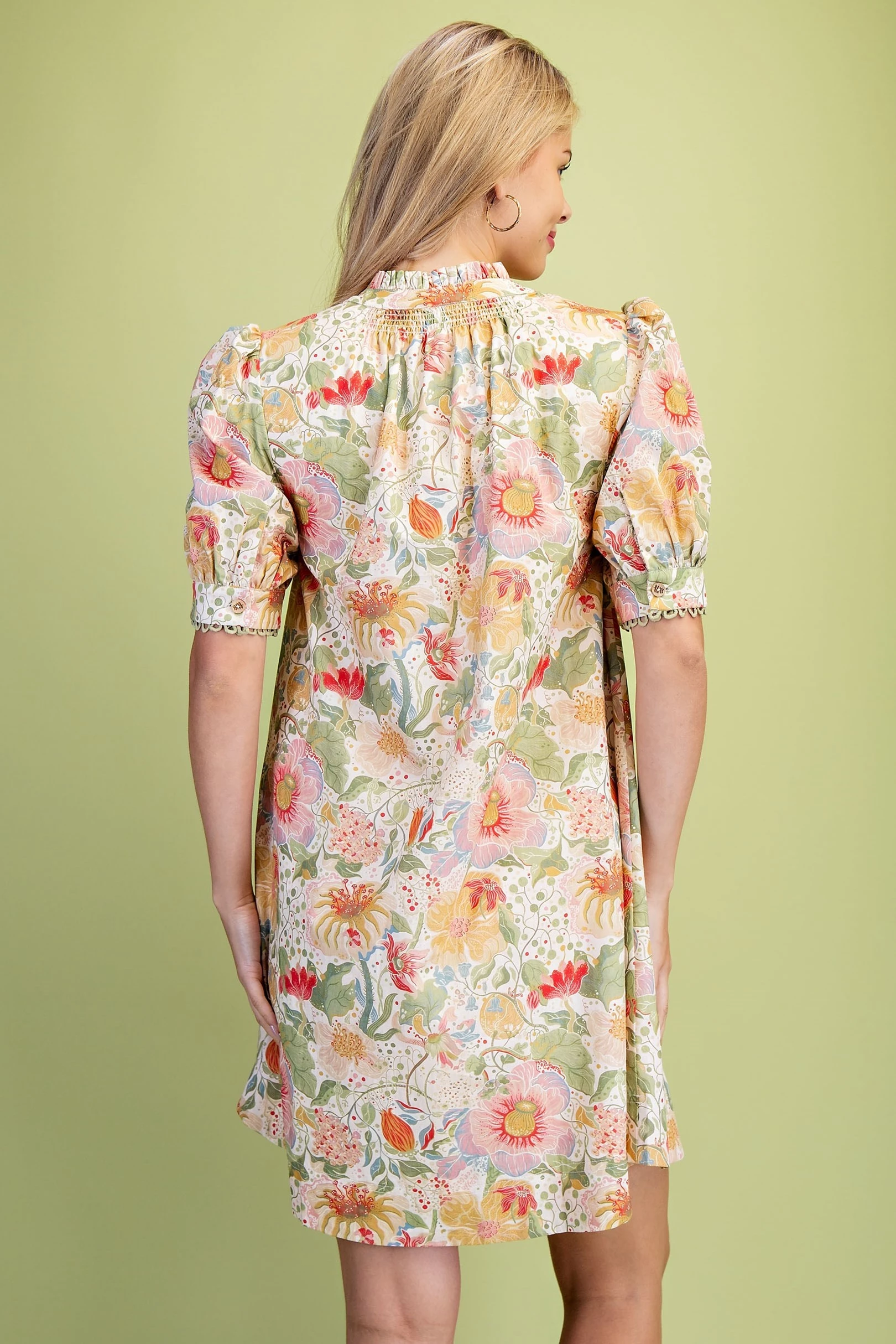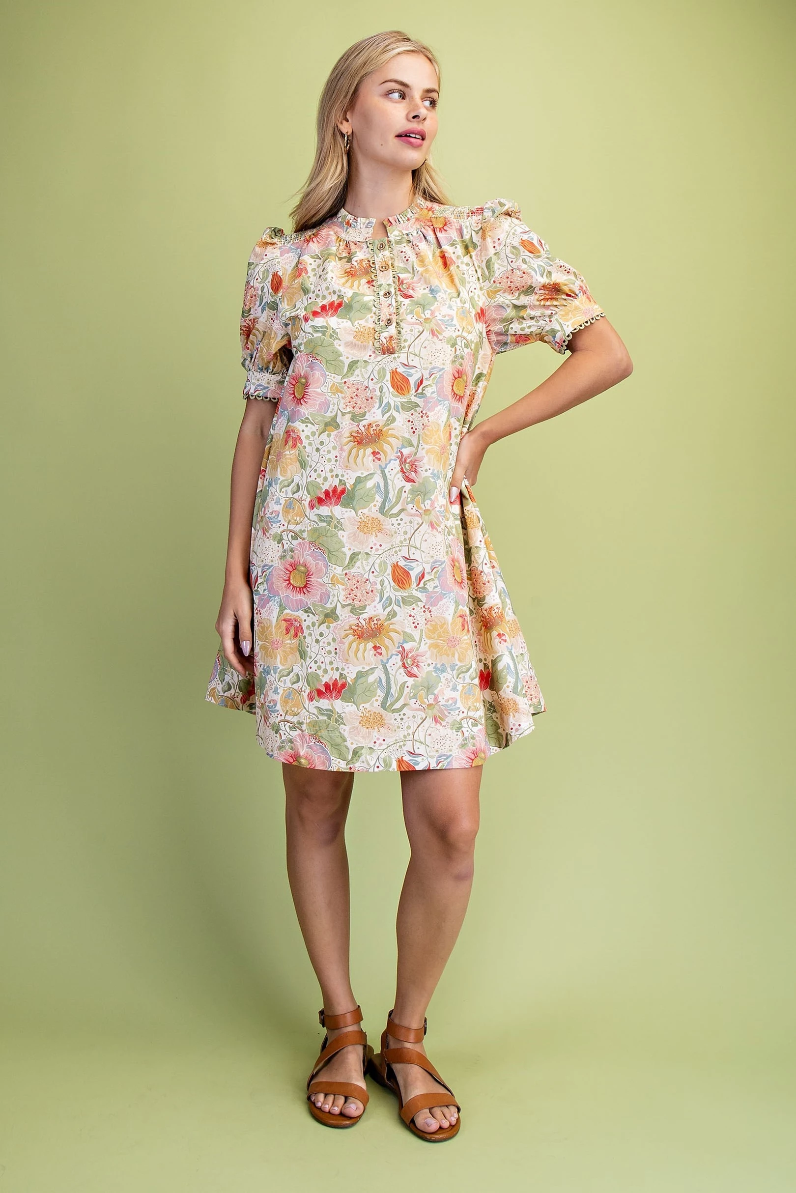 Muted Botanic Print Puff Sleeve Dress with Trim and Smocking Details. The Dress is Lined