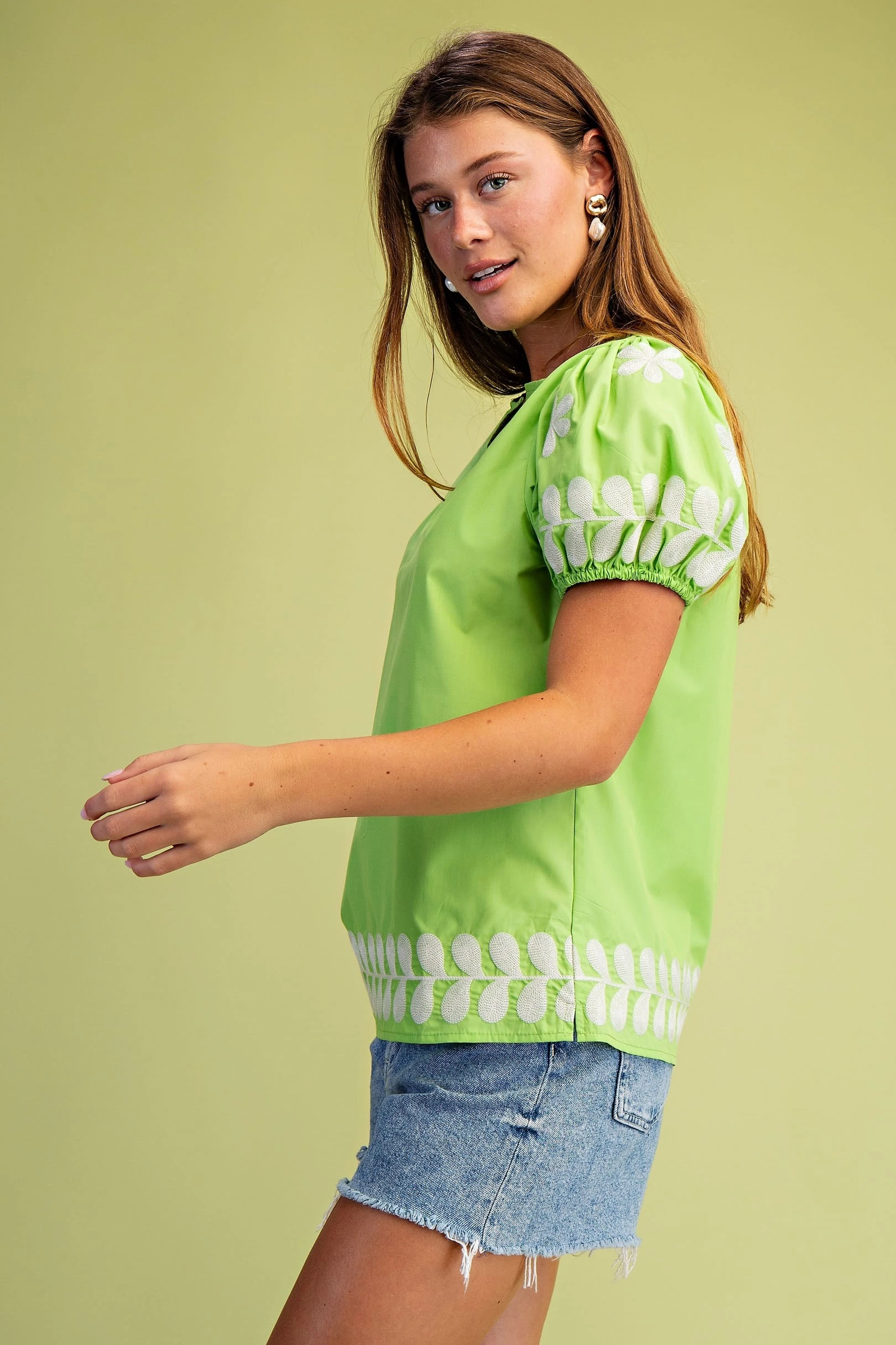 Embroidered Top with a Ruffled Neck and Short Puff Sleeves