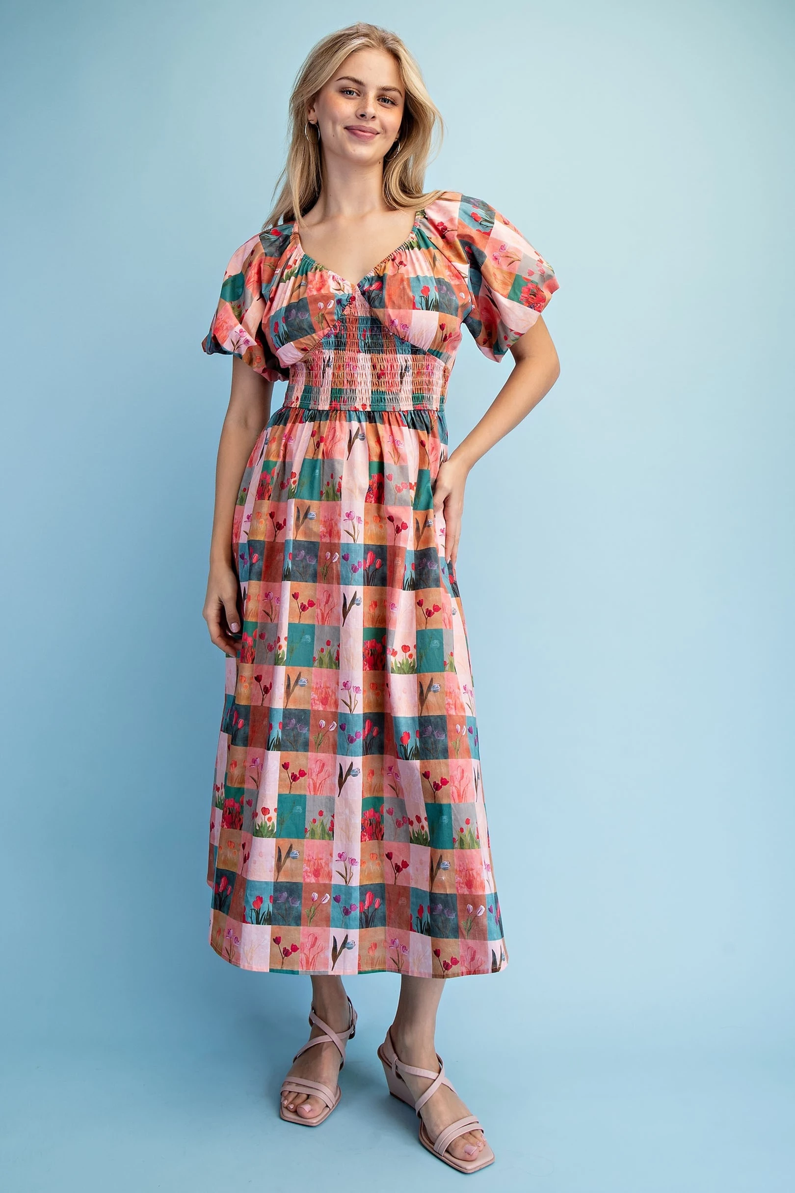 Printed V-Neck Midi Dress with Short Puff Sleeves and a Smocked Waist