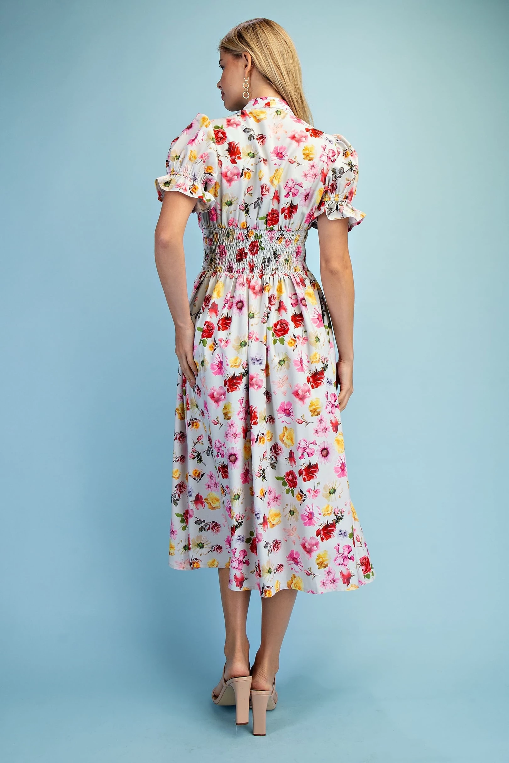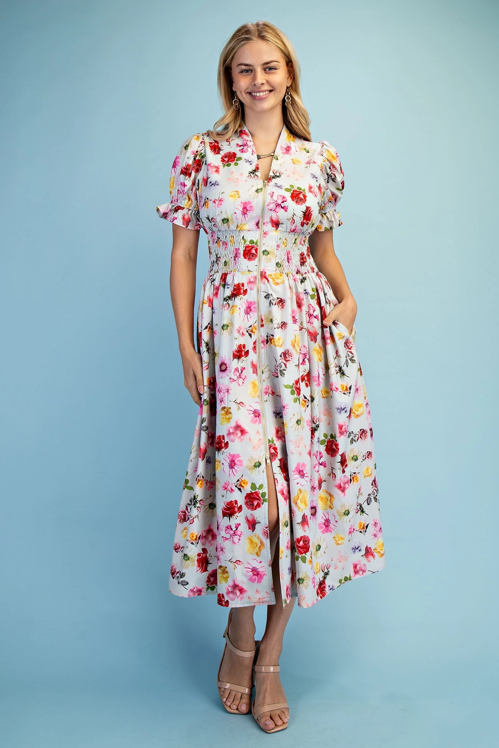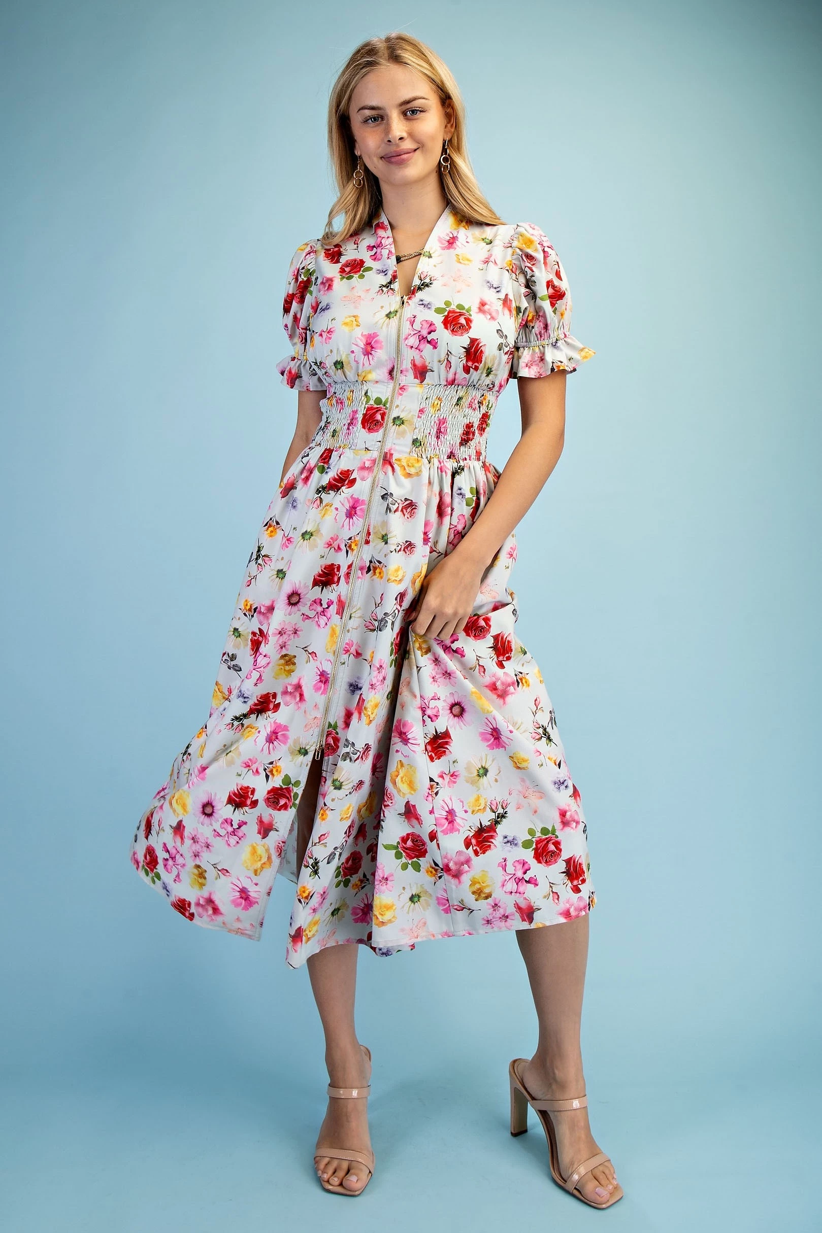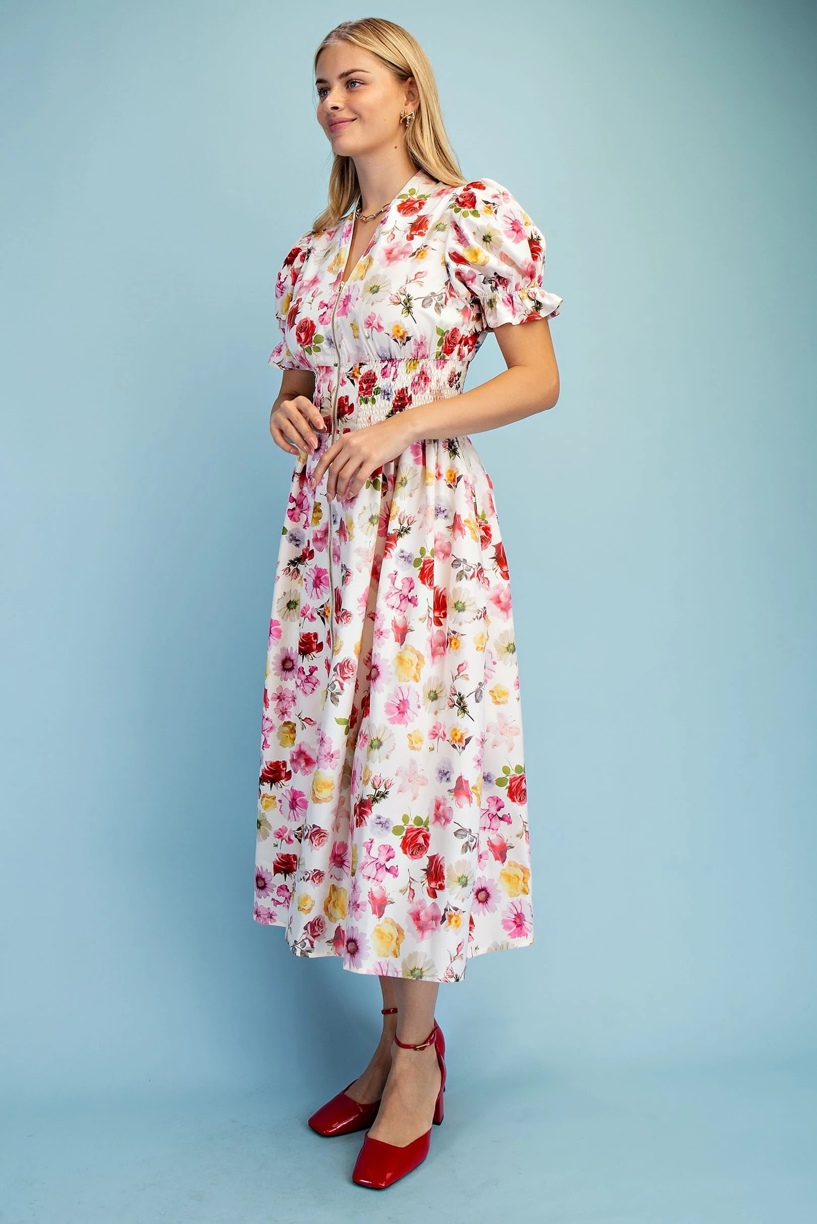 Floral Puff Sleeve Midi Dress with a Front Zipper and Smocked Waist. The Dress is Lined