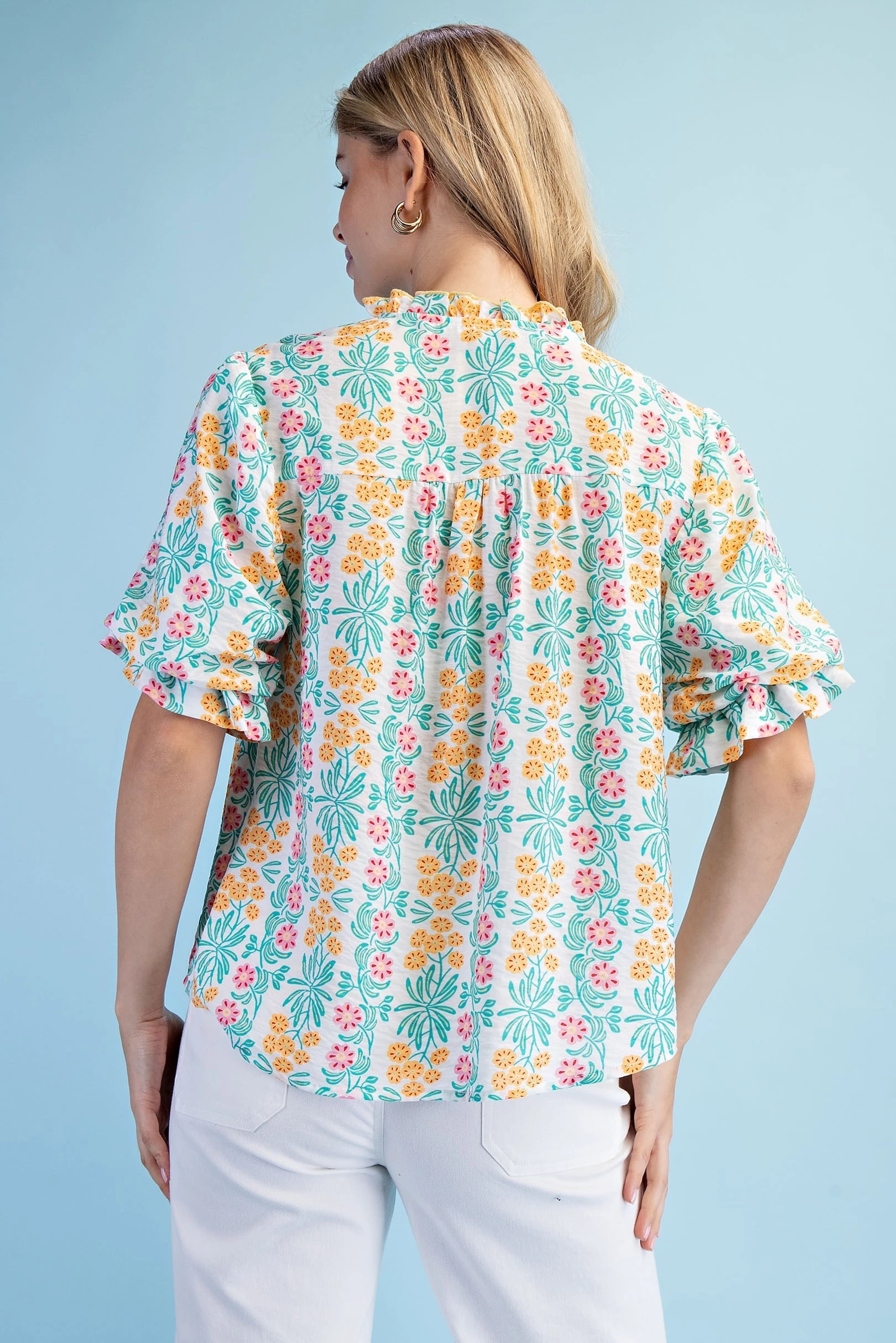 Floral Print Short Puff Sleeve Blouse with Smocking Details. The Top is Lined