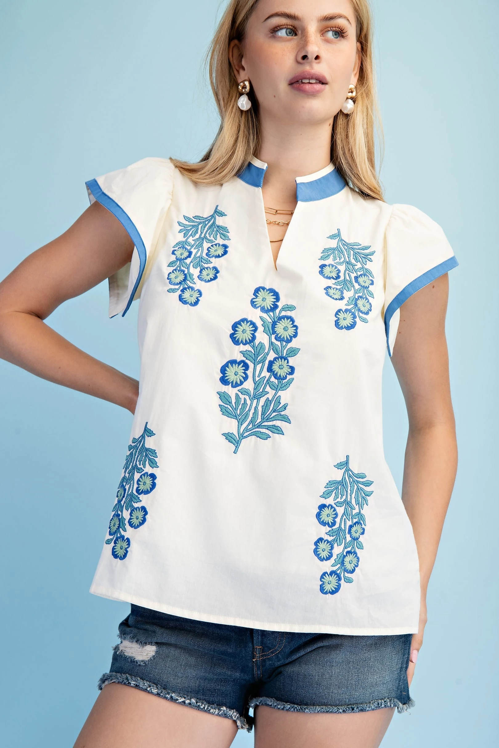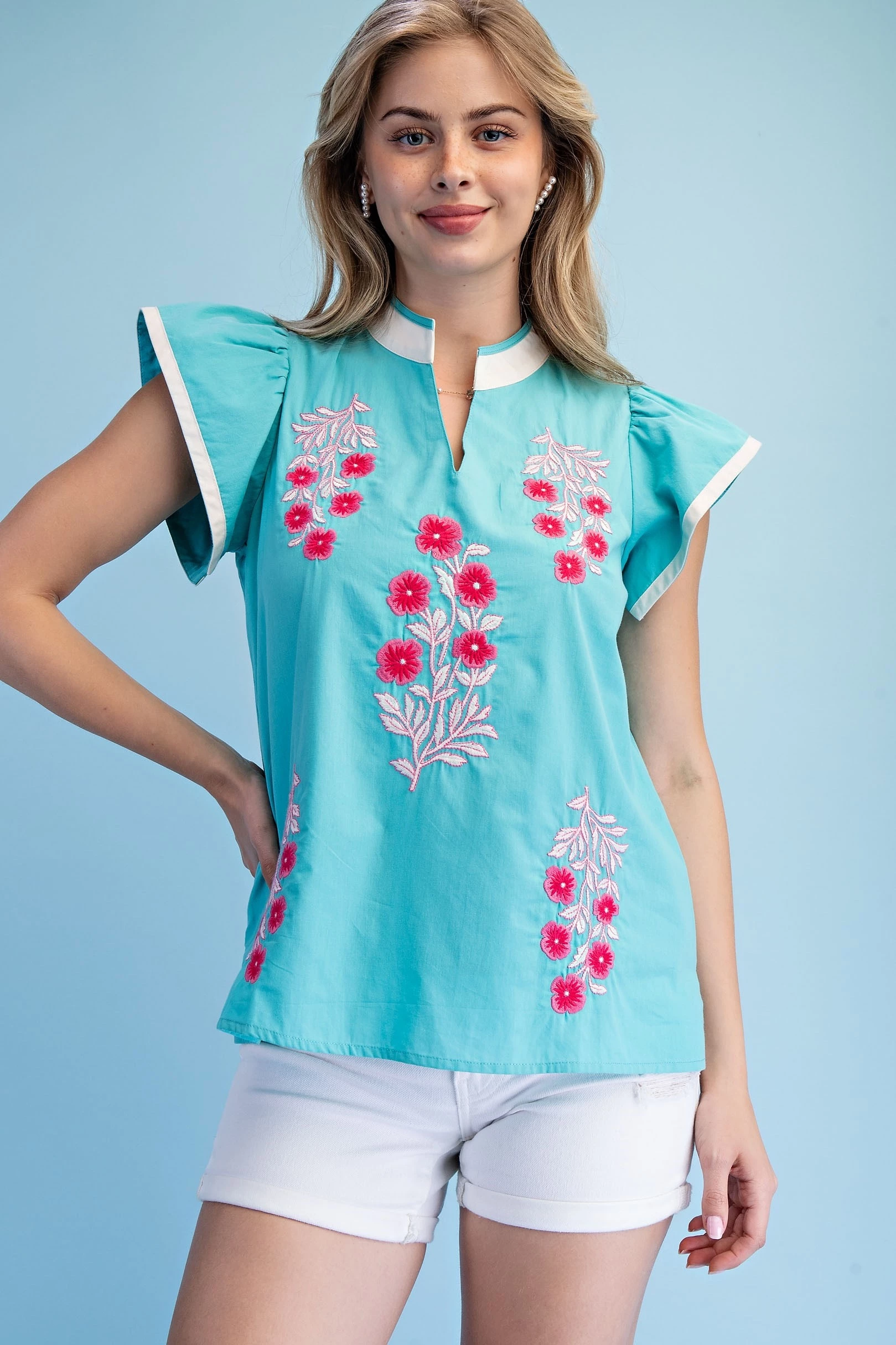 Floral Mock-Neck Top with Contrasting Stripe Accents and Decorative Trim