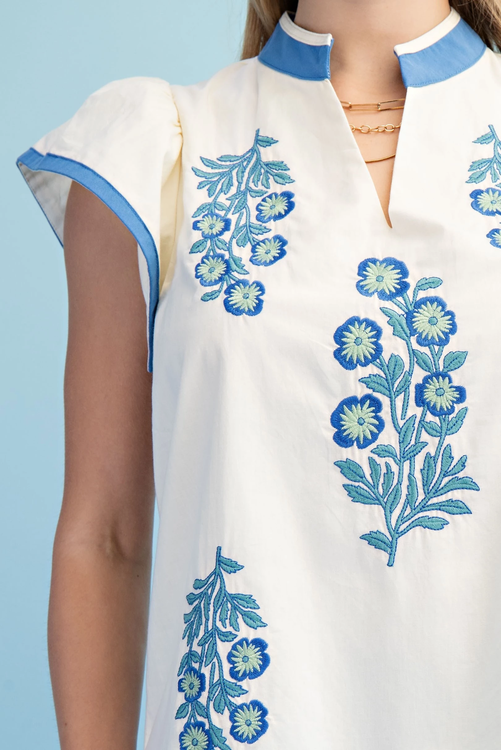 Linen V-Neck Mini Dress with Contrasting and Embroidered AppliquΓ© Design Details. The Dress is Lined