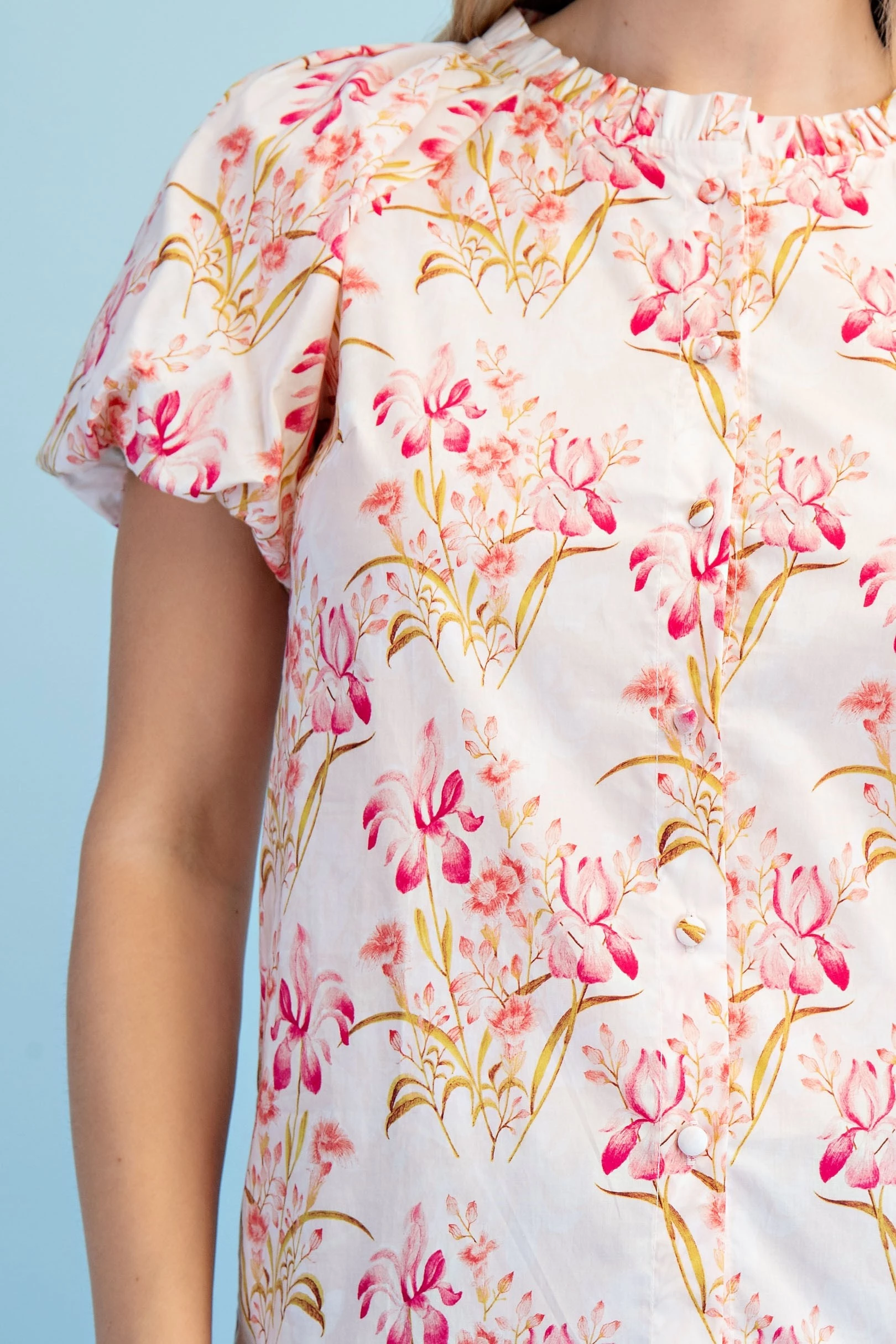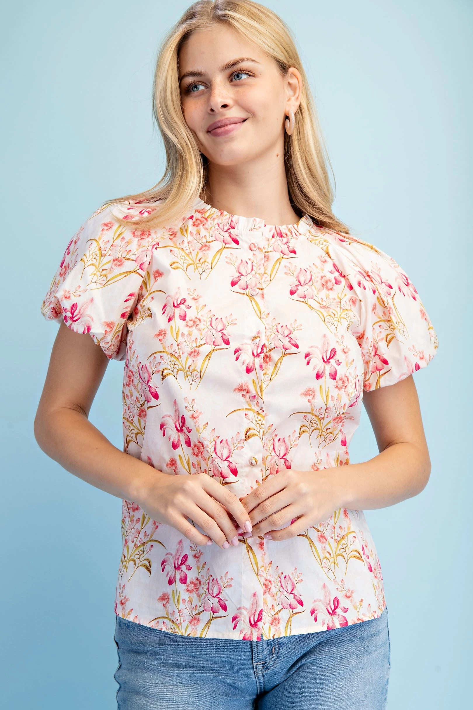 Floral Print Button Down Blouse with Short Puff Sleeves and a Ruffled Collar