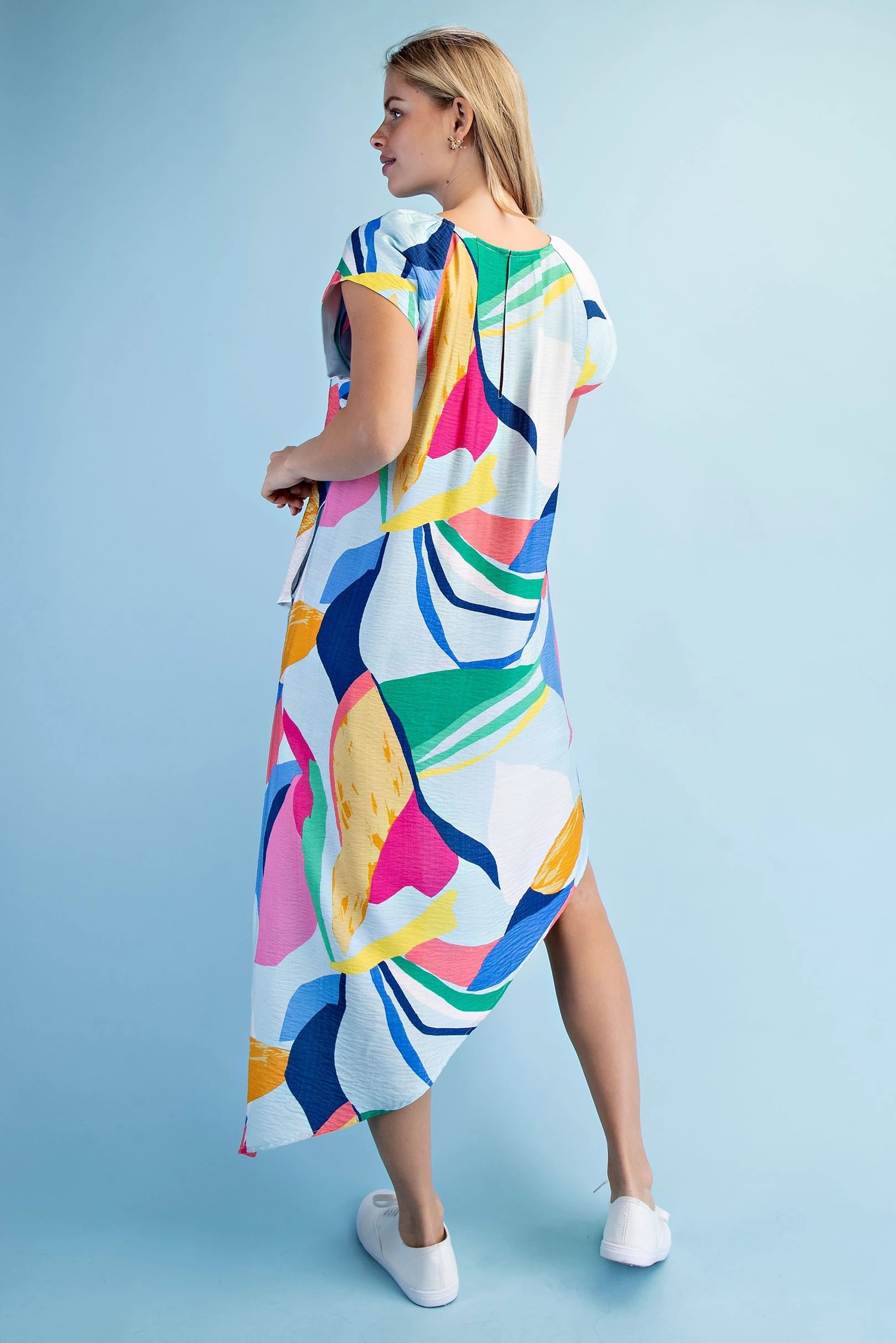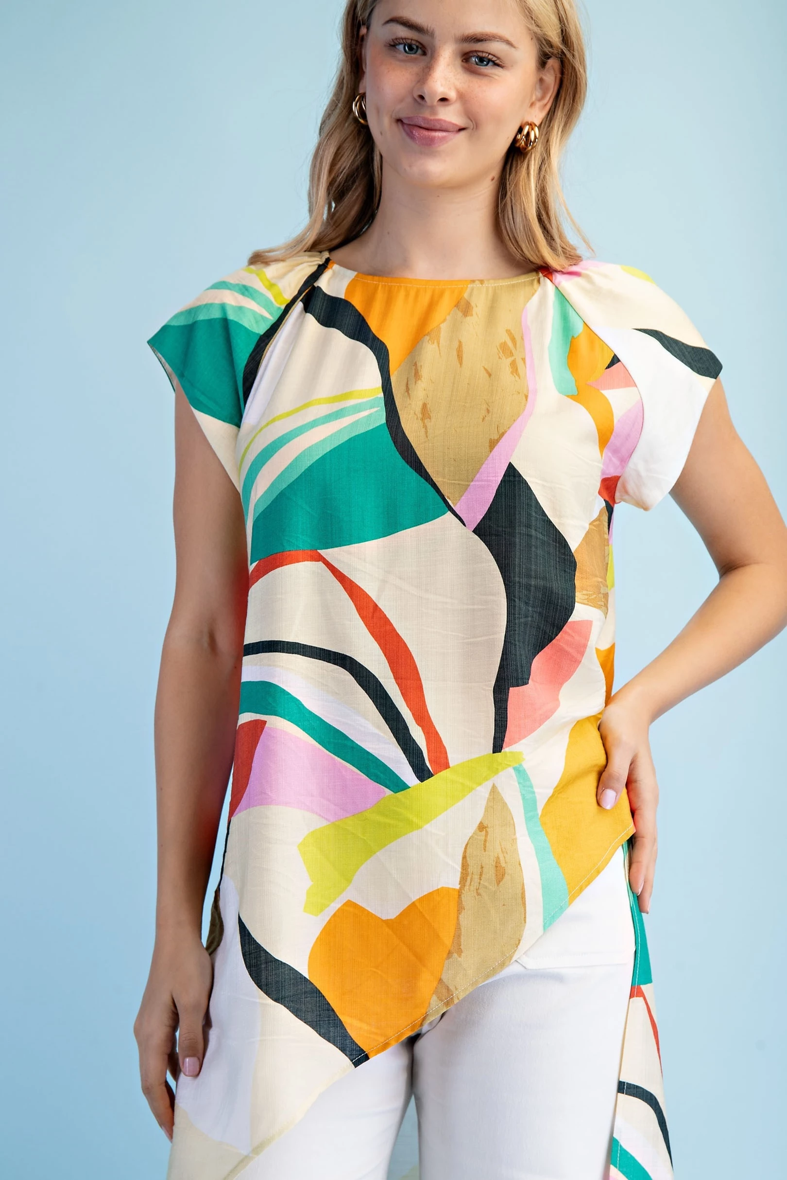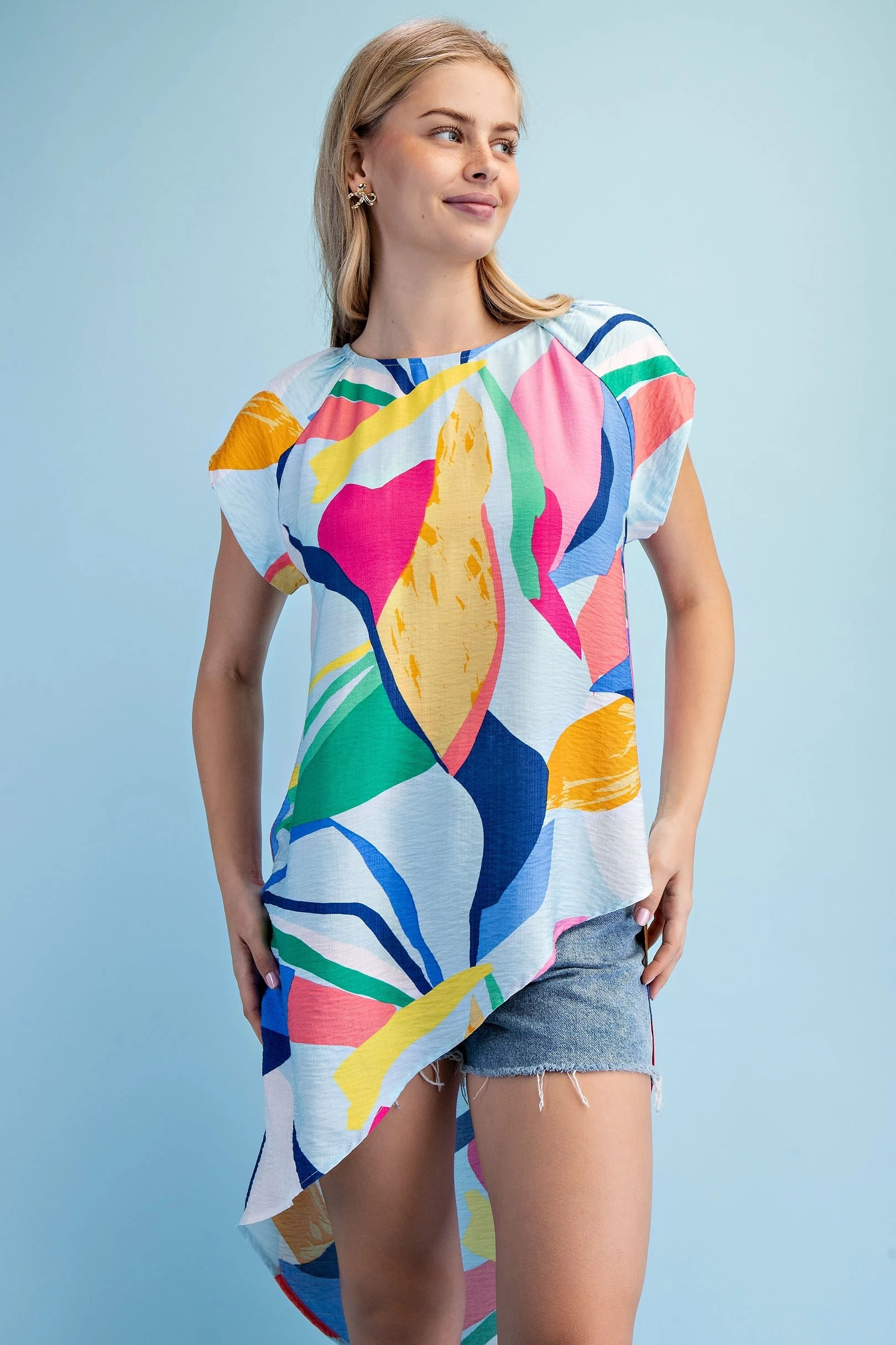 Bright Abstract Asymmetrical Pull On Top with Short Sleeves and Crewneck