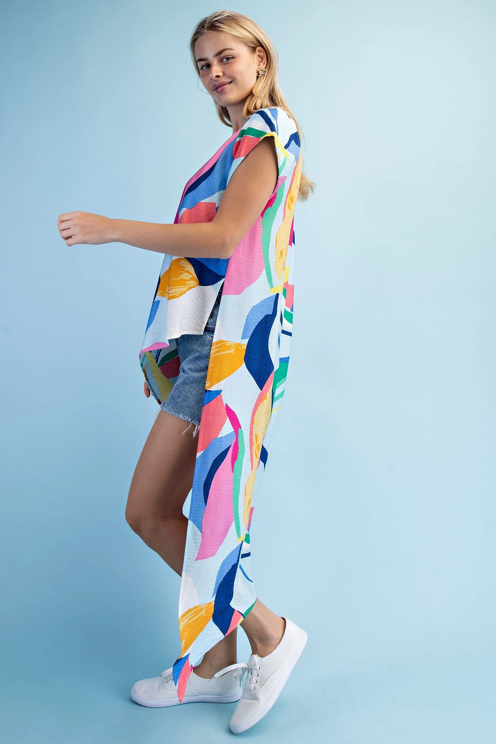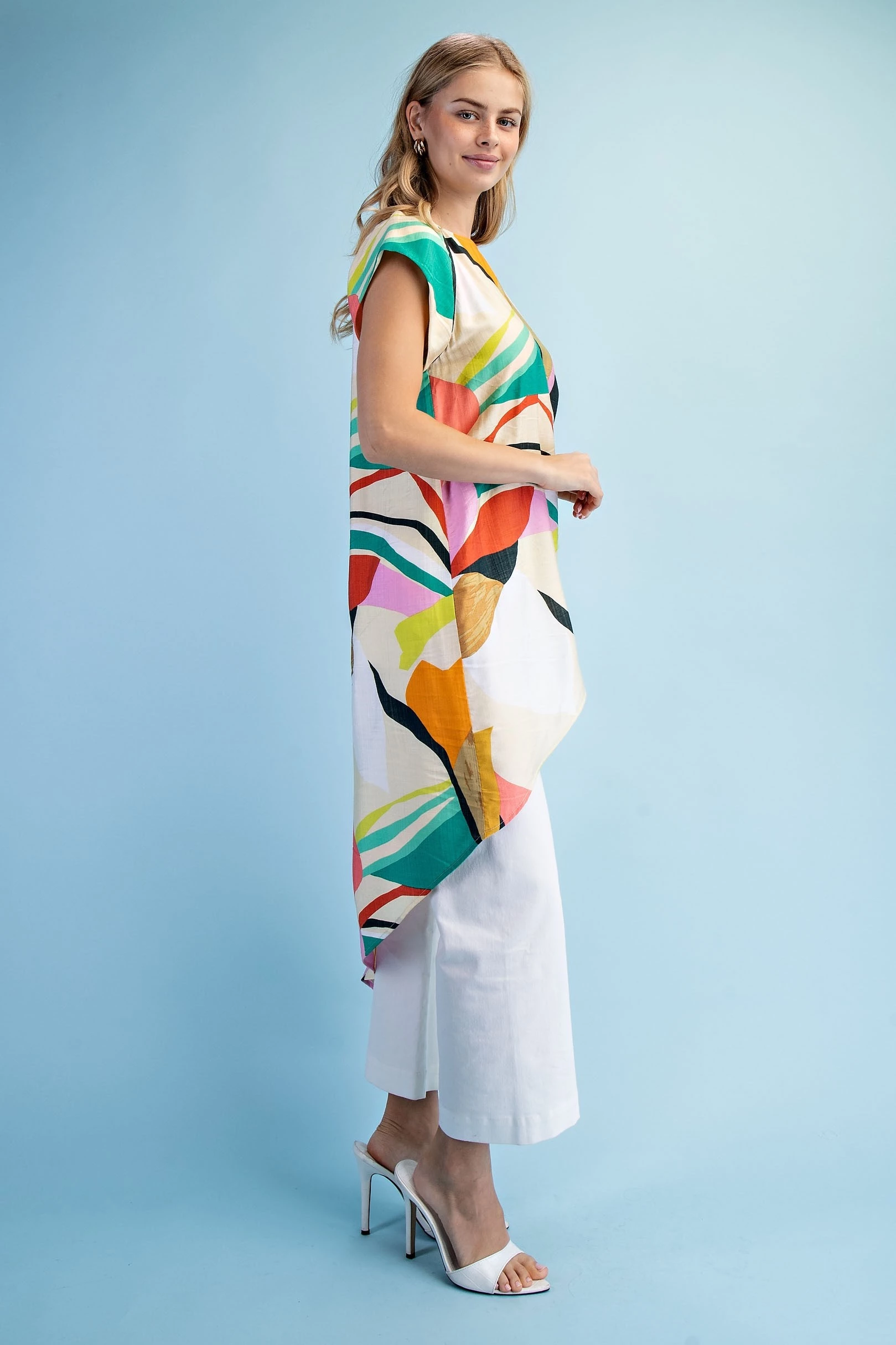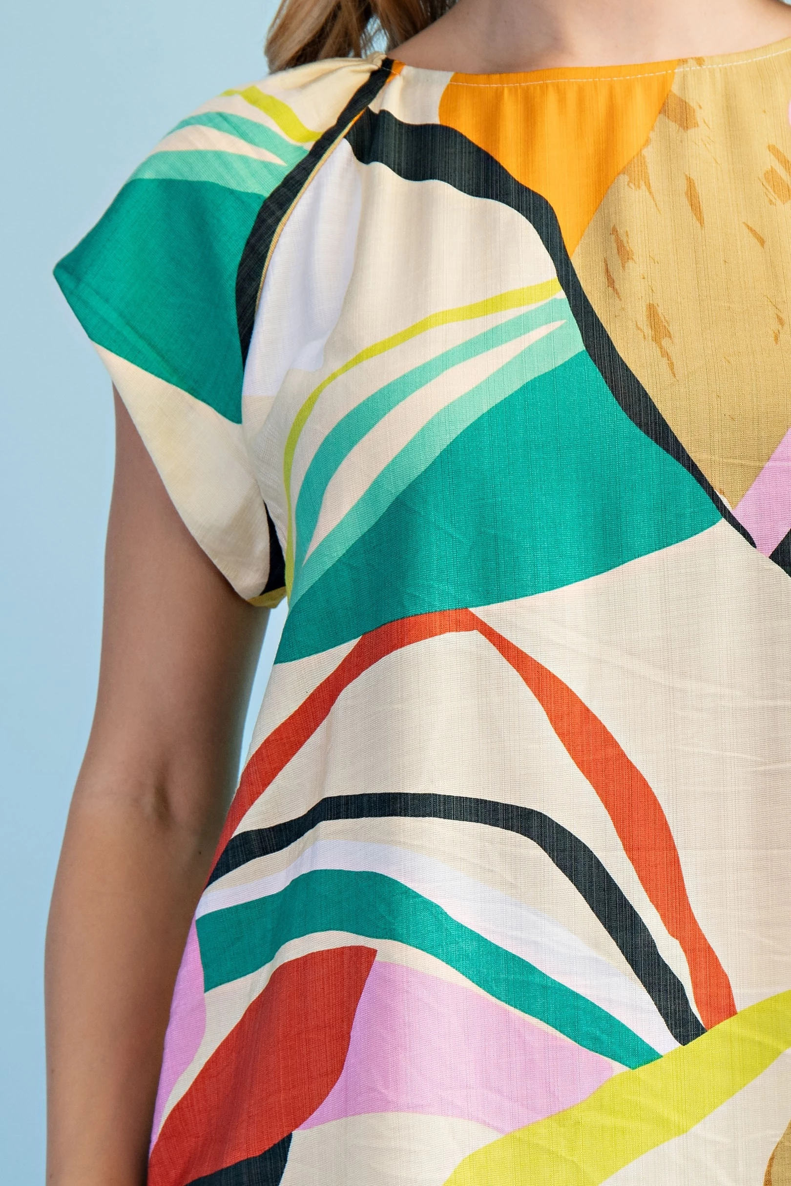 Bright Abstract Asymmetrical Pull On Top with Short Sleeves and Crewneck