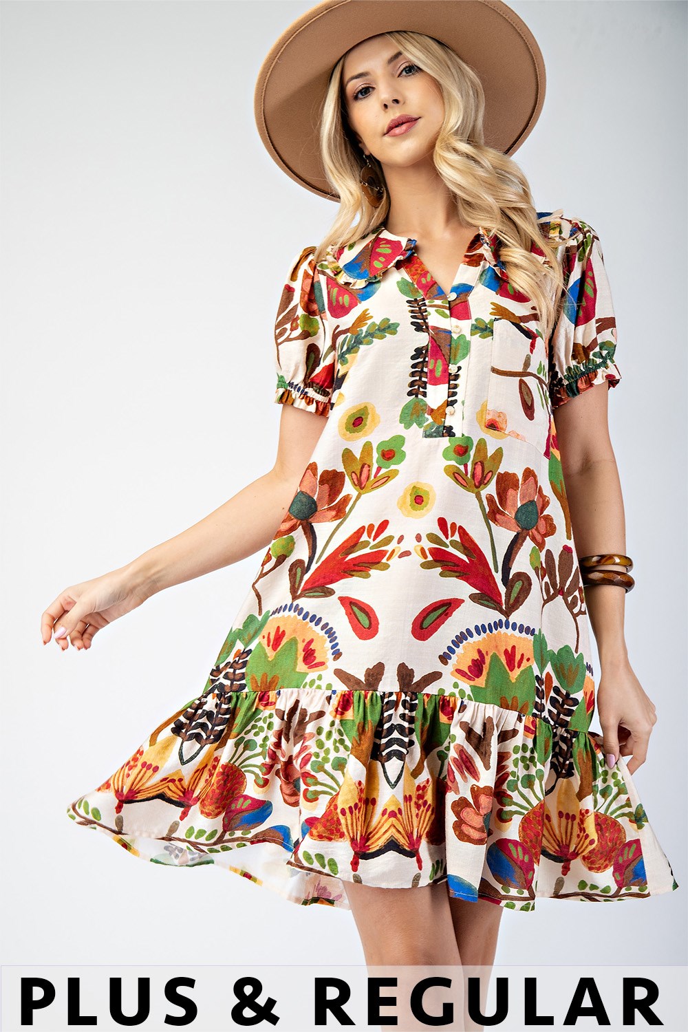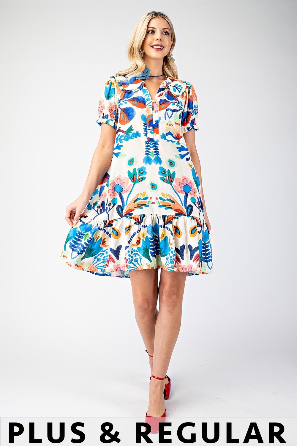 Peter Pan Collar Button Down Mini Dress with Short Puff Sleeves