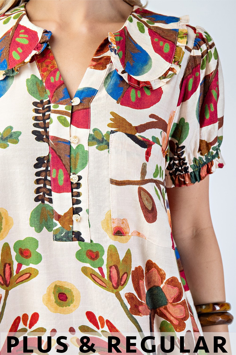 Printed Button Down Top with 3/4 Length Gathered Balloon Sleeves